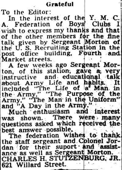 1919 Franklin Pierce Alloway and his wife, the former Sarah Lavinia Griffee resided at 645 Willard Street when their first child, my mother, was born on November 24, 1919. Her name was Sarah Lavinia Alloway. They resided at 815 Market Street when their second child, Eleanor Jennie Alloway, was born on December 10, 1921. They lived at 718 Federal Street when their third child, Florence Mae was born on February 23, 1923. They next resided at 513 South 6th Street when their fourth child, Franklin Charles "Bud" Alloway was born on November 7, 1924. They lived at 608 Carmen Street when their fifth child, William Robert Alloway was born, December 31, 1926. The family had moved to 436 Benson Street, when their sixth child, Anna Louse Alloway came on August 5, 1928. When the seventh and last child, Mary Elizabeth was born on August 30, 1930, the family was living at 422 Main Street. The reason given for the continual moving was because of the increase in the family size requiring larger accommodations. Jim