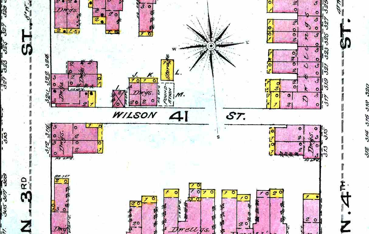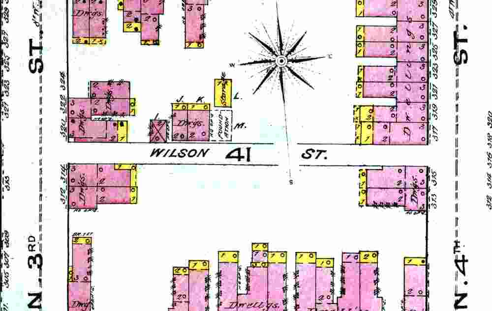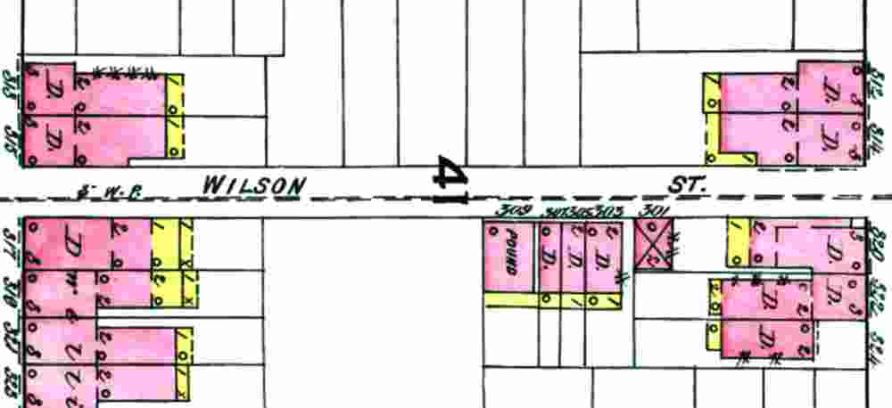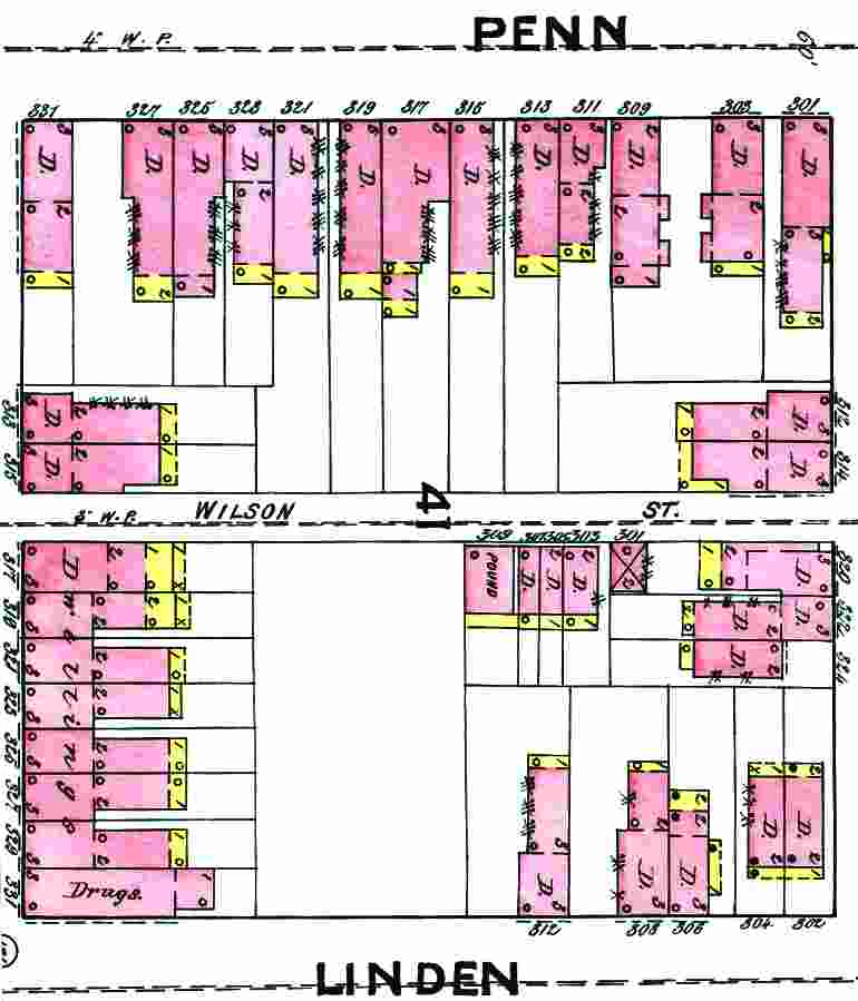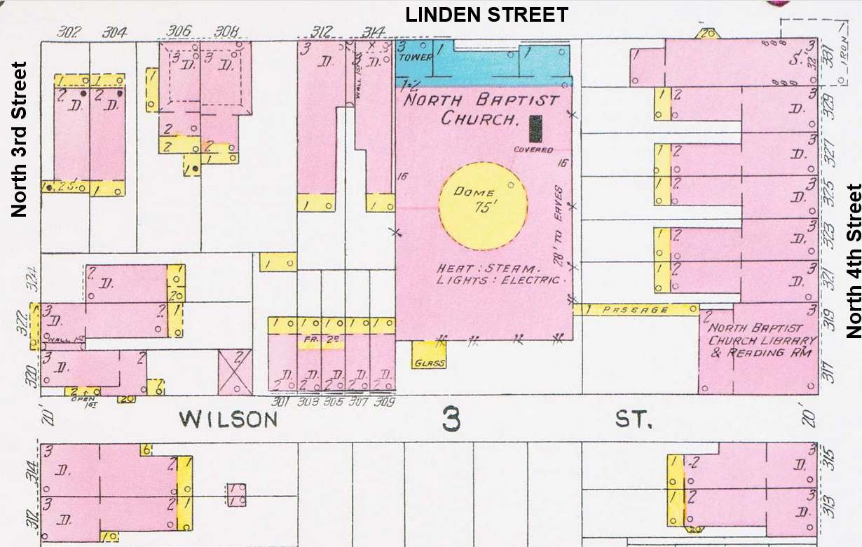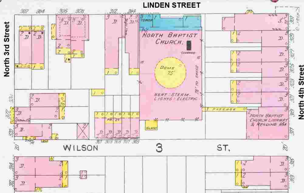 WILSON STREET ran west to east from 320 North 3rd Street for one block, between Linden and Penn Streets, ending at North 4th Street. Wilson Street appears in City Directories as early as 1876. The street is not listed in the 1872 City Directory. There were two homes on Wilson Street in 1885. By 1878 there were three homes and tow other buildings. The 1906 Sanborn map shows 5 homes, numbering 301, 303, 305, 307 and 309, and the rear yard of North Baptist Church lay on Wilson Street. The North Baptist Church Library and Reading Room was located at the Northwest corner of North 4th and Wilson Street. There were still three occupied homes on Wilson Street in 1947. Wilson Street was swallowed up in the 1960s when Rutgers began the process of acquiring all of the land that lay between North 3rd and North 5th Streets, and between Lawrence and Pearl Street. Cole Street, which lay parallel to Wilson Street between Linden and Pearl Streets, also was erased at that time. |