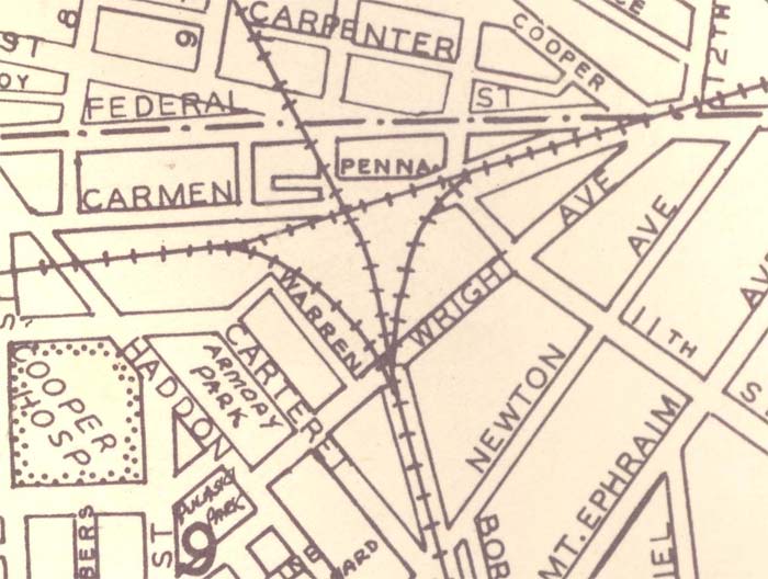 WRIGHT AVENUE first appeared in Camden City Directories after 1891 and before 1906. The street originally ran northeast from 400 Haddon Avenue, more or less opposite of Camden's City Hall, across Haddon Avenue at 400 Haddon, crossing Carteret Street, Warren Avenue, the railroad line which is has become the PATCO high-speedline, on through to Federal Street, opposite North 12th Street. Since the construction of Interstate 676, Wright Avenue now begins in what was it's 800 Block, at 840 Wright Avenue, the old National Guard Armory which now houses Camden's Public Works department. |