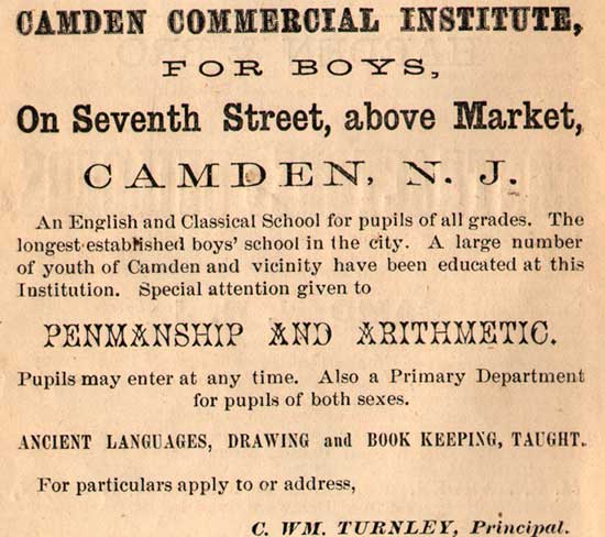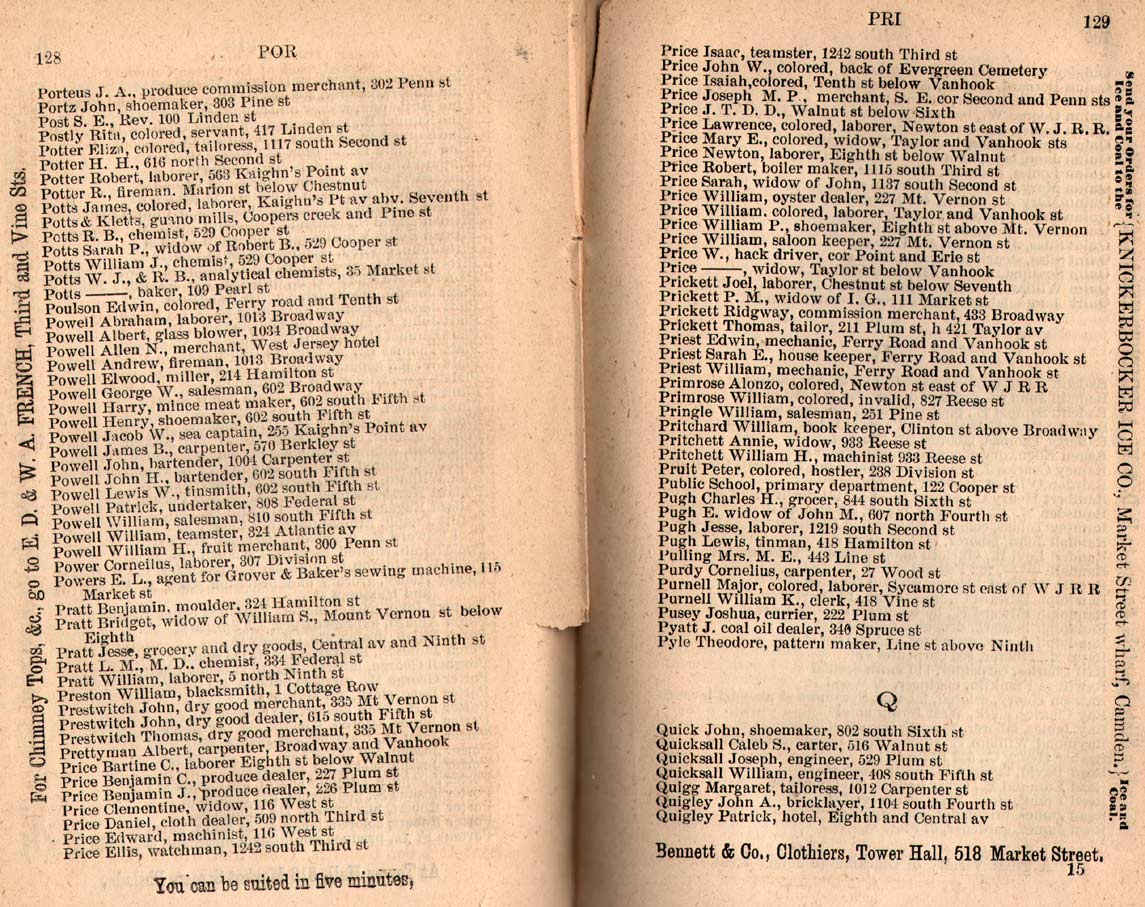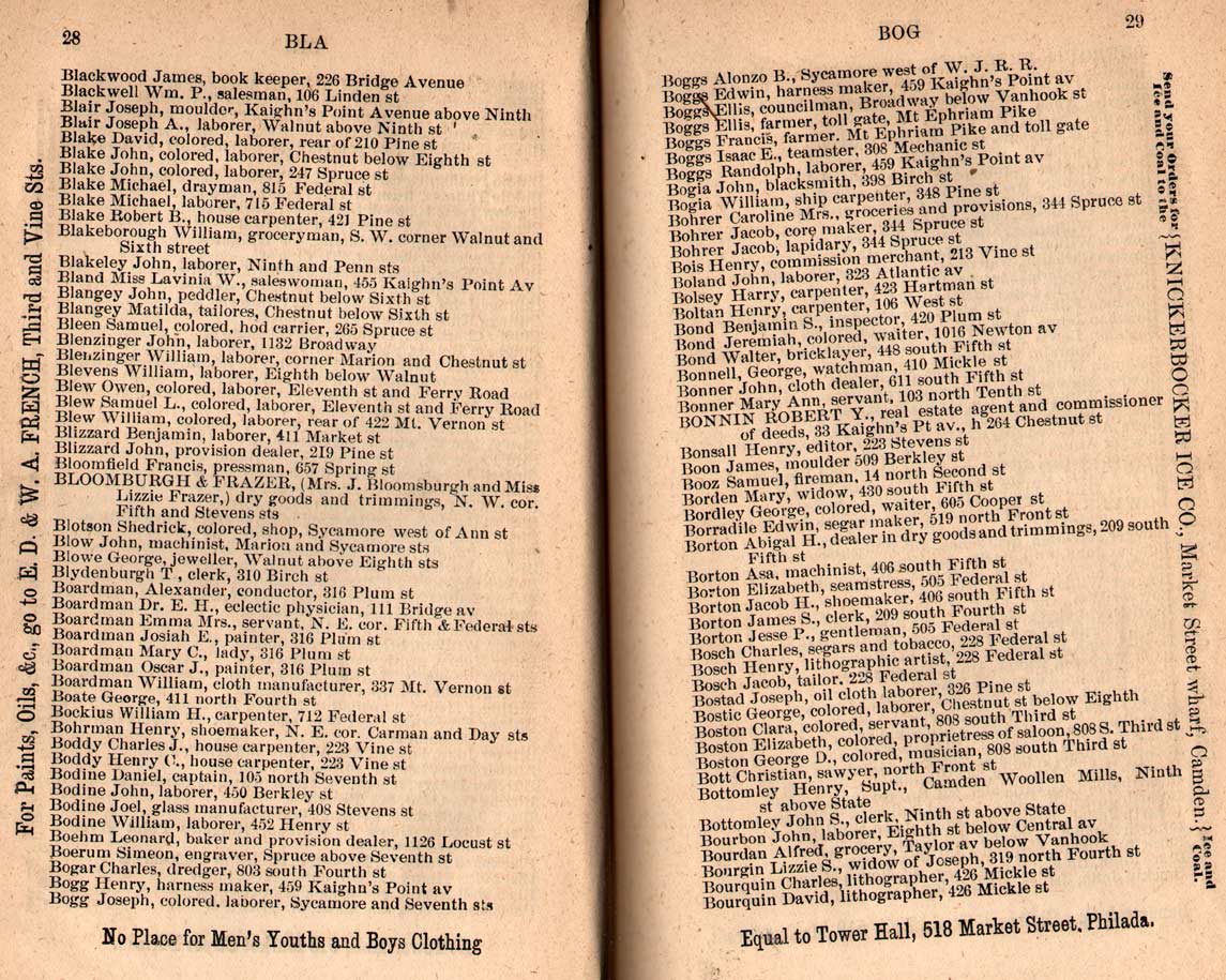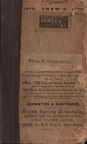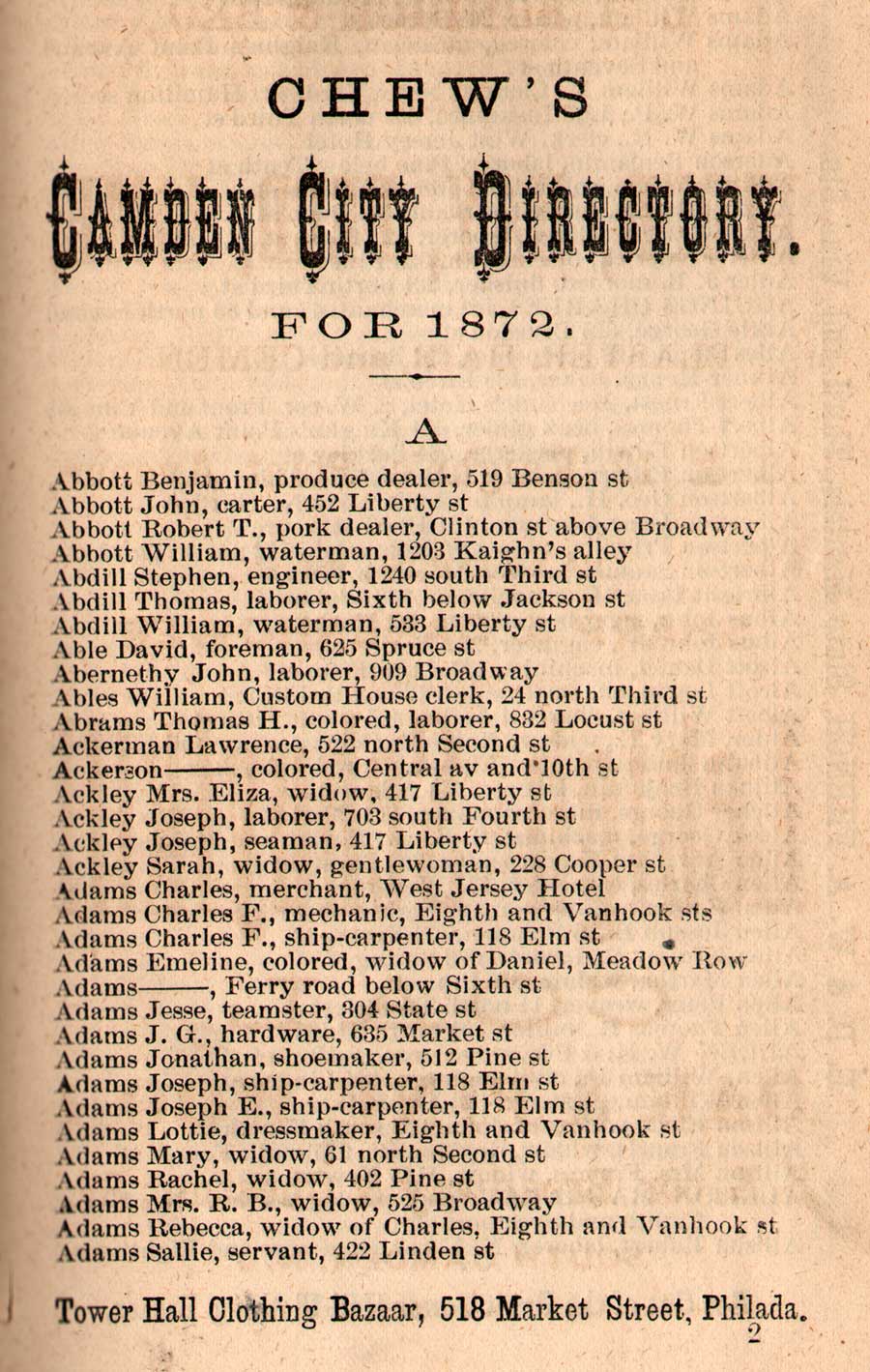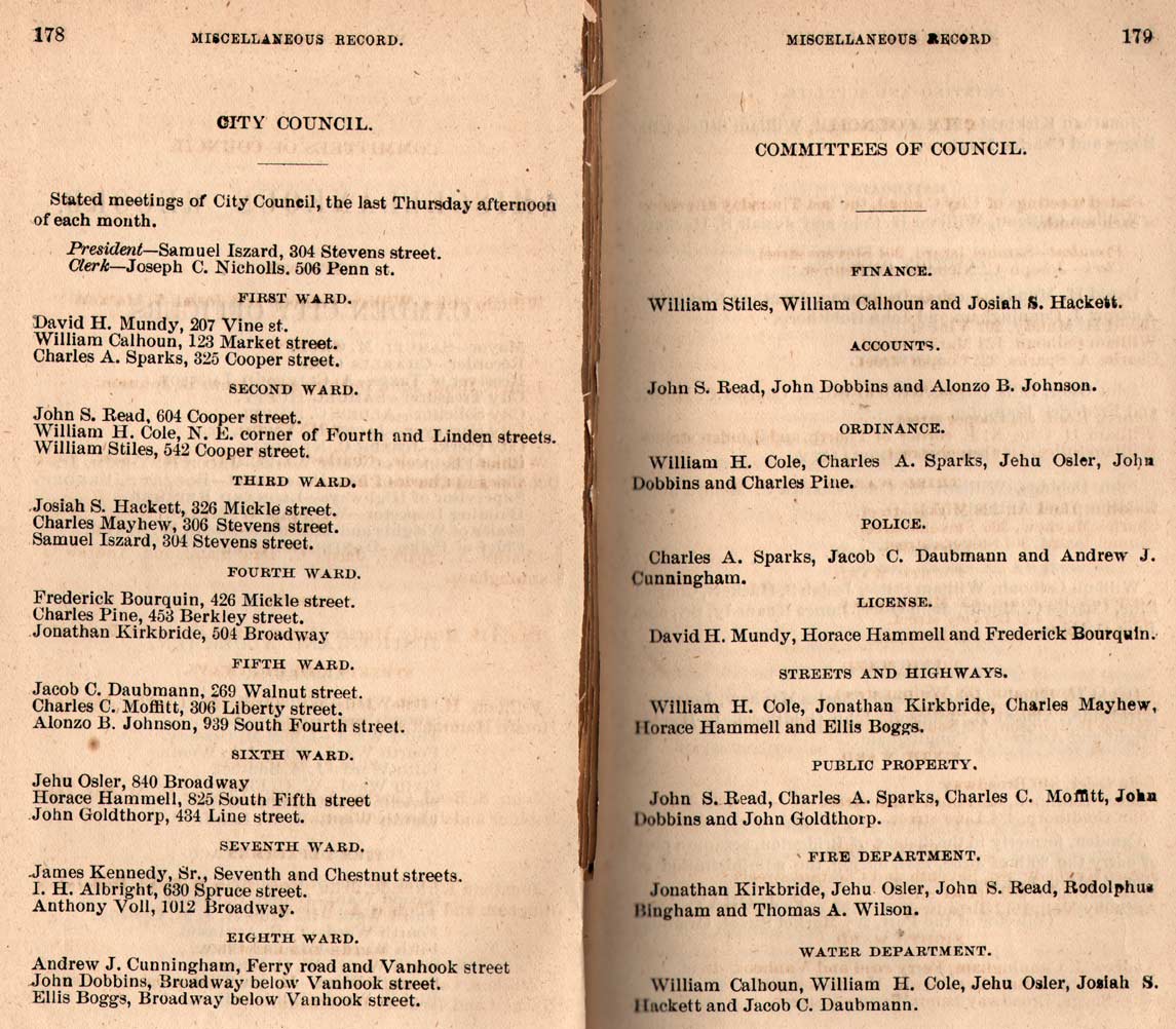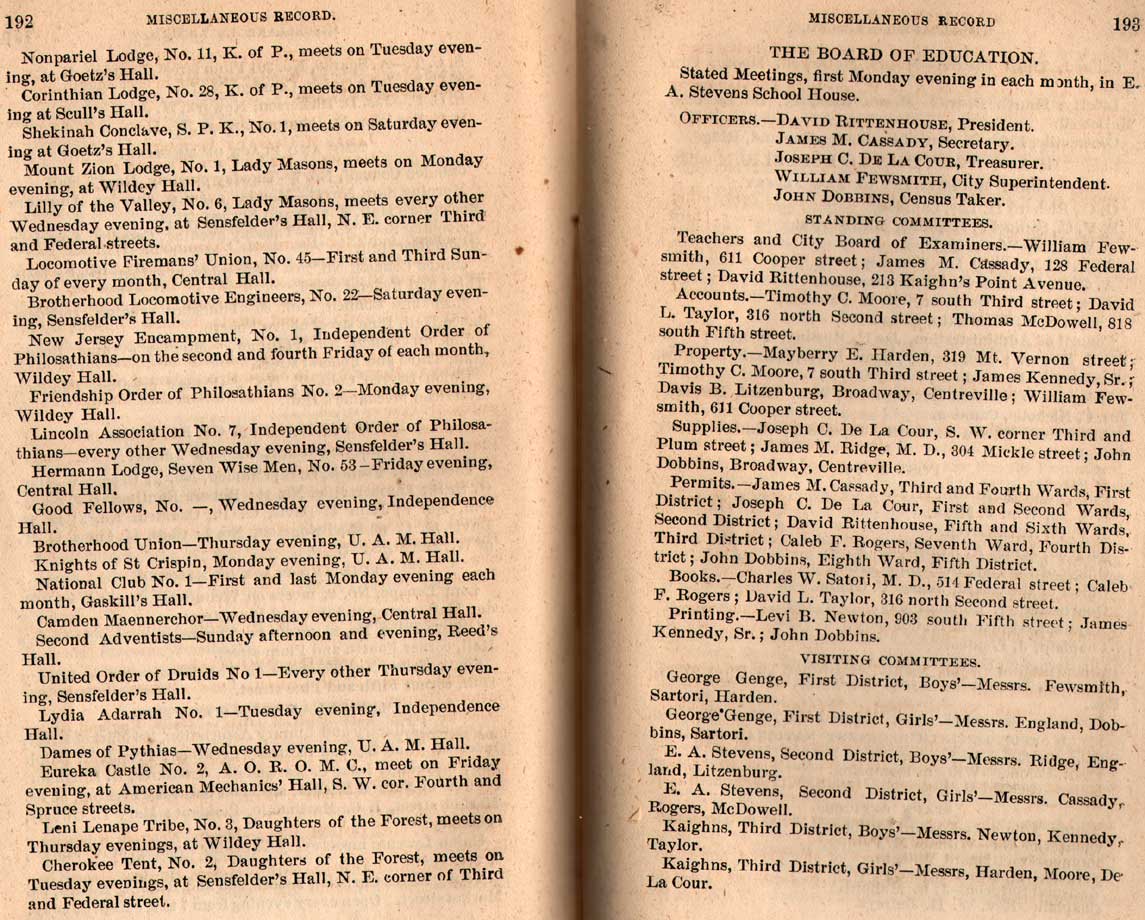 DAVID RITTENHOUSE, President. STANDING COMMITTEES. Teachers and City Board of Examiners.- William Fewsmith, 611 Cooper street; James M. Cassady, 128 Federal street; David Rittenhouse, 213 Kaighn's Point Avenue. Accounts.-Timothy C. Moore, 7 South Third Street; David L. Taylor, 316 North Second Street; Thomas McDoweIl, 818 South Fifth Street. Property.-Mayberry E. Harden, 319 Mt. Vernon Street; Timothy C. Moore, 7 South Third Street; James Kennedy, Sr., Davis B. Litzenburg, Broadway, Centreville; William Fewsmith, 611 Cooper street. Supplies.-Joseph C. De La Cour, S. W. corner Third and Plum Street; James M. Ridge, M.D., 304 Mickle Street; John Dobbins, Broadway, Centreville. Permits.-James M. Cassady, Third and Fourth Wards, First District; Joseph C. De La Cour, First and Second Wards,. Second District; David Rittenhouse, Fifth and Sixth Wards, Third District; Caleb F. Rogers, Seventh Ward, Fourth District; John Dobbins, Eighth Ward, Fifth District. Books.-Charles W. Satori, M. D., 514 Federal Street; Caleb F. Rogers; David L. Taylor, 316 North Second Street. Printing.-Levi B. Newton, 903 South Fifth Street; James Kennedy, Sr.; John Dobbins. |