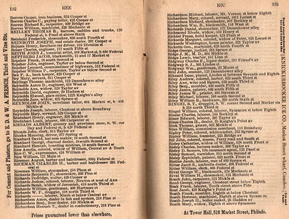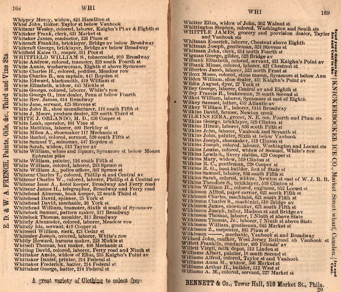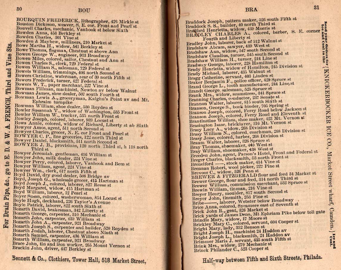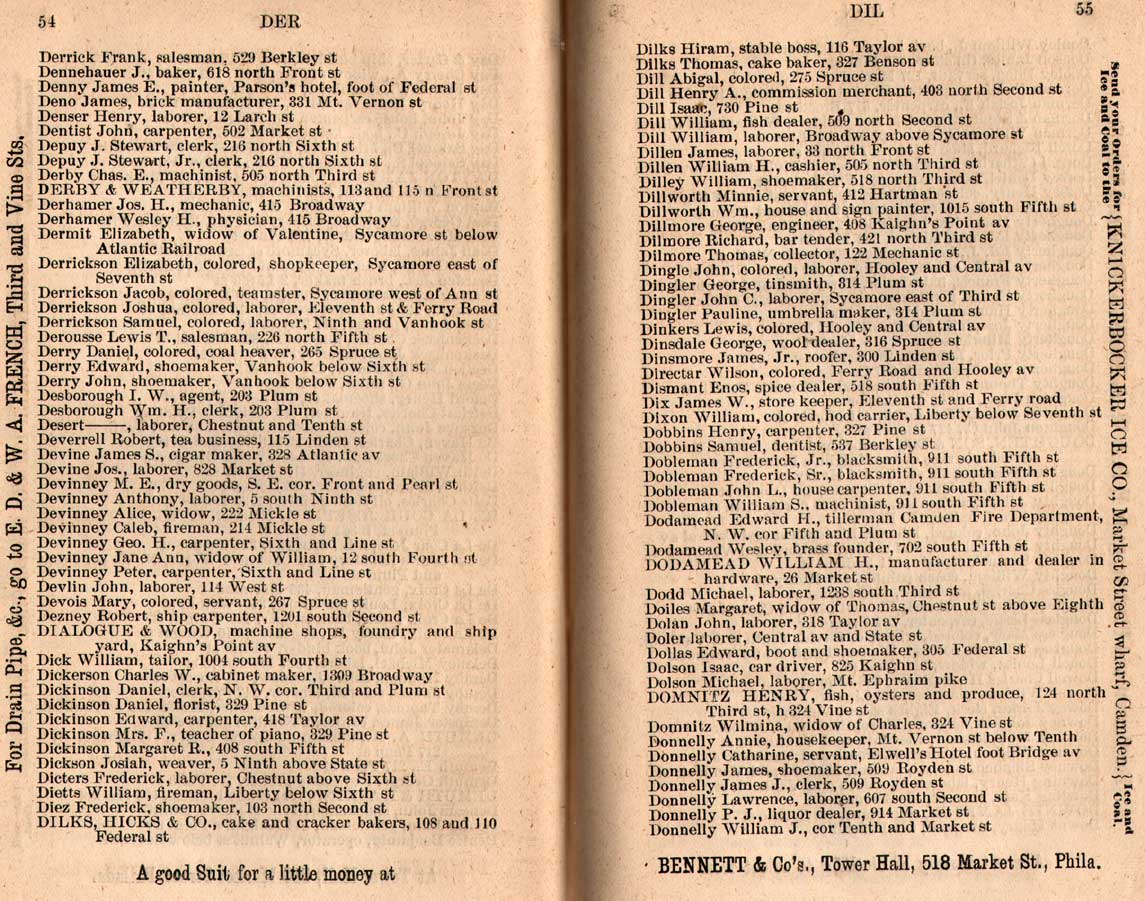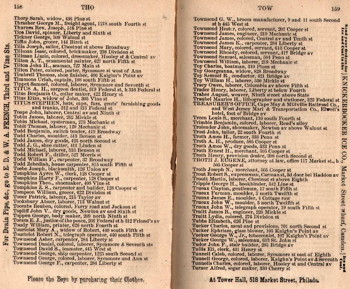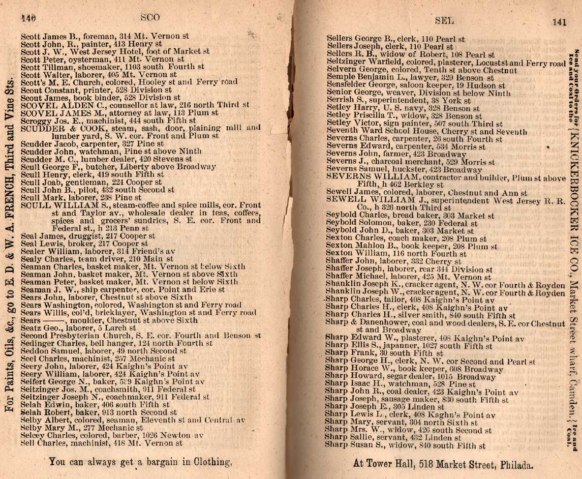 DAVID RITTENHOUSE, President. STANDING COMMITTEES. Teachers and City Board of Examiners.- William Fewsmith, 611 Cooper street; James M. Cassady, 128 Federal street; David Rittenhouse, 213 Kaighn's Point Avenue. Accounts.-Timothy C. Moore, 7 South Third Street; David L. Taylor, 316 North Second Street; Thomas McDoweIl, 818 South Fifth Street. Property.-Mayberry E. Harden, 319 Mt. Vernon Street; Timothy C. Moore, 7 South Third Street; James Kennedy, Sr., Davis B. Litzenburg, Broadway, Centreville; William Fewsmith, 611 Cooper street. Supplies.-Joseph C. De La Cour, S. W. corner Third and Plum Street; James M. Ridge, M.D., 304 Mickle Street; John Dobbins, Broadway, Centreville. Permits.-James M. Cassady, Third and Fourth Wards, First District; Joseph C. De La Cour, First and Second Wards,. Second District; David Rittenhouse, Fifth and Sixth Wards, Third District; Caleb F. Rogers, Seventh Ward, Fourth District; John Dobbins, Eighth Ward, Fifth District. Books.-Charles W. Satori, M. D., 514 Federal Street; Caleb F. Rogers; David L. Taylor, 316 North Second Street. Printing.-Levi B. Newton, 903 South Fifth Street; James Kennedy, Sr.; John Dobbins. |