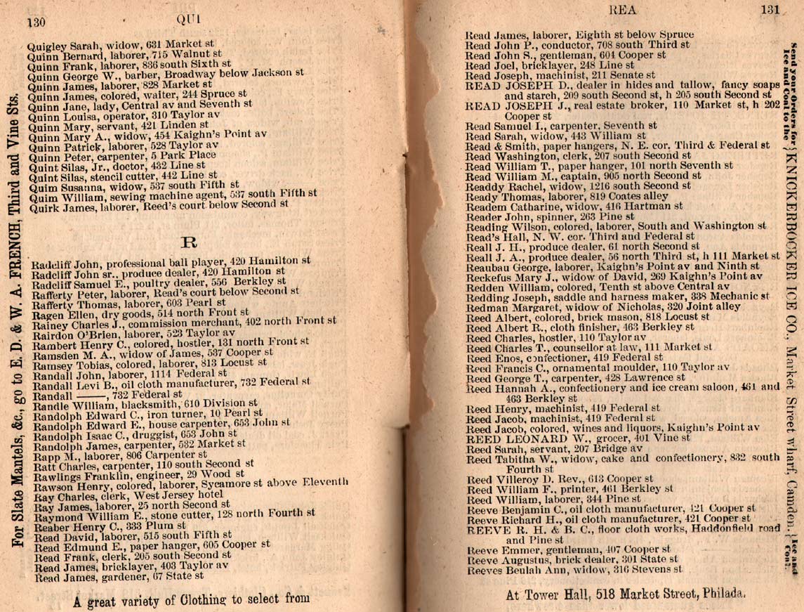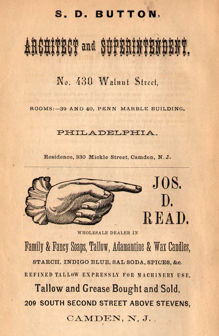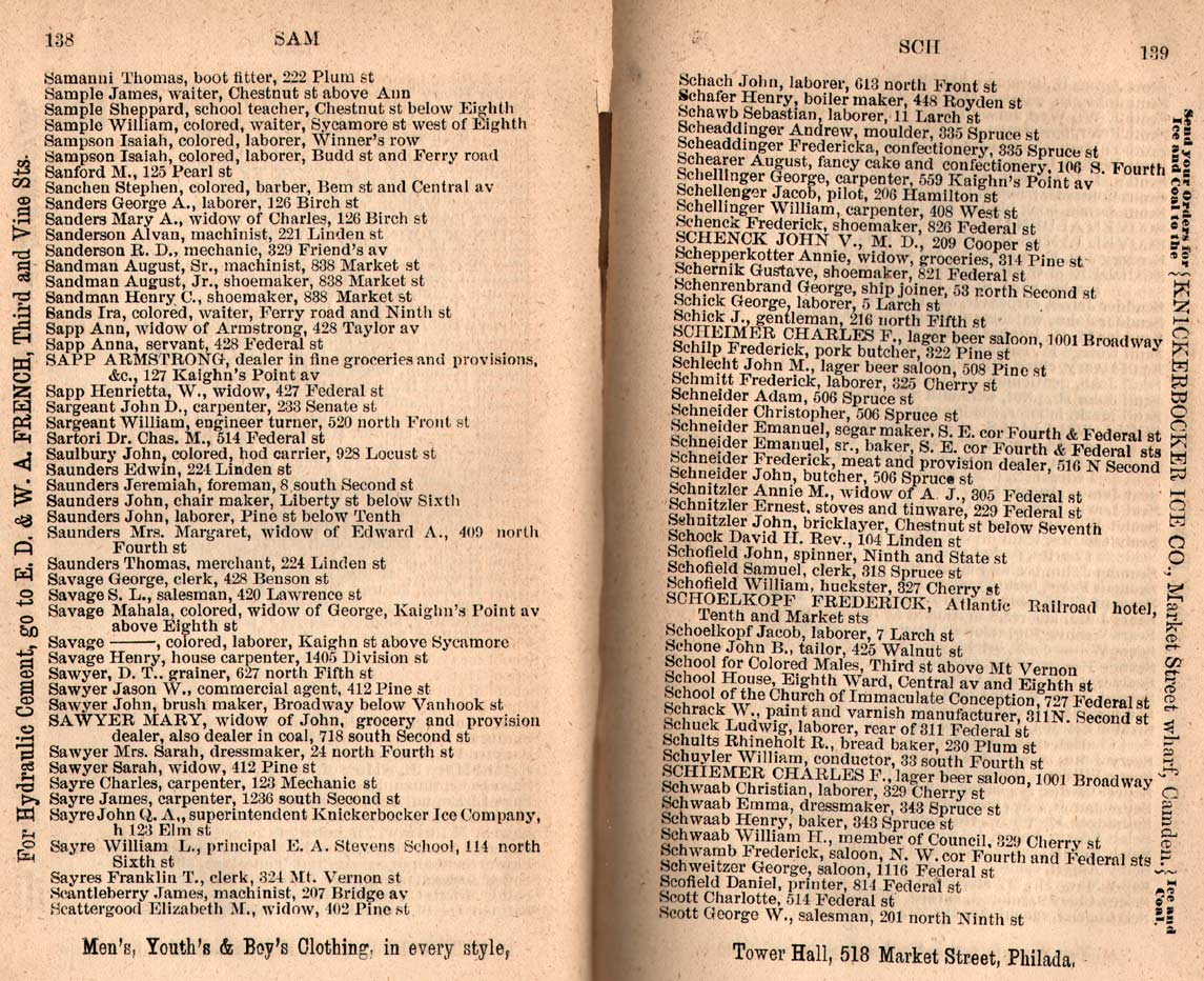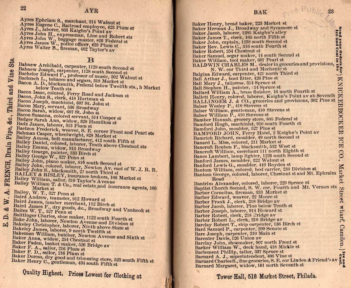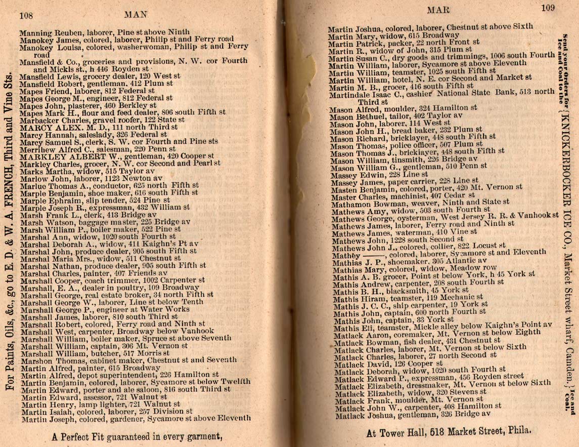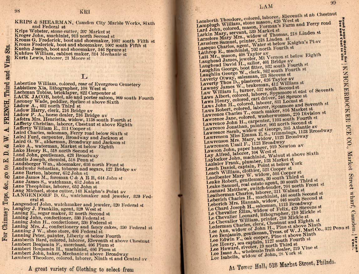 DAVID RITTENHOUSE, President. STANDING COMMITTEES. Teachers and City Board of Examiners.- William Fewsmith, 611 Cooper street; James M. Cassady, 128 Federal street; David Rittenhouse, 213 Kaighn's Point Avenue. Accounts.-Timothy C. Moore, 7 South Third Street; David L. Taylor, 316 North Second Street; Thomas McDoweIl, 818 South Fifth Street. Property.-Mayberry E. Harden, 319 Mt. Vernon Street; Timothy C. Moore, 7 South Third Street; James Kennedy, Sr., Davis B. Litzenburg, Broadway, Centreville; William Fewsmith, 611 Cooper street. Supplies.-Joseph C. De La Cour, S. W. corner Third and Plum Street; James M. Ridge, M.D., 304 Mickle Street; John Dobbins, Broadway, Centreville. Permits.-James M. Cassady, Third and Fourth Wards, First District; Joseph C. De La Cour, First and Second Wards,. Second District; David Rittenhouse, Fifth and Sixth Wards, Third District; Caleb F. Rogers, Seventh Ward, Fourth District; John Dobbins, Eighth Ward, Fifth District. Books.-Charles W. Satori, M. D., 514 Federal Street; Caleb F. Rogers; David L. Taylor, 316 North Second Street. Printing.-Levi B. Newton, 903 South Fifth Street; James Kennedy, Sr.; John Dobbins. |