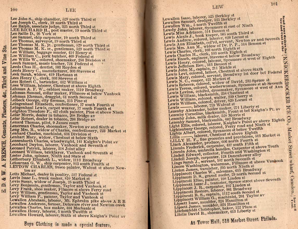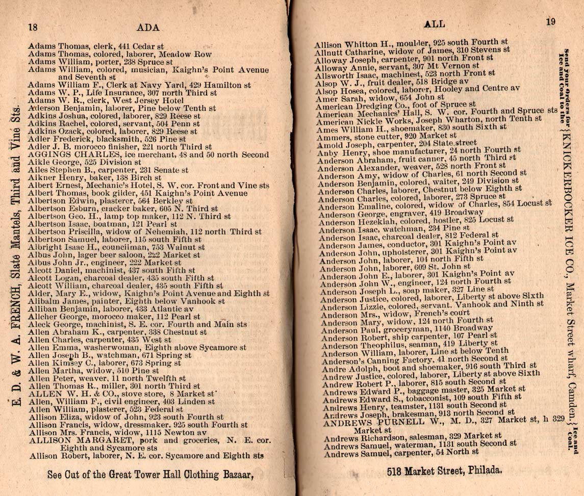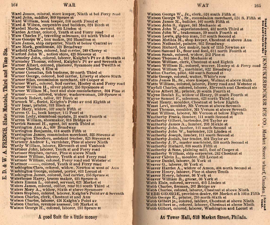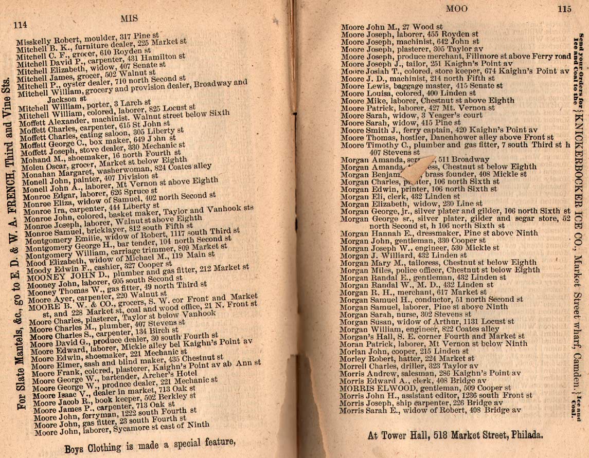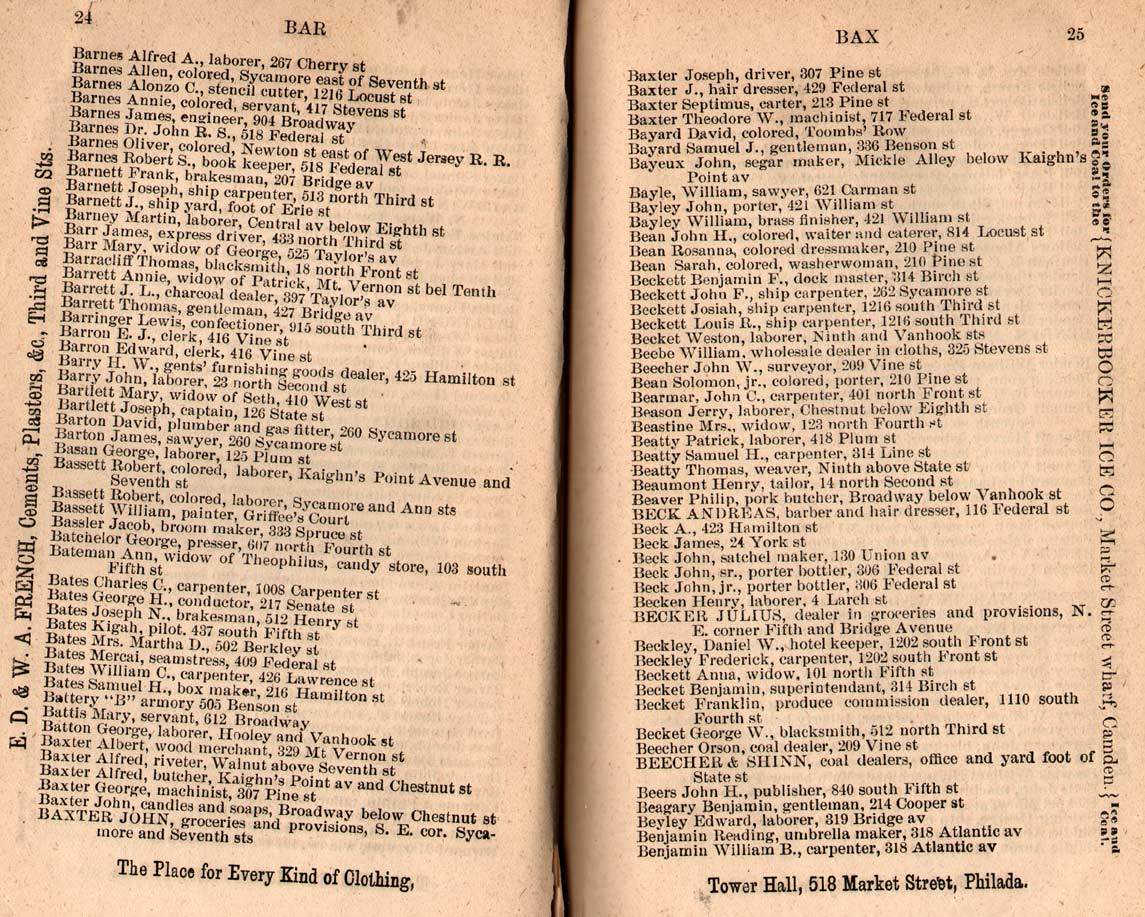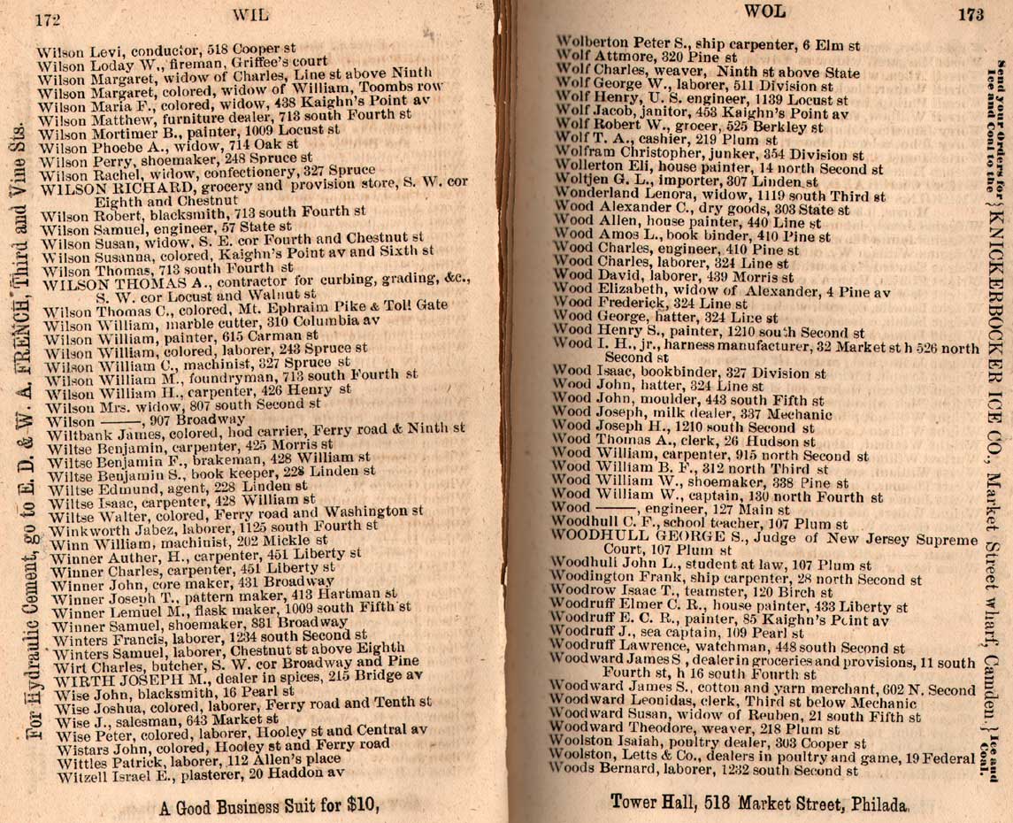 DAVID RITTENHOUSE, President. STANDING COMMITTEES. Teachers and City Board of Examiners.- William Fewsmith, 611 Cooper street; James M. Cassady, 128 Federal street; David Rittenhouse, 213 Kaighn's Point Avenue. Accounts.-Timothy C. Moore, 7 South Third Street; David L. Taylor, 316 North Second Street; Thomas McDoweIl, 818 South Fifth Street. Property.-Mayberry E. Harden, 319 Mt. Vernon Street; Timothy C. Moore, 7 South Third Street; James Kennedy, Sr., Davis B. Litzenburg, Broadway, Centreville; William Fewsmith, 611 Cooper street. Supplies.-Joseph C. De La Cour, S. W. corner Third and Plum Street; James M. Ridge, M.D., 304 Mickle Street; John Dobbins, Broadway, Centreville. Permits.-James M. Cassady, Third and Fourth Wards, First District; Joseph C. De La Cour, First and Second Wards,. Second District; David Rittenhouse, Fifth and Sixth Wards, Third District; Caleb F. Rogers, Seventh Ward, Fourth District; John Dobbins, Eighth Ward, Fifth District. Books.-Charles W. Satori, M. D., 514 Federal Street; Caleb F. Rogers; David L. Taylor, 316 North Second Street. Printing.-Levi B. Newton, 903 South Fifth Street; James Kennedy, Sr.; John Dobbins. |