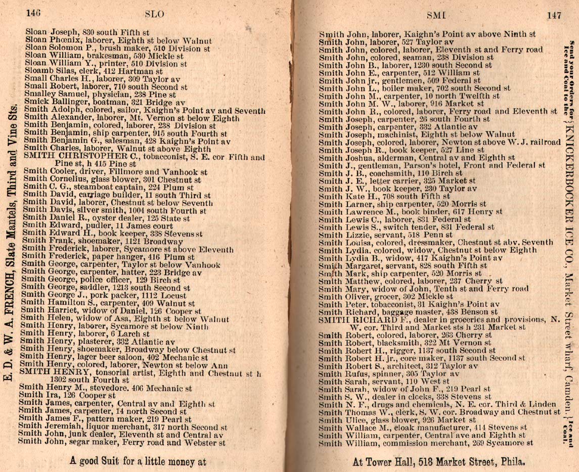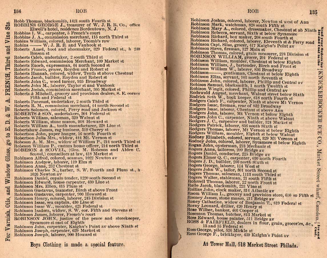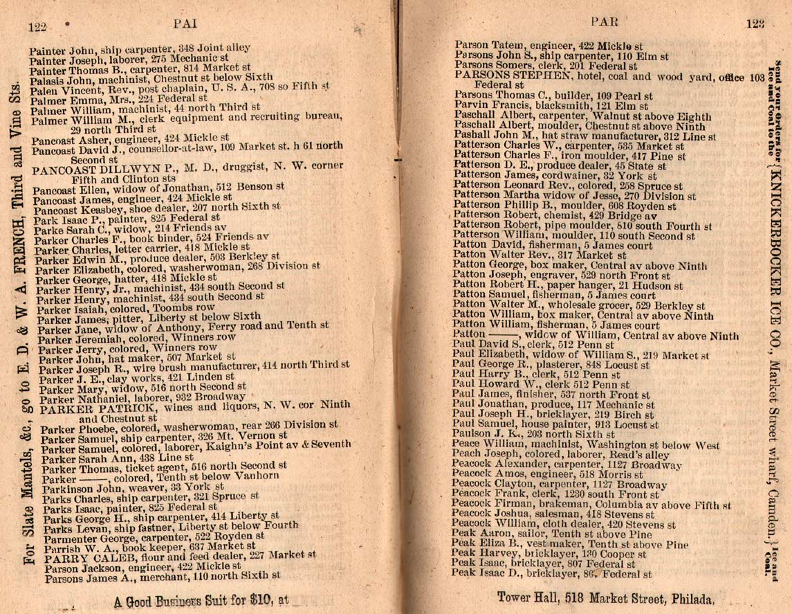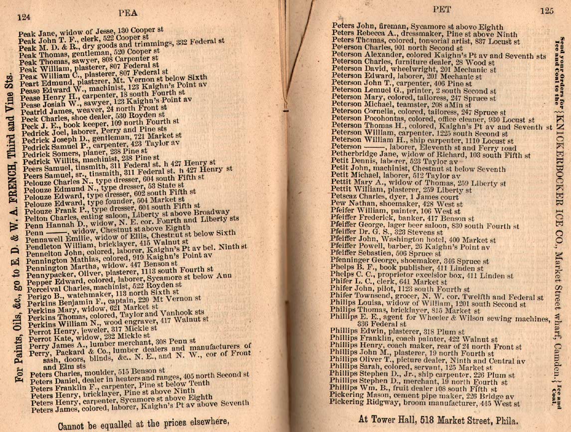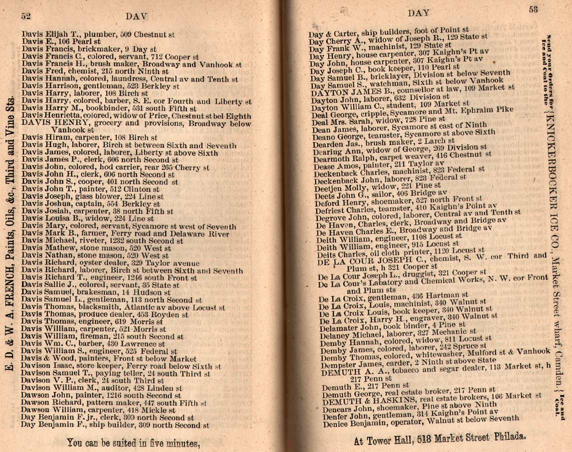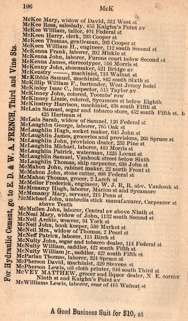 DAVID RITTENHOUSE, President. STANDING COMMITTEES. Teachers and City Board of Examiners.- William Fewsmith, 611 Cooper street; James M. Cassady, 128 Federal street; David Rittenhouse, 213 Kaighn's Point Avenue. Accounts.-Timothy C. Moore, 7 South Third Street; David L. Taylor, 316 North Second Street; Thomas McDoweIl, 818 South Fifth Street. Property.-Mayberry E. Harden, 319 Mt. Vernon Street; Timothy C. Moore, 7 South Third Street; James Kennedy, Sr., Davis B. Litzenburg, Broadway, Centreville; William Fewsmith, 611 Cooper street. Supplies.-Joseph C. De La Cour, S. W. corner Third and Plum Street; James M. Ridge, M.D., 304 Mickle Street; John Dobbins, Broadway, Centreville. Permits.-James M. Cassady, Third and Fourth Wards, First District; Joseph C. De La Cour, First and Second Wards,. Second District; David Rittenhouse, Fifth and Sixth Wards, Third District; Caleb F. Rogers, Seventh Ward, Fourth District; John Dobbins, Eighth Ward, Fifth District. Books.-Charles W. Satori, M. D., 514 Federal Street; Caleb F. Rogers; David L. Taylor, 316 North Second Street. Printing.-Levi B. Newton, 903 South Fifth Street; James Kennedy, Sr.; John Dobbins. |