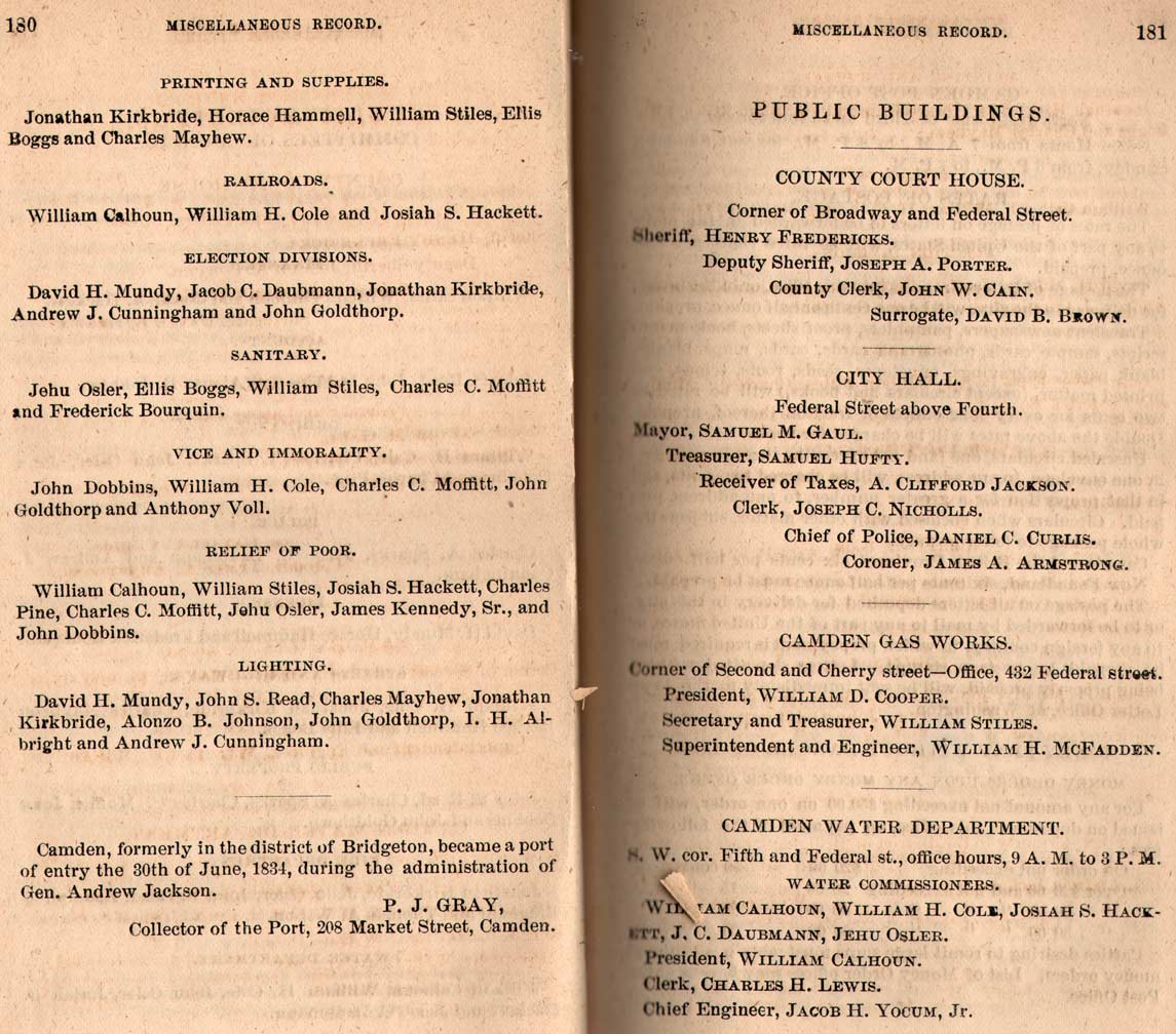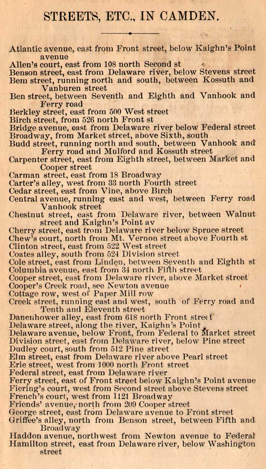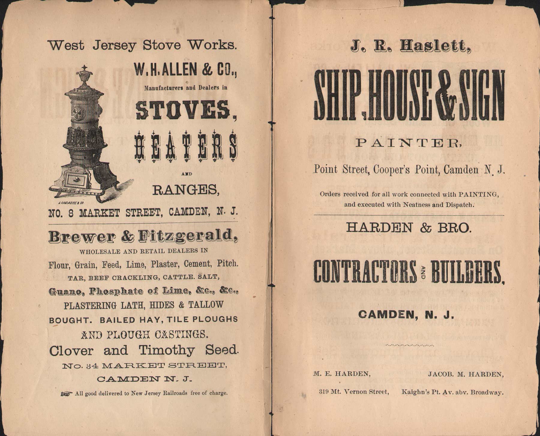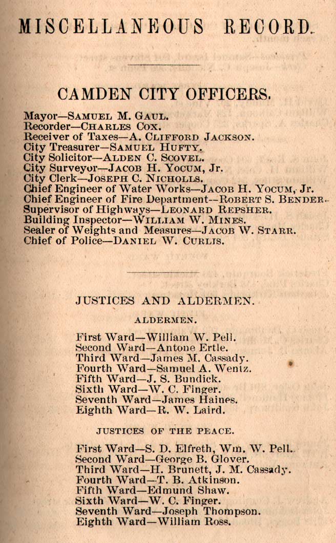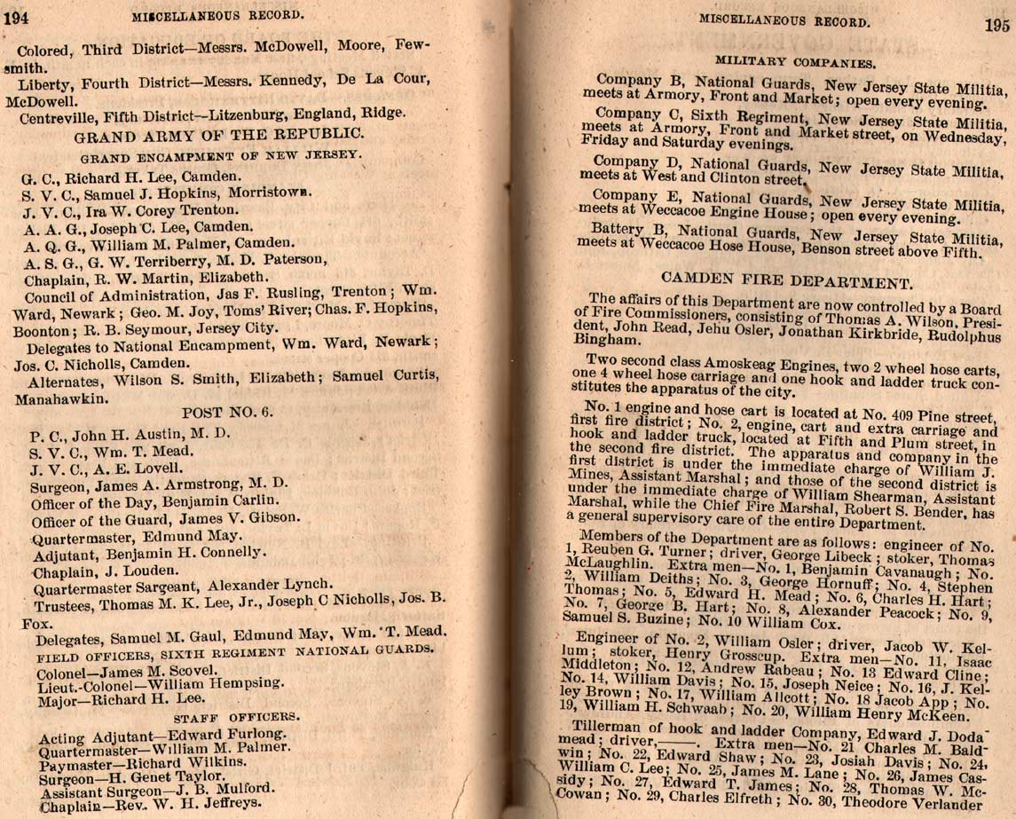 CAMDEN FIRE DEPARTMENT The affairs of this Department are now controlled by a Board of Fire Commissioners, consisting of Thomas A. Wilson, President, John Read, Jehu Osler, Jonathan Kirkbride, Rudolphus Bingham. Two second class Amoskeag Engines, two 2 wheel hose carts, one 4 wheel hose carriage and one hook and ladder truck constitutes the apparatus of the city. No. 1 engine and hose cart is located at No. 409 Pine street, first fire district; No. 2 engine, cart and extra carriage and hook and ladder truck, located at Fifth and Plum street, in the second fire district. The apparatus and company in the first district is under the immediate charge of William W. Mines; Assistant Marshal; and those of the second district is under the immediate charge of William Shearman, Assistant Marshal, while the Chief Fire Marshal, Robert S. Bender, has a general supervisory care of the entire Department. Members of the Department are as follows: engineer of No. 1, Reuben G. Turner [G. Rudolph Tenner –PMC]; driver, George Libeck [George Leibecke –PMC]; stoker, Thomas McLaughlin. Extra men- No. 1, Benjamin Cavanaugh; No. 2, William Deiths [william deith- PMC]; No. 3, George Horneff; No. 4, Stephen Thomas; No. 5 Edward H. Mead; No. 6, Charles H. Hart; No. 7, George B. Hart; No. 8, Alexander Peacock; No. 9, Samuel S. Buzine; No. 10 William Cox. . Engineer of no. 2, William Osler; driver, Jacob W. Kellum; stoker, Henry Grosscup. Extra men- No. 11, Isaac Middleton; No. 12, Andrew Rabeau; No. 13 Edward Cline [Elwood Cline –pmc]; No. 14, William Davis; No. 15. Joseph Neice [Joseph Nece –PMC]; No. 16, J. Kelley Brown; No. 17, William Alcott; No. 18 jacob app; no. 19, William H. Schwaab; No. 20, William Henry McKeen. Tillerman of hook and ladder Company, Edward J. Dodamead; driver, ______. Extra men- No. 21 Charles M. Baldwin; No. 22, Edward Shaw; No. 23, Josiah Davis; No. 24. William C. Lee; No. 25, James M. Lane; No. 26, James Cassidy; No. 27, Edward T. James; No. 28. Thomas W. McCowan ; No. 29, Charles Elfreth; No. 30, Theodore Verlander. |