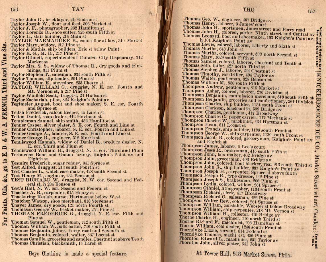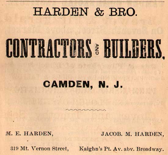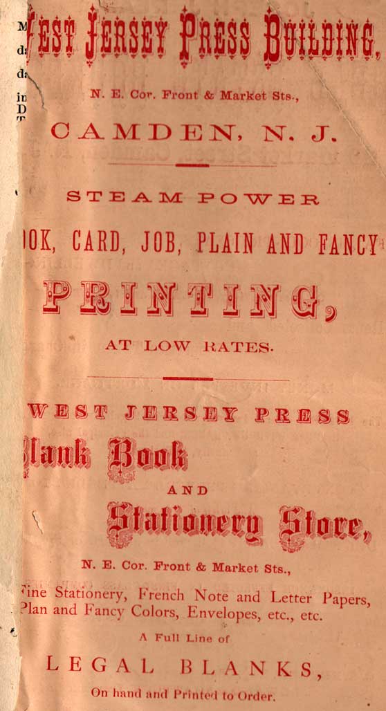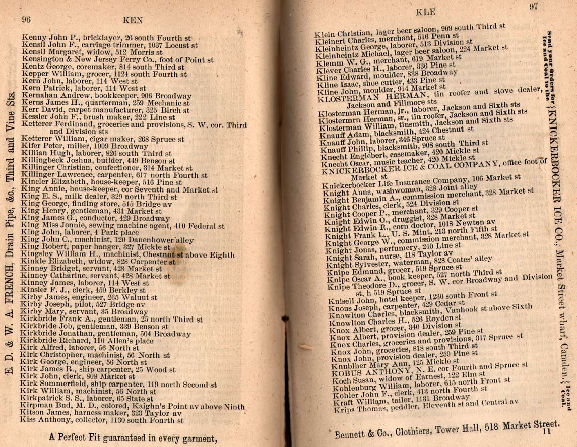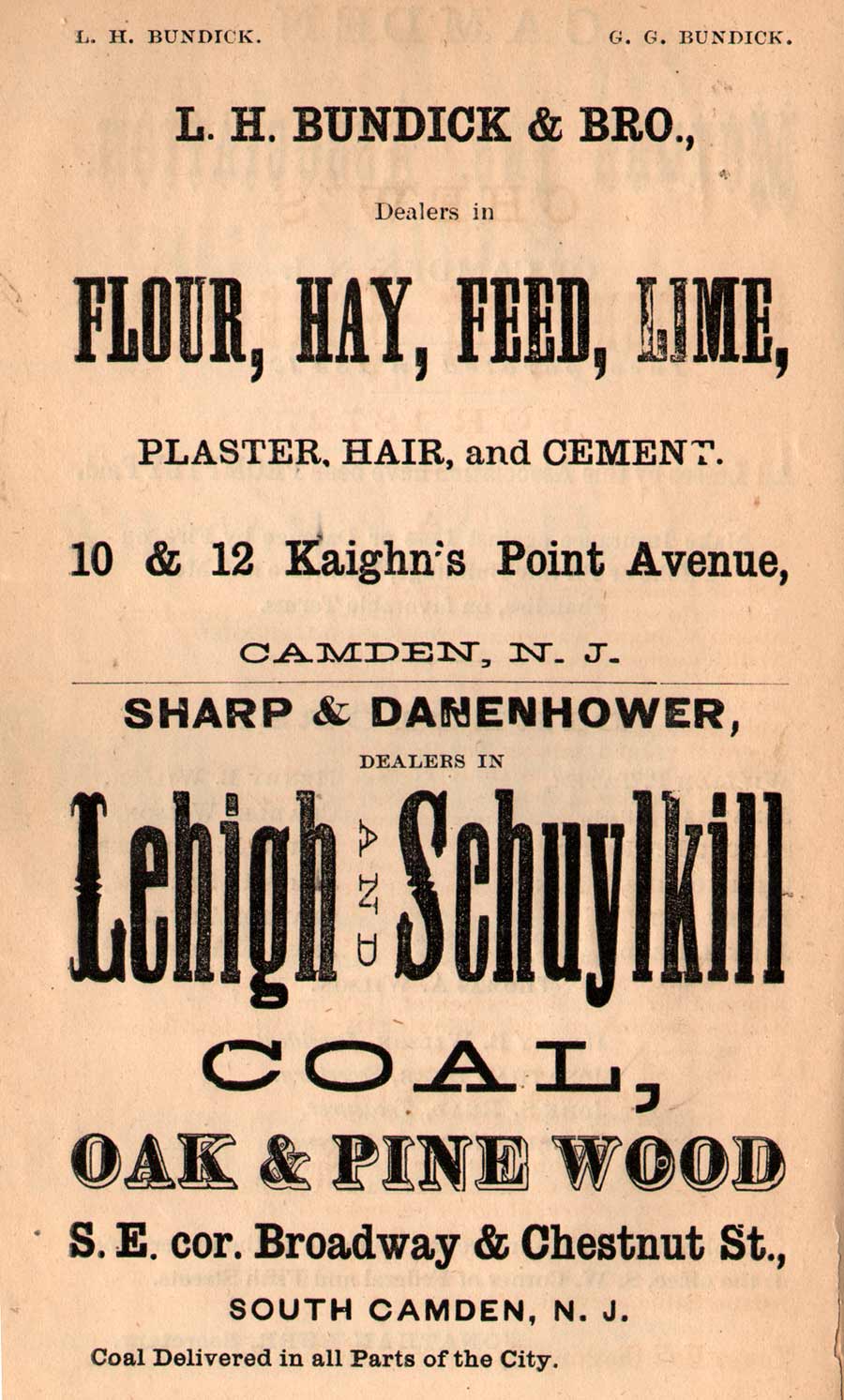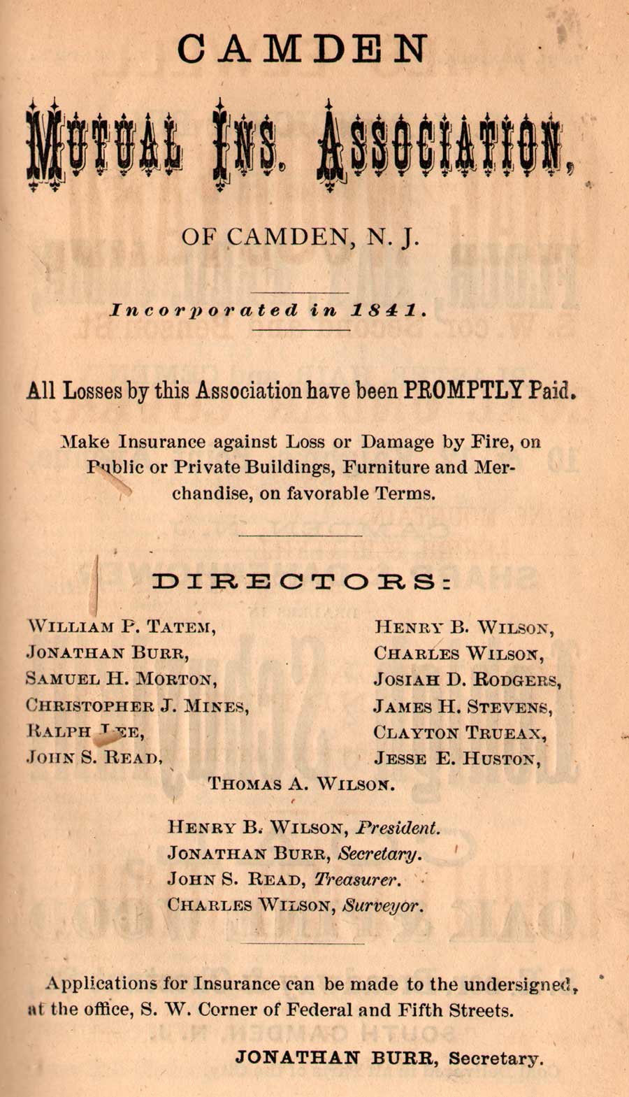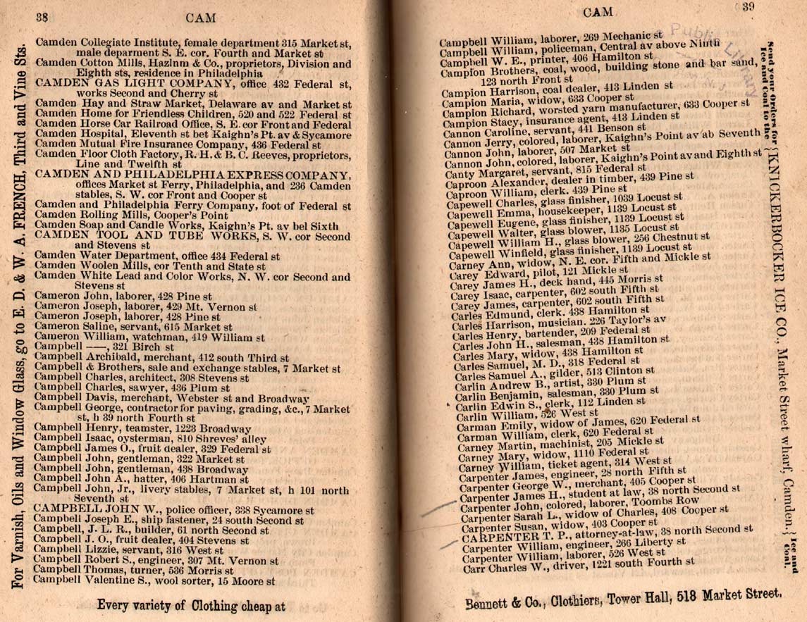 CAMDEN FIRE DEPARTMENT The affairs of this Department are now controlled by a Board of Fire Commissioners, consisting of Thomas A. Wilson, President, John Read, Jehu Osler, Jonathan Kirkbride, Rudolphus Bingham. Two second class Amoskeag Engines, two 2 wheel hose carts, one 4 wheel hose carriage and one hook and ladder truck constitutes the apparatus of the city. No. 1 engine and hose cart is located at No. 409 Pine street, first fire district; No. 2 engine, cart and extra carriage and hook and ladder truck, located at Fifth and Plum street, in the second fire district. The apparatus and company in the first district is under the immediate charge of William W. Mines; Assistant Marshal; and those of the second district is under the immediate charge of William Shearman, Assistant Marshal, while the Chief Fire Marshal, Robert S. Bender, has a general supervisory care of the entire Department. Members of the Department are as follows: engineer of No. 1, Reuben G. Turner [G. Rudolph Tenner –PMC]; driver, George Libeck [George Leibecke –PMC]; stoker, Thomas McLaughlin. Extra men- No. 1, Benjamin Cavanaugh; No. 2, William Deiths [william deith- PMC]; No. 3, George Horneff; No. 4, Stephen Thomas; No. 5 Edward H. Mead; No. 6, Charles H. Hart; No. 7, George B. Hart; No. 8, Alexander Peacock; No. 9, Samuel S. Buzine; No. 10 William Cox. . Engineer of no. 2, William Osler; driver, Jacob W. Kellum; stoker, Henry Grosscup. Extra men- No. 11, Isaac Middleton; No. 12, Andrew Rabeau; No. 13 Edward Cline [Elwood Cline –pmc]; No. 14, William Davis; No. 15. Joseph Neice [Joseph Nece –PMC]; No. 16, J. Kelley Brown; No. 17, William Alcott; No. 18 jacob app; no. 19, William H. Schwaab; No. 20, William Henry McKeen. Tillerman of hook and ladder Company, Edward J. Dodamead; driver, ______. Extra men- No. 21 Charles M. Baldwin; No. 22, Edward Shaw; No. 23, Josiah Davis; No. 24. William C. Lee; No. 25, James M. Lane; No. 26, James Cassidy; No. 27, Edward T. James; No. 28. Thomas W. McCowan ; No. 29, Charles Elfreth; No. 30, Theodore Verlander. |