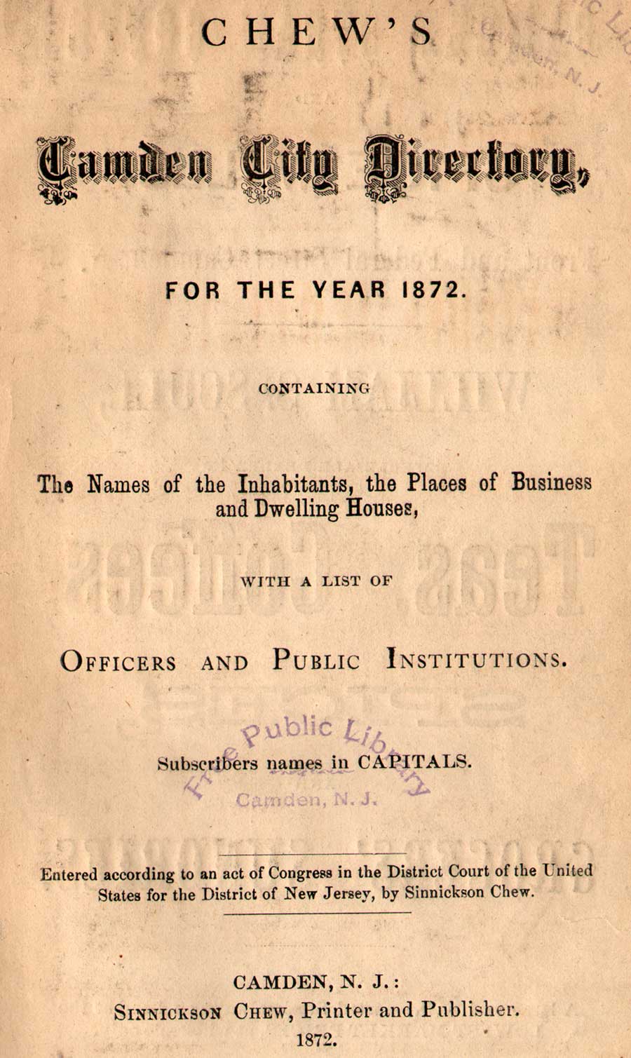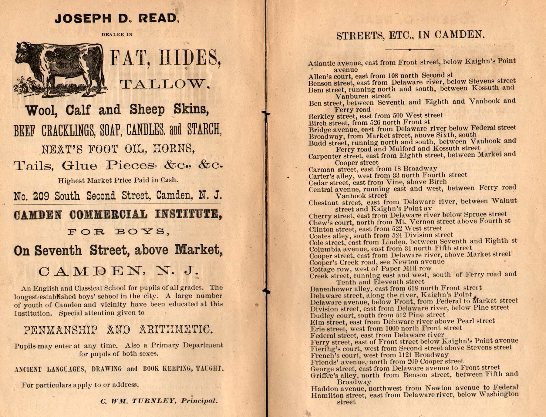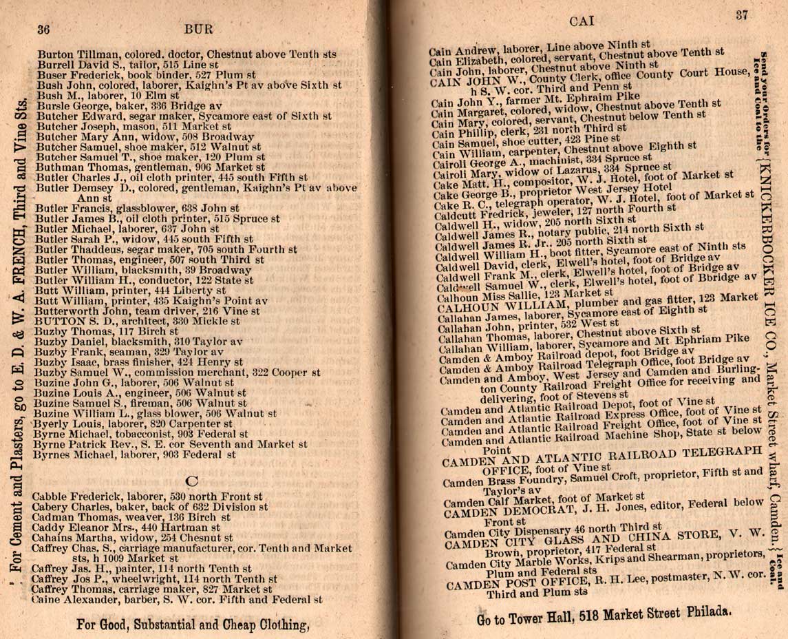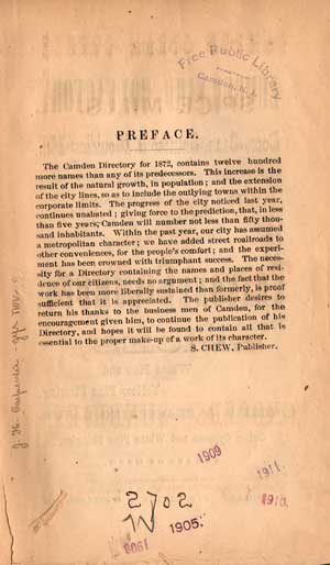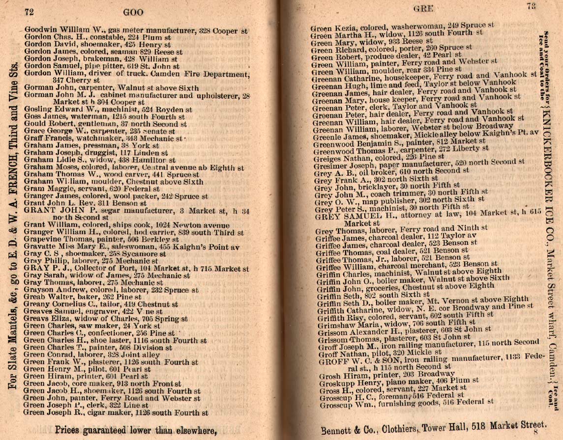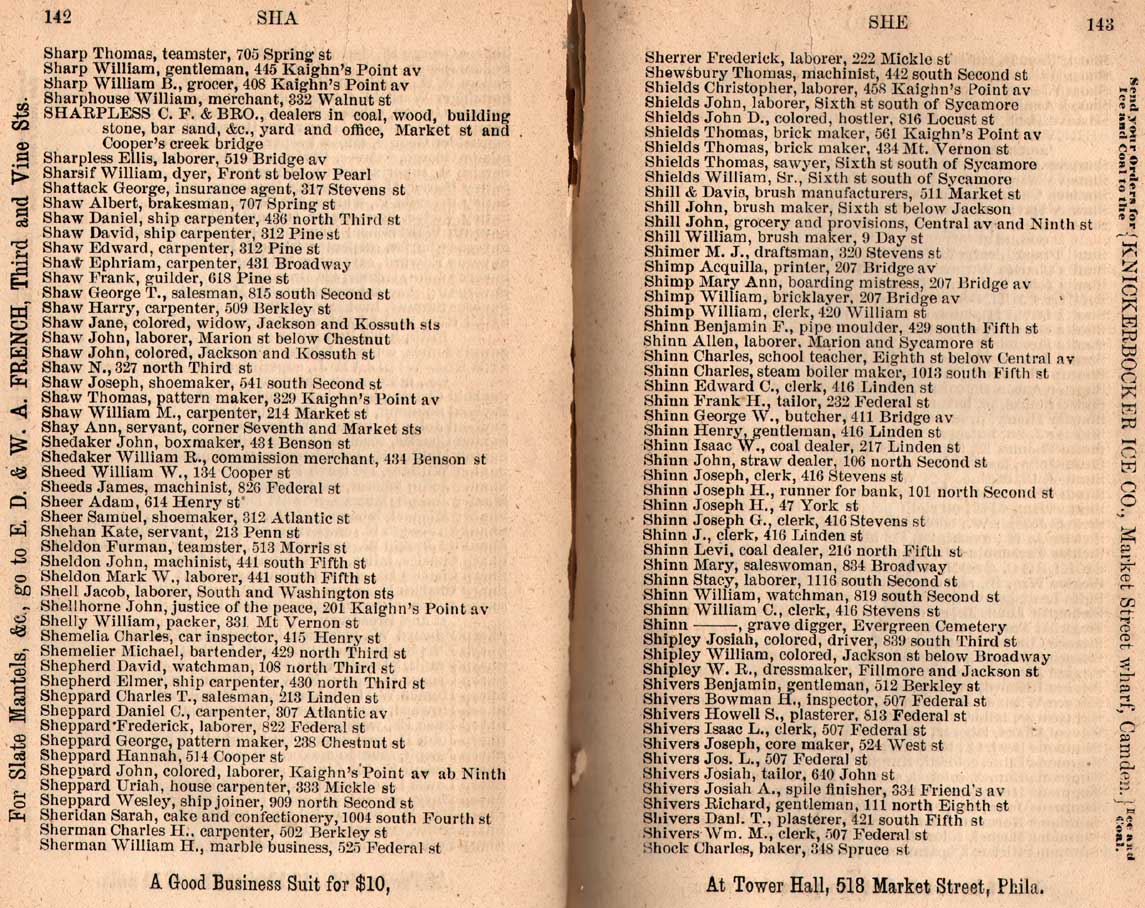 CAMDEN FIRE DEPARTMENT The affairs of this Department are now controlled by a Board of Fire Commissioners, consisting of Thomas A. Wilson, President, John Read, Jehu Osler, Jonathan Kirkbride, Rudolphus Bingham. Two second class Amoskeag Engines, two 2 wheel hose carts, one 4 wheel hose carriage and one hook and ladder truck constitutes the apparatus of the city. No. 1 engine and hose cart is located at No. 409 Pine street, first fire district; No. 2 engine, cart and extra carriage and hook and ladder truck, located at Fifth and Plum street, in the second fire district. The apparatus and company in the first district is under the immediate charge of William W. Mines; Assistant Marshal; and those of the second district is under the immediate charge of William Shearman, Assistant Marshal, while the Chief Fire Marshal, Robert S. Bender, has a general supervisory care of the entire Department. Members of the Department are as follows: engineer of No. 1, Reuben G. Turner [G. Rudolph Tenner –PMC]; driver, George Libeck [George Leibecke –PMC]; stoker, Thomas McLaughlin. Extra men- No. 1, Benjamin Cavanaugh; No. 2, William Deiths [william deith- PMC]; No. 3, George Horneff; No. 4, Stephen Thomas; No. 5 Edward H. Mead; No. 6, Charles H. Hart; No. 7, George B. Hart; No. 8, Alexander Peacock; No. 9, Samuel S. Buzine; No. 10 William Cox. . Engineer of no. 2, William Osler; driver, Jacob W. Kellum; stoker, Henry Grosscup. Extra men- No. 11, Isaac Middleton; No. 12, Andrew Rabeau; No. 13 Edward Cline [Elwood Cline –pmc]; No. 14, William Davis; No. 15. Joseph Neice [Joseph Nece –PMC]; No. 16, J. Kelley Brown; No. 17, William Alcott; No. 18 jacob app; no. 19, William H. Schwaab; No. 20, William Henry McKeen. Tillerman of hook and ladder Company, Edward J. Dodamead; driver, ______. Extra men- No. 21 Charles M. Baldwin; No. 22, Edward Shaw; No. 23, Josiah Davis; No. 24. William C. Lee; No. 25, James M. Lane; No. 26, James Cassidy; No. 27, Edward T. James; No. 28. Thomas W. McCowan ; No. 29, Charles Elfreth; No. 30, Theodore Verlander. |