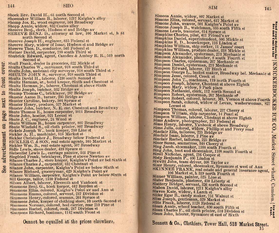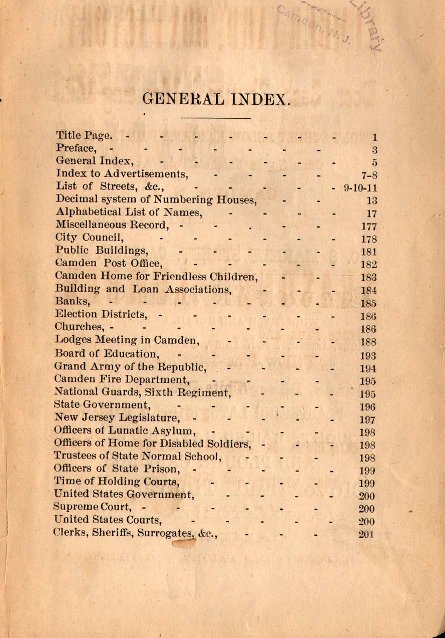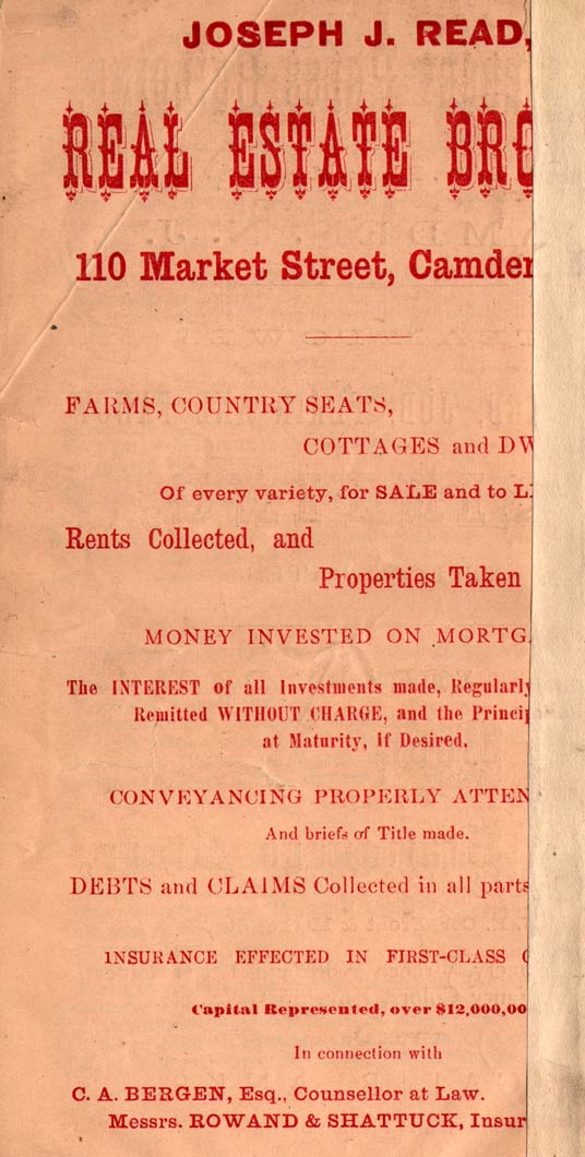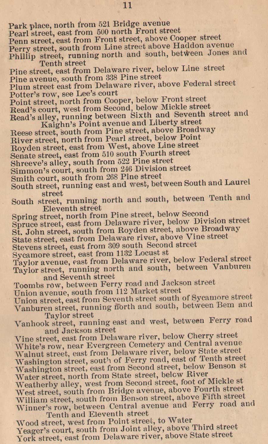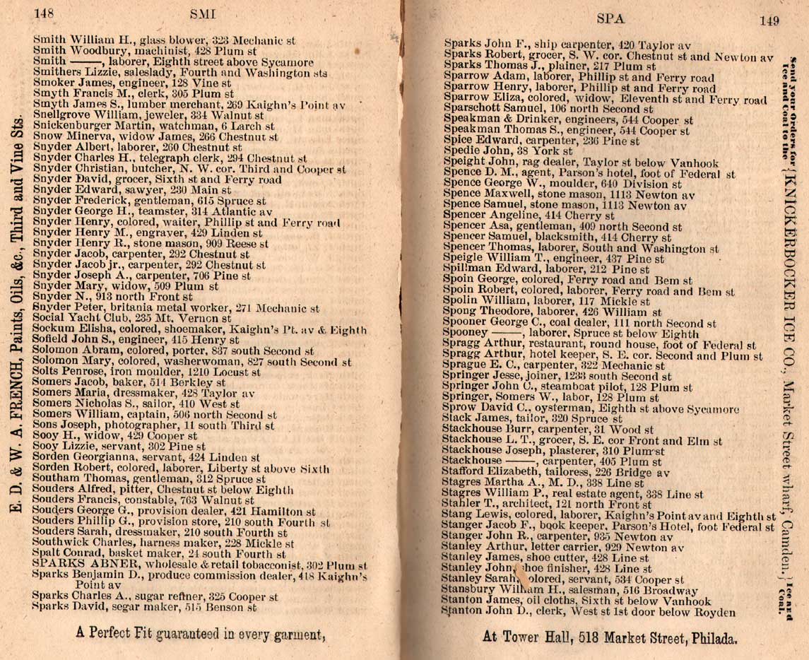 CAMDEN FIRE DEPARTMENT The affairs of this Department are now controlled by a Board of Fire Commissioners, consisting of Thomas A. Wilson, President, John Read, Jehu Osler, Jonathan Kirkbride, Rudolphus Bingham. Two second class Amoskeag Engines, two 2 wheel hose carts, one 4 wheel hose carriage and one hook and ladder truck constitutes the apparatus of the city. No. 1 engine and hose cart is located at No. 409 Pine street, first fire district; No. 2 engine, cart and extra carriage and hook and ladder truck, located at Fifth and Plum street, in the second fire district. The apparatus and company in the first district is under the immediate charge of William W. Mines; Assistant Marshal; and those of the second district is under the immediate charge of William Shearman, Assistant Marshal, while the Chief Fire Marshal, Robert S. Bender, has a general supervisory care of the entire Department. Members of the Department are as follows: engineer of No. 1, Reuben G. Turner [G. Rudolph Tenner –PMC]; driver, George Libeck [George Leibecke –PMC]; stoker, Thomas McLaughlin. Extra men- No. 1, Benjamin Cavanaugh; No. 2, William Deiths [william deith- PMC]; No. 3, George Horneff; No. 4, Stephen Thomas; No. 5 Edward H. Mead; No. 6, Charles H. Hart; No. 7, George B. Hart; No. 8, Alexander Peacock; No. 9, Samuel S. Buzine; No. 10 William Cox. . Engineer of no. 2, William Osler; driver, Jacob W. Kellum; stoker, Henry Grosscup. Extra men- No. 11, Isaac Middleton; No. 12, Andrew Rabeau; No. 13 Edward Cline [Elwood Cline –pmc]; No. 14, William Davis; No. 15. Joseph Neice [Joseph Nece –PMC]; No. 16, J. Kelley Brown; No. 17, William Alcott; No. 18 jacob app; no. 19, William H. Schwaab; No. 20, William Henry McKeen. Tillerman of hook and ladder Company, Edward J. Dodamead; driver, ______. Extra men- No. 21 Charles M. Baldwin; No. 22, Edward Shaw; No. 23, Josiah Davis; No. 24. William C. Lee; No. 25, James M. Lane; No. 26, James Cassidy; No. 27, Edward T. James; No. 28. Thomas W. McCowan ; No. 29, Charles Elfreth; No. 30, Theodore Verlander. |
