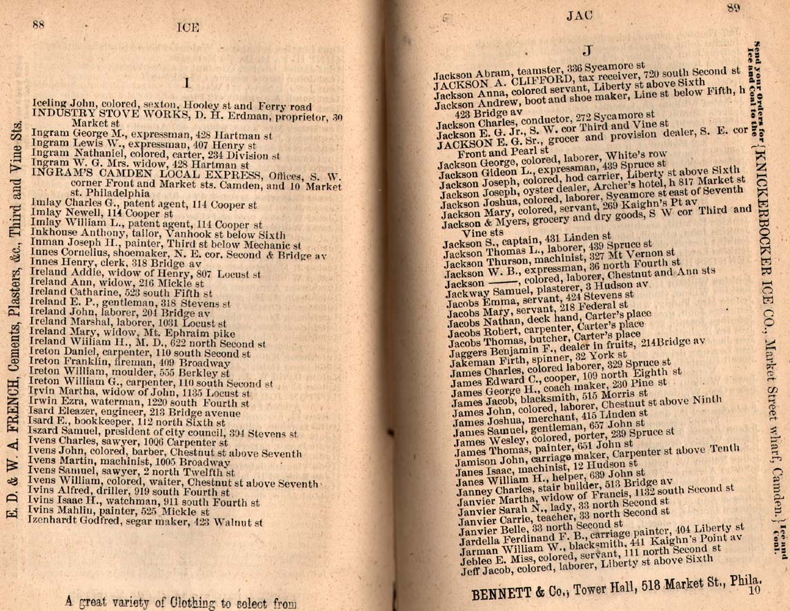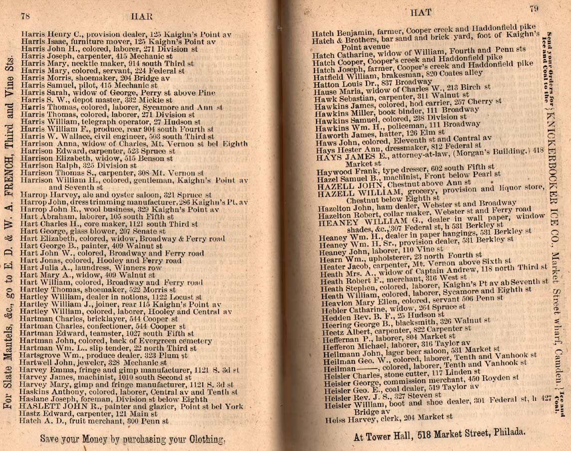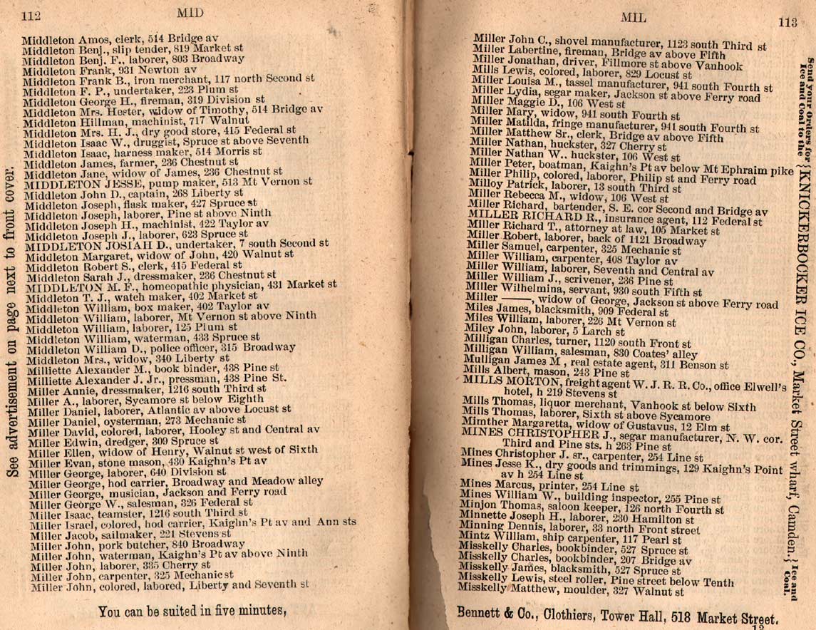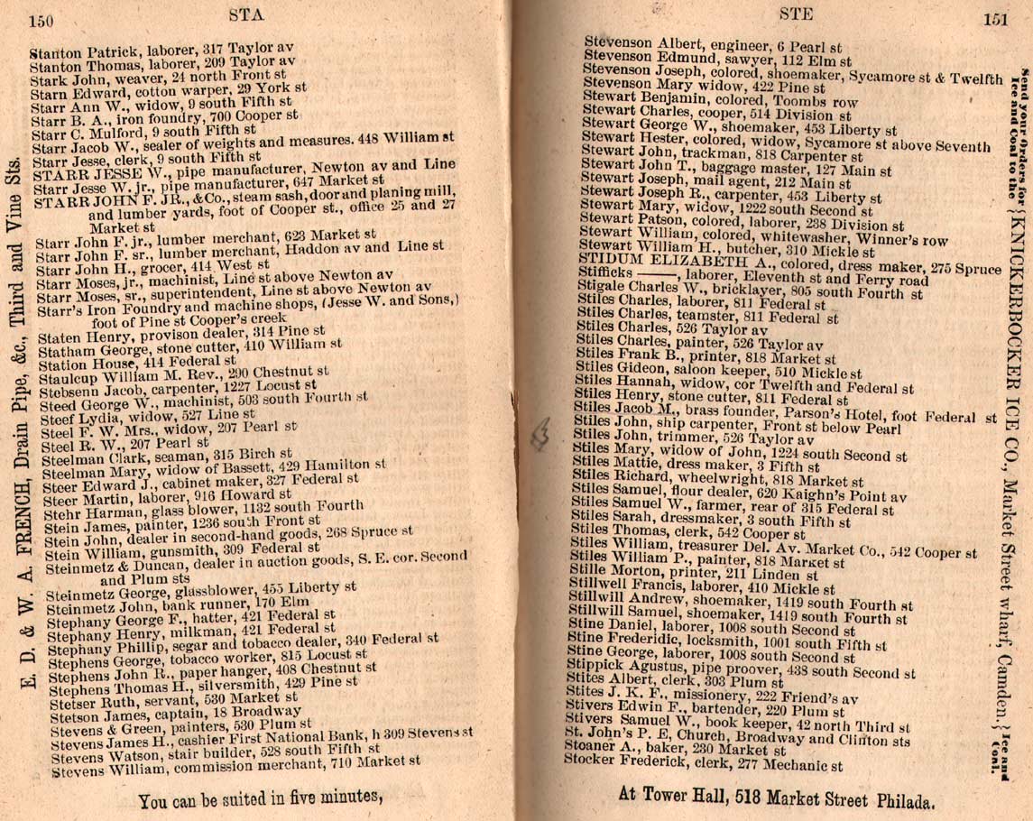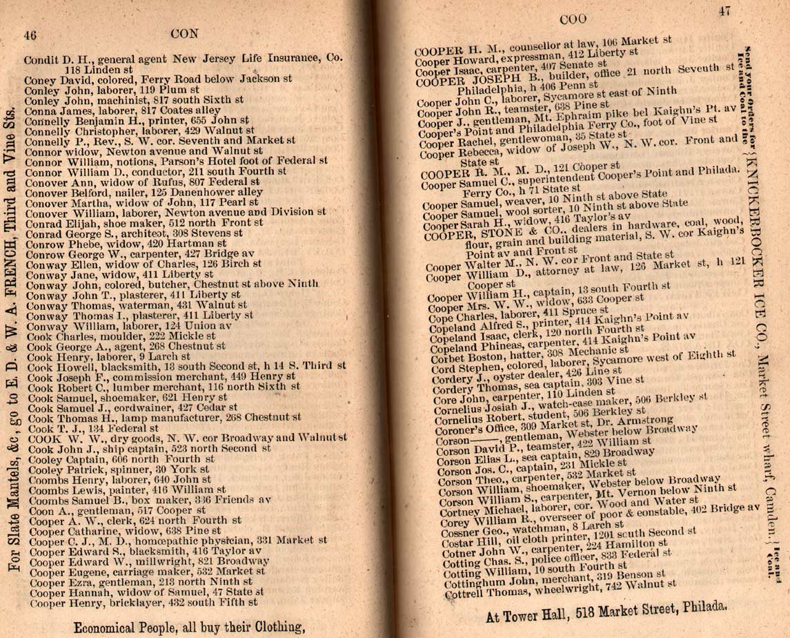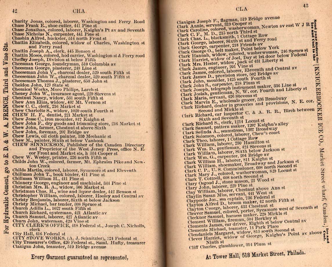 CAMDEN FIRE DEPARTMENT The affairs of this Department are now controlled by a Board of Fire Commissioners, consisting of Thomas A. Wilson, President, John Read, Jehu Osler, Jonathan Kirkbride, Rudolphus Bingham. Two second class Amoskeag Engines, two 2 wheel hose carts, one 4 wheel hose carriage and one hook and ladder truck constitutes the apparatus of the city. No. 1 engine and hose cart is located at No. 409 Pine street, first fire district; No. 2 engine, cart and extra carriage and hook and ladder truck, located at Fifth and Plum street, in the second fire district. The apparatus and company in the first district is under the immediate charge of William W. Mines; Assistant Marshal; and those of the second district is under the immediate charge of William Shearman, Assistant Marshal, while the Chief Fire Marshal, Robert S. Bender, has a general supervisory care of the entire Department. Members of the Department are as follows: engineer of No. 1, Reuben G. Turner [G. Rudolph Tenner –PMC]; driver, George Libeck [George Leibecke –PMC]; stoker, Thomas McLaughlin. Extra men- No. 1, Benjamin Cavanaugh; No. 2, William Deiths [william deith- PMC]; No. 3, George Horneff; No. 4, Stephen Thomas; No. 5 Edward H. Mead; No. 6, Charles H. Hart; No. 7, George B. Hart; No. 8, Alexander Peacock; No. 9, Samuel S. Buzine; No. 10 William Cox. . Engineer of no. 2, William Osler; driver, Jacob W. Kellum; stoker, Henry Grosscup. Extra men- No. 11, Isaac Middleton; No. 12, Andrew Rabeau; No. 13 Edward Cline [Elwood Cline –pmc]; No. 14, William Davis; No. 15. Joseph Neice [Joseph Nece –PMC]; No. 16, J. Kelley Brown; No. 17, William Alcott; No. 18 jacob app; no. 19, William H. Schwaab; No. 20, William Henry McKeen. Tillerman of hook and ladder Company, Edward J. Dodamead; driver, ______. Extra men- No. 21 Charles M. Baldwin; No. 22, Edward Shaw; No. 23, Josiah Davis; No. 24. William C. Lee; No. 25, James M. Lane; No. 26, James Cassidy; No. 27, Edward T. James; No. 28. Thomas W. McCowan ; No. 29, Charles Elfreth; No. 30, Theodore Verlander. |