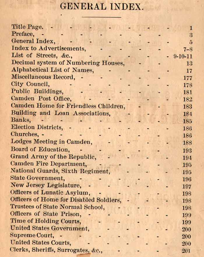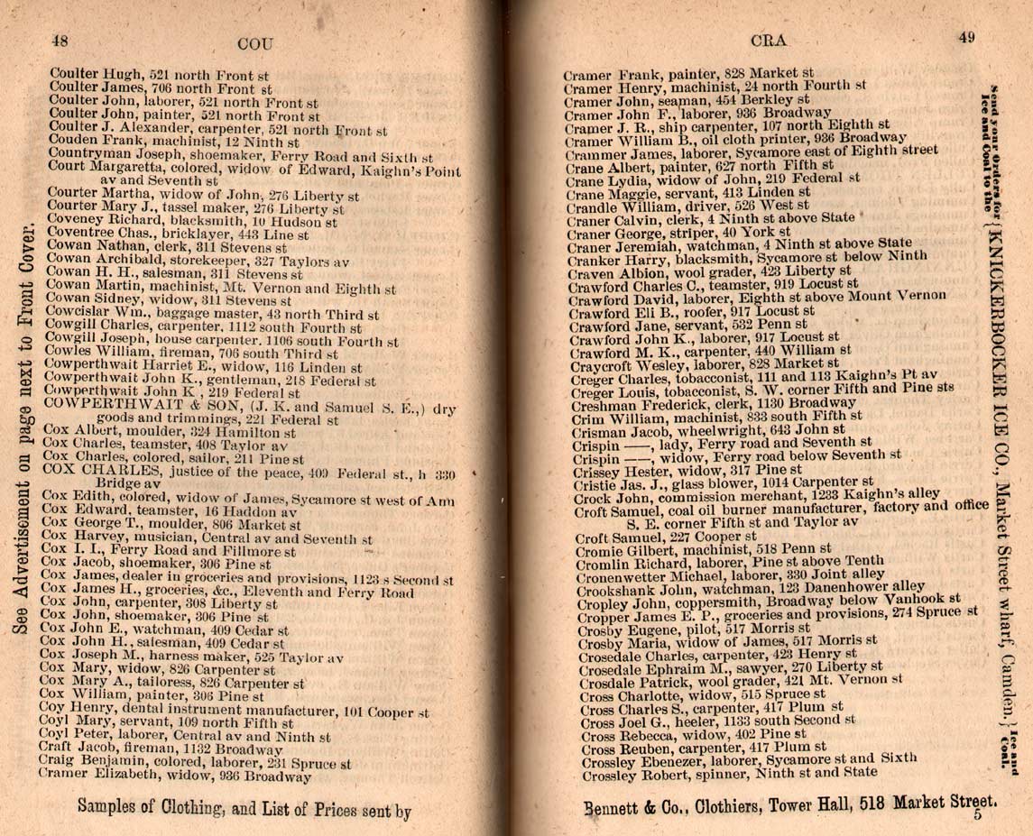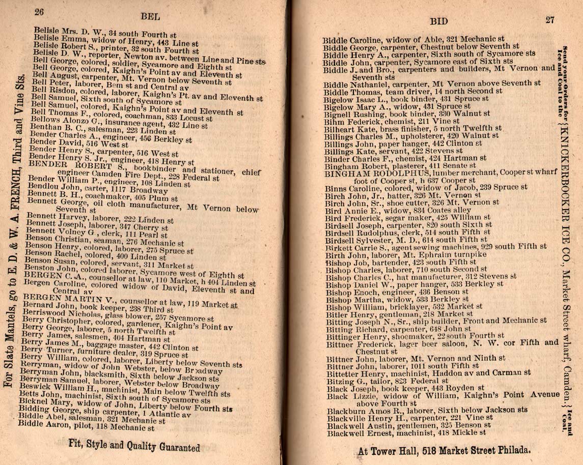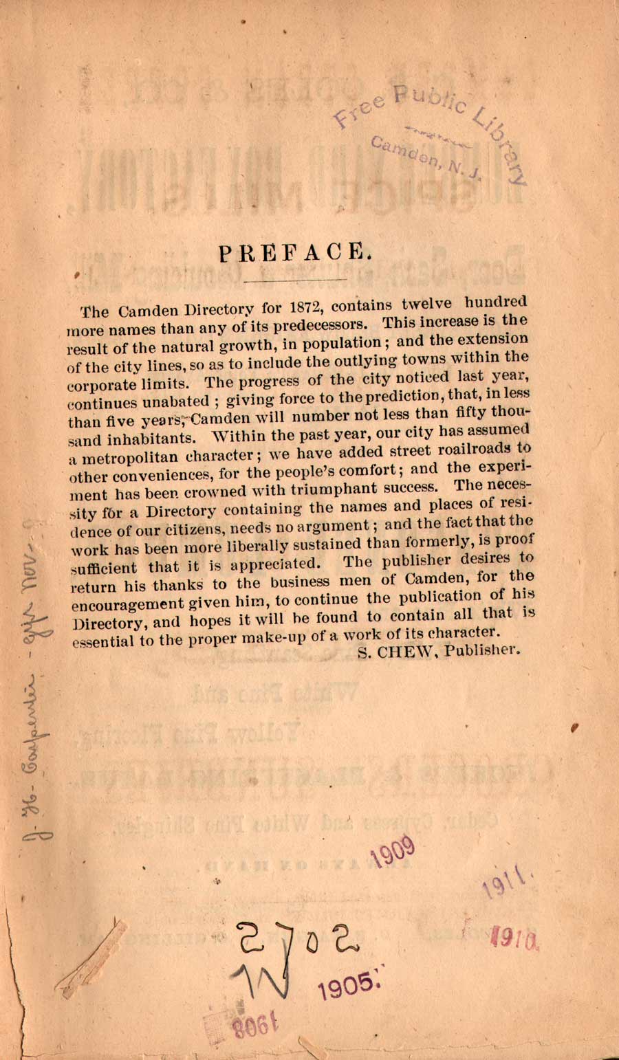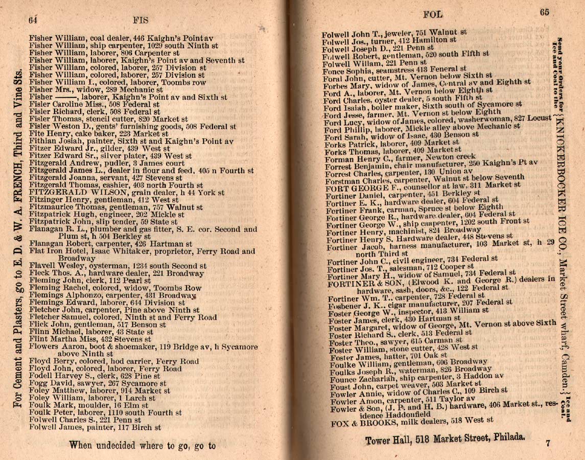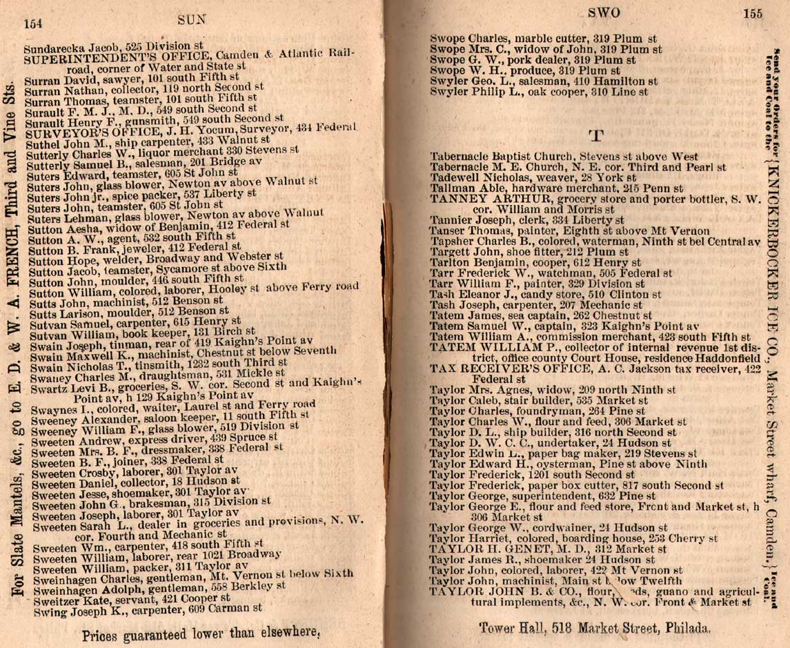 CAMDEN FIRE DEPARTMENT The affairs of this Department are now controlled by a Board of Fire Commissioners, consisting of Thomas A. Wilson, President, John Read, Jehu Osler, Jonathan Kirkbride, Rudolphus Bingham. Two second class Amoskeag Engines, two 2 wheel hose carts, one 4 wheel hose carriage and one hook and ladder truck constitutes the apparatus of the city. No. 1 engine and hose cart is located at No. 409 Pine street, first fire district; No. 2 engine, cart and extra carriage and hook and ladder truck, located at Fifth and Plum street, in the second fire district. The apparatus and company in the first district is under the immediate charge of William W. Mines; Assistant Marshal; and those of the second district is under the immediate charge of William Shearman, Assistant Marshal, while the Chief Fire Marshal, Robert S. Bender, has a general supervisory care of the entire Department. Members of the Department are as follows: engineer of No. 1, Reuben G. Turner [G. Rudolph Tenner –PMC]; driver, George Libeck [George Leibecke –PMC]; stoker, Thomas McLaughlin. Extra men- No. 1, Benjamin Cavanaugh; No. 2, William Deiths [william deith- PMC]; No. 3, George Horneff; No. 4, Stephen Thomas; No. 5 Edward H. Mead; No. 6, Charles H. Hart; No. 7, George B. Hart; No. 8, Alexander Peacock; No. 9, Samuel S. Buzine; No. 10 William Cox. . Engineer of no. 2, William Osler; driver, Jacob W. Kellum; stoker, Henry Grosscup. Extra men- No. 11, Isaac Middleton; No. 12, Andrew Rabeau; No. 13 Edward Cline [Elwood Cline –pmc]; No. 14, William Davis; No. 15. Joseph Neice [Joseph Nece –PMC]; No. 16, J. Kelley Brown; No. 17, William Alcott; No. 18 jacob app; no. 19, William H. Schwaab; No. 20, William Henry McKeen. Tillerman of hook and ladder Company, Edward J. Dodamead; driver, ______. Extra men- No. 21 Charles M. Baldwin; No. 22, Edward Shaw; No. 23, Josiah Davis; No. 24. William C. Lee; No. 25, James M. Lane; No. 26, James Cassidy; No. 27, Edward T. James; No. 28. Thomas W. McCowan ; No. 29, Charles Elfreth; No. 30, Theodore Verlander. |