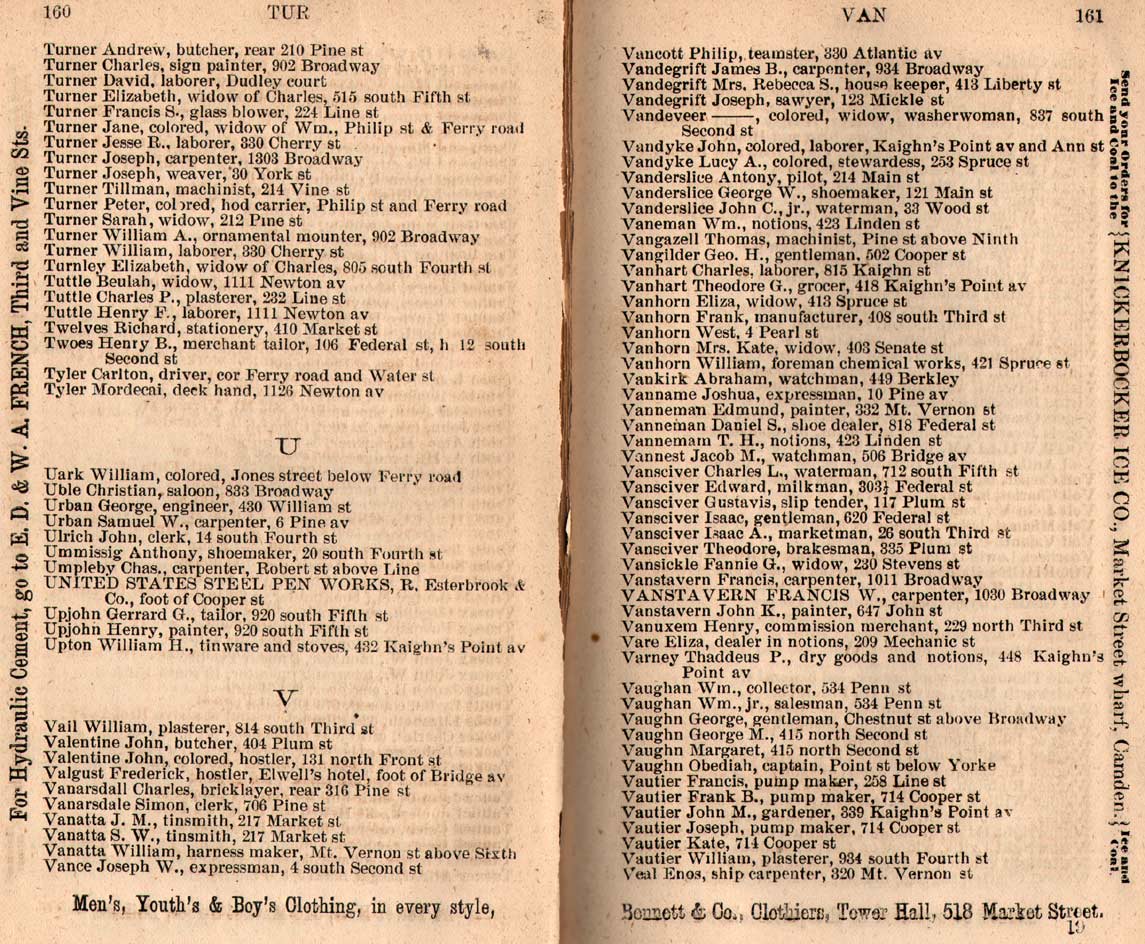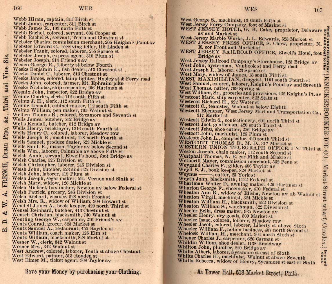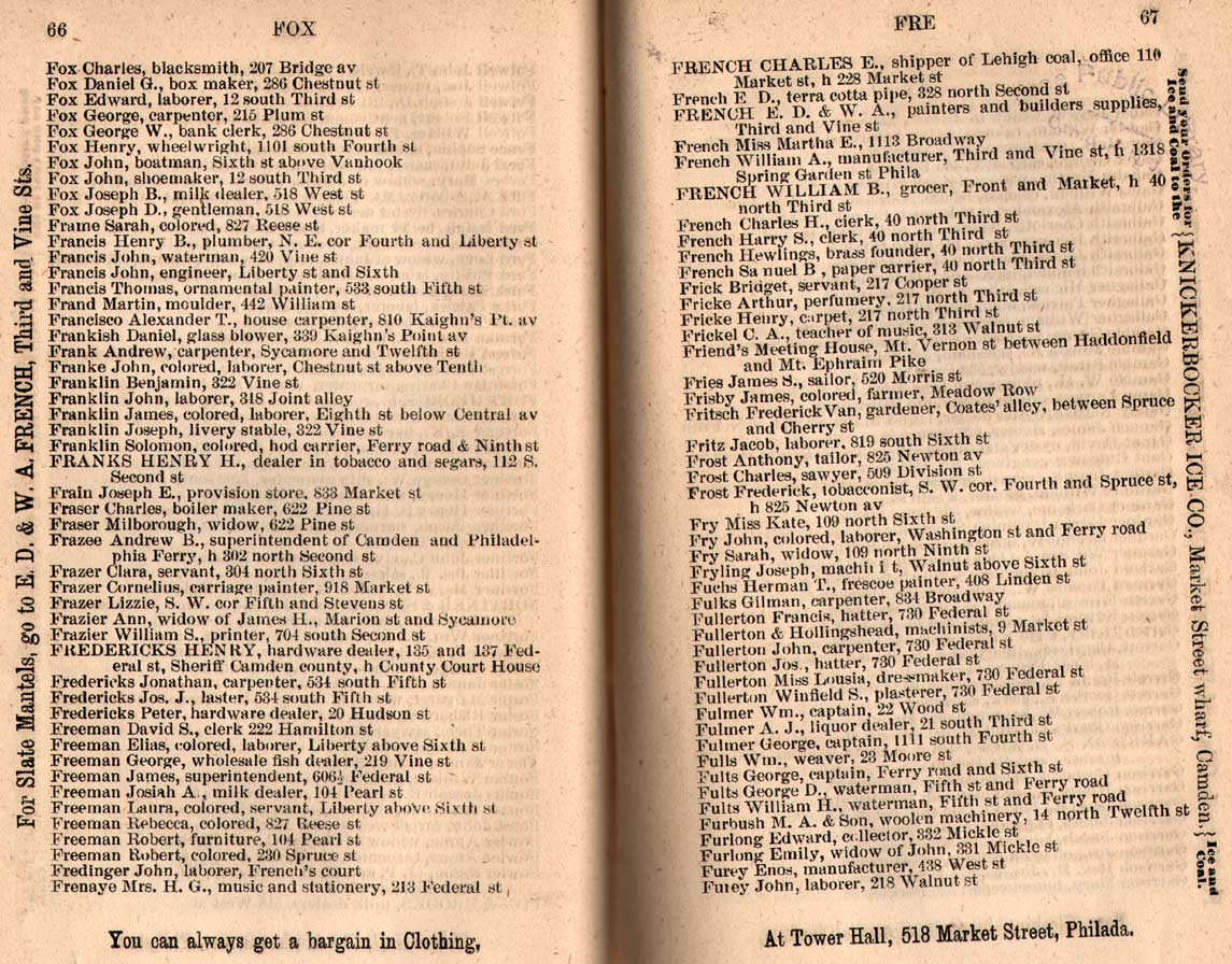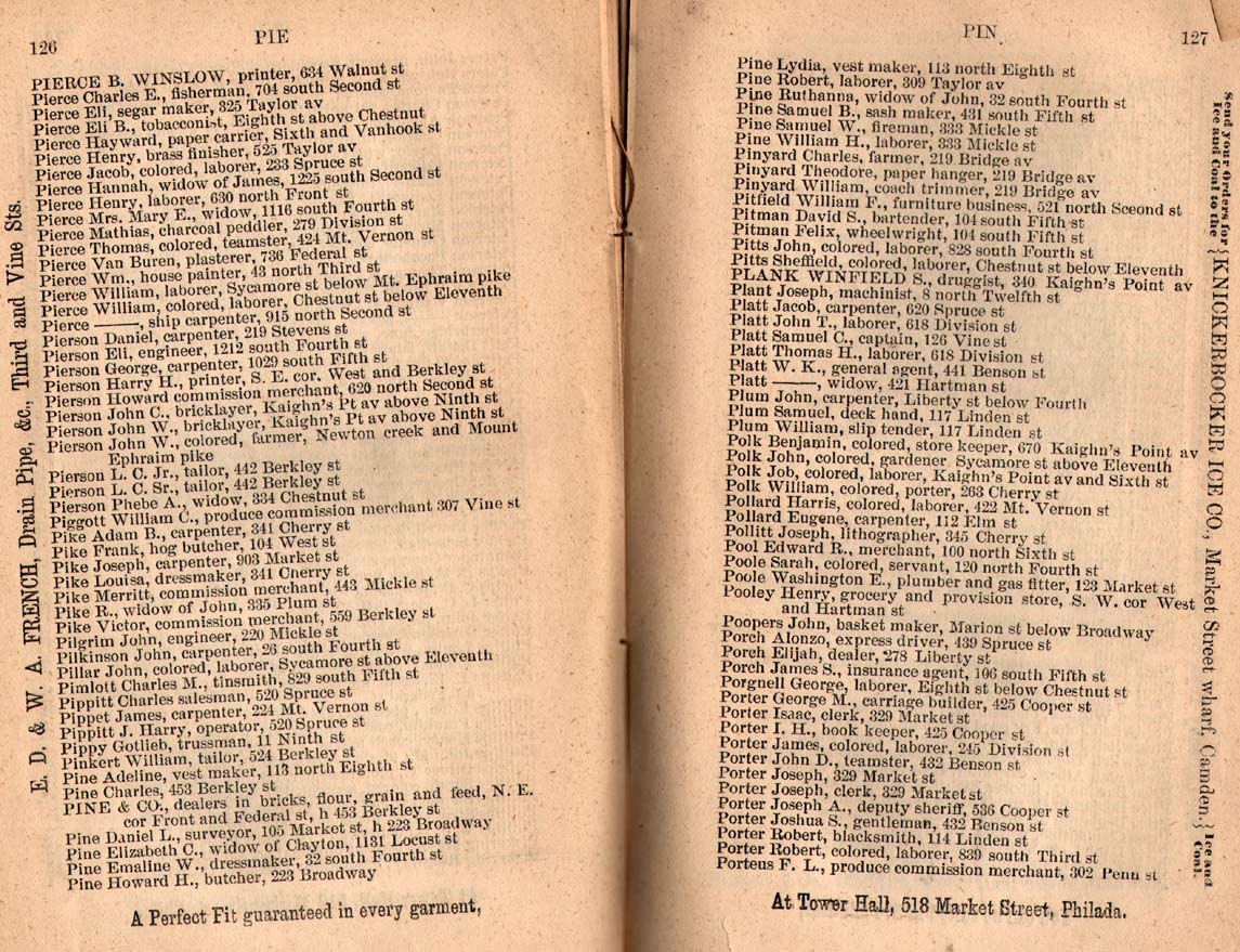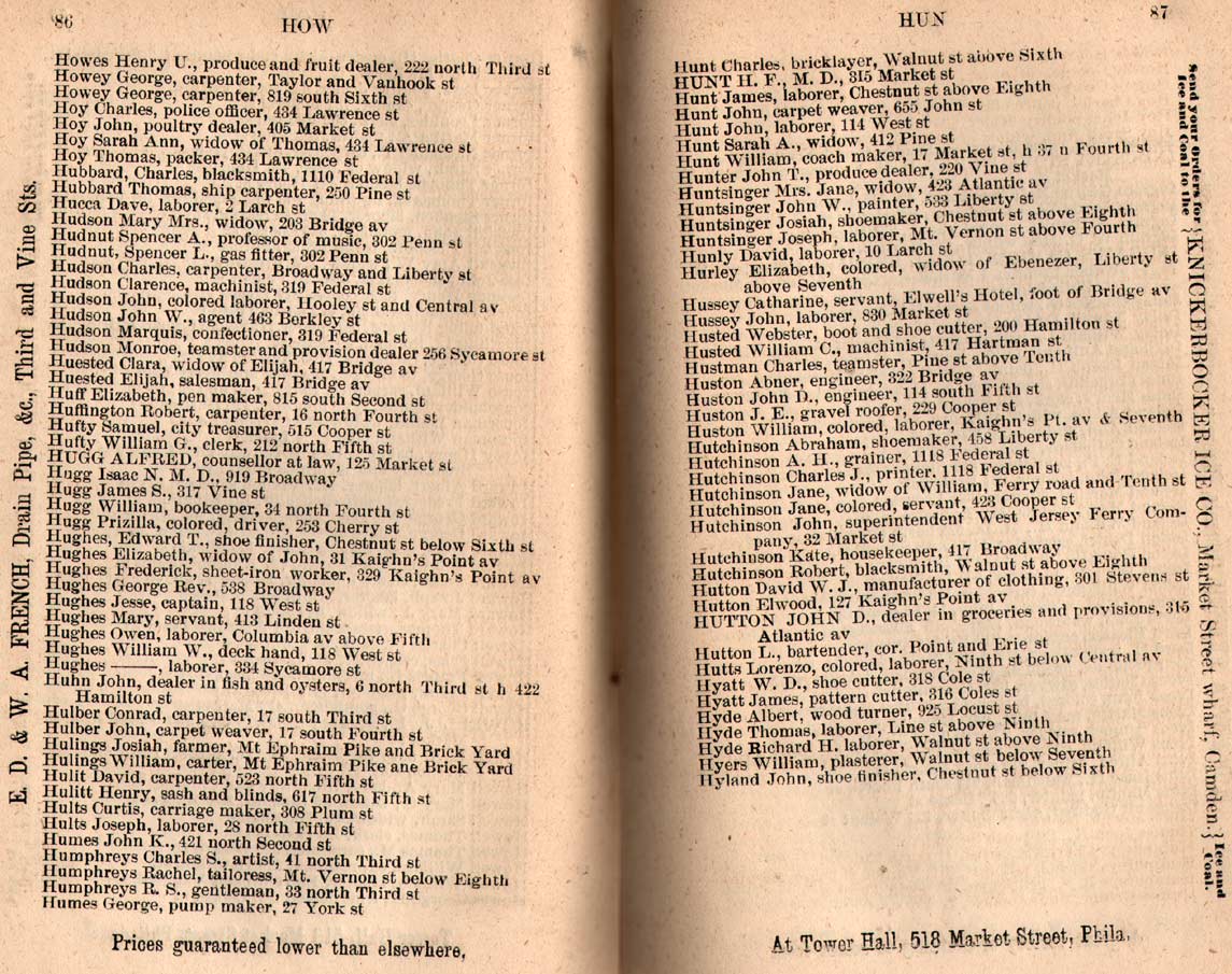 CAMDEN FIRE DEPARTMENT The affairs of this Department are now controlled by a Board of Fire Commissioners, consisting of Thomas A. Wilson, President, John Read, Jehu Osler, Jonathan Kirkbride, Rudolphus Bingham. Two second class Amoskeag Engines, two 2 wheel hose carts, one 4 wheel hose carriage and one hook and ladder truck constitutes the apparatus of the city. No. 1 engine and hose cart is located at No. 409 Pine street, first fire district; No. 2 engine, cart and extra carriage and hook and ladder truck, located at Fifth and Plum street, in the second fire district. The apparatus and company in the first district is under the immediate charge of William W. Mines; Assistant Marshal; and those of the second district is under the immediate charge of William Shearman, Assistant Marshal, while the Chief Fire Marshal, Robert S. Bender, has a general supervisory care of the entire Department. Members of the Department are as follows: engineer of No. 1, Reuben G. Turner [G. Rudolph Tenner –PMC]; driver, George Libeck [George Leibecke –PMC]; stoker, Thomas McLaughlin. Extra men- No. 1, Benjamin Cavanaugh; No. 2, William Deiths [william deith- PMC]; No. 3, George Horneff; No. 4, Stephen Thomas; No. 5 Edward H. Mead; No. 6, Charles H. Hart; No. 7, George B. Hart; No. 8, Alexander Peacock; No. 9, Samuel S. Buzine; No. 10 William Cox. . Engineer of no. 2, William Osler; driver, Jacob W. Kellum; stoker, Henry Grosscup. Extra men- No. 11, Isaac Middleton; No. 12, Andrew Rabeau; No. 13 Edward Cline [Elwood Cline –pmc]; No. 14, William Davis; No. 15. Joseph Neice [Joseph Nece –PMC]; No. 16, J. Kelley Brown; No. 17, William Alcott; No. 18 jacob app; no. 19, William H. Schwaab; No. 20, William Henry McKeen. Tillerman of hook and ladder Company, Edward J. Dodamead; driver, ______. Extra men- No. 21 Charles M. Baldwin; No. 22, Edward Shaw; No. 23, Josiah Davis; No. 24. William C. Lee; No. 25, James M. Lane; No. 26, James Cassidy; No. 27, Edward T. James; No. 28. Thomas W. McCowan ; No. 29, Charles Elfreth; No. 30, Theodore Verlander. |