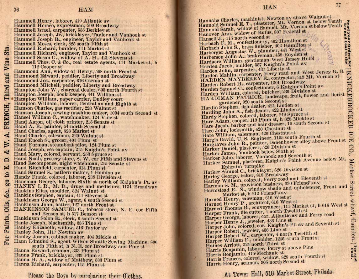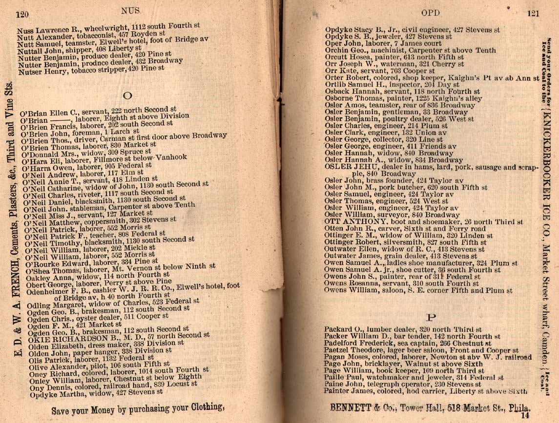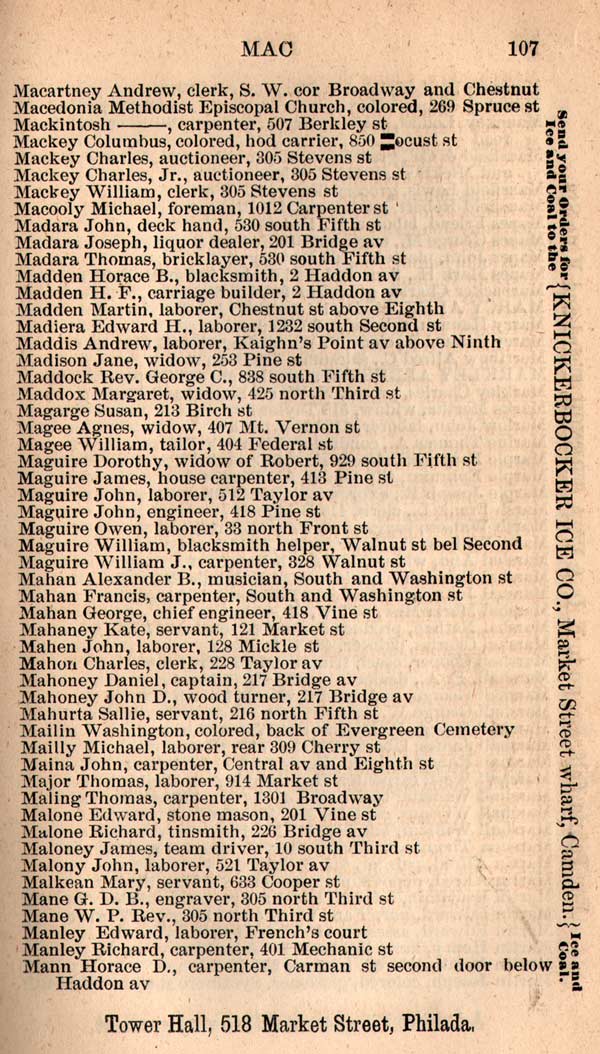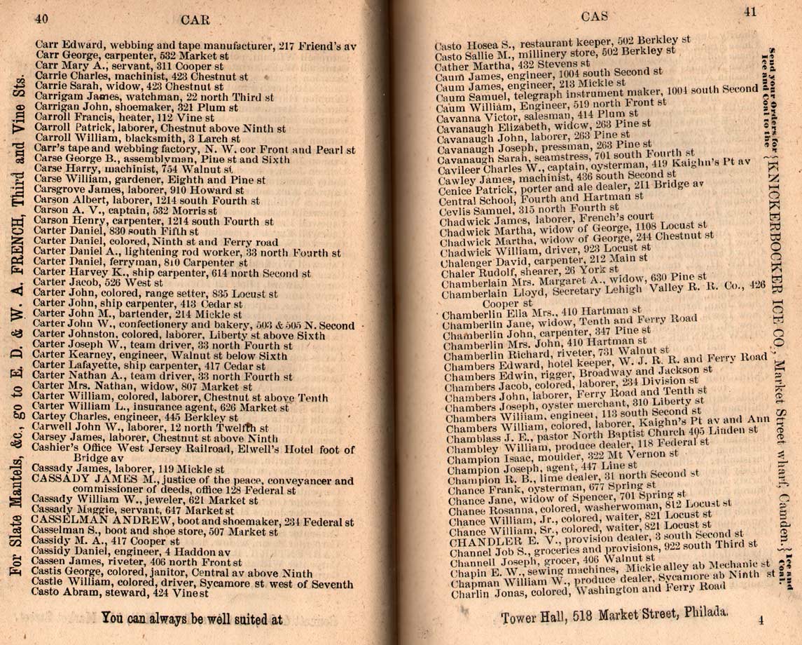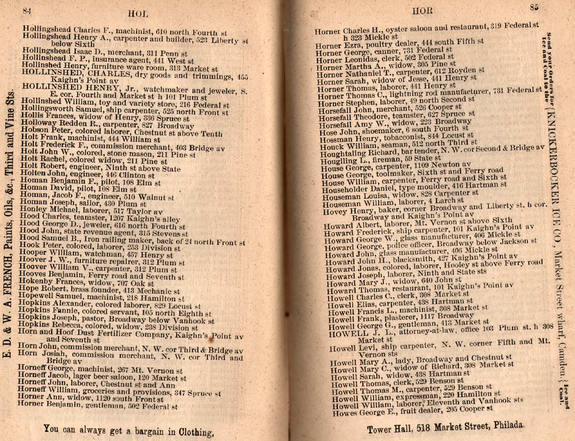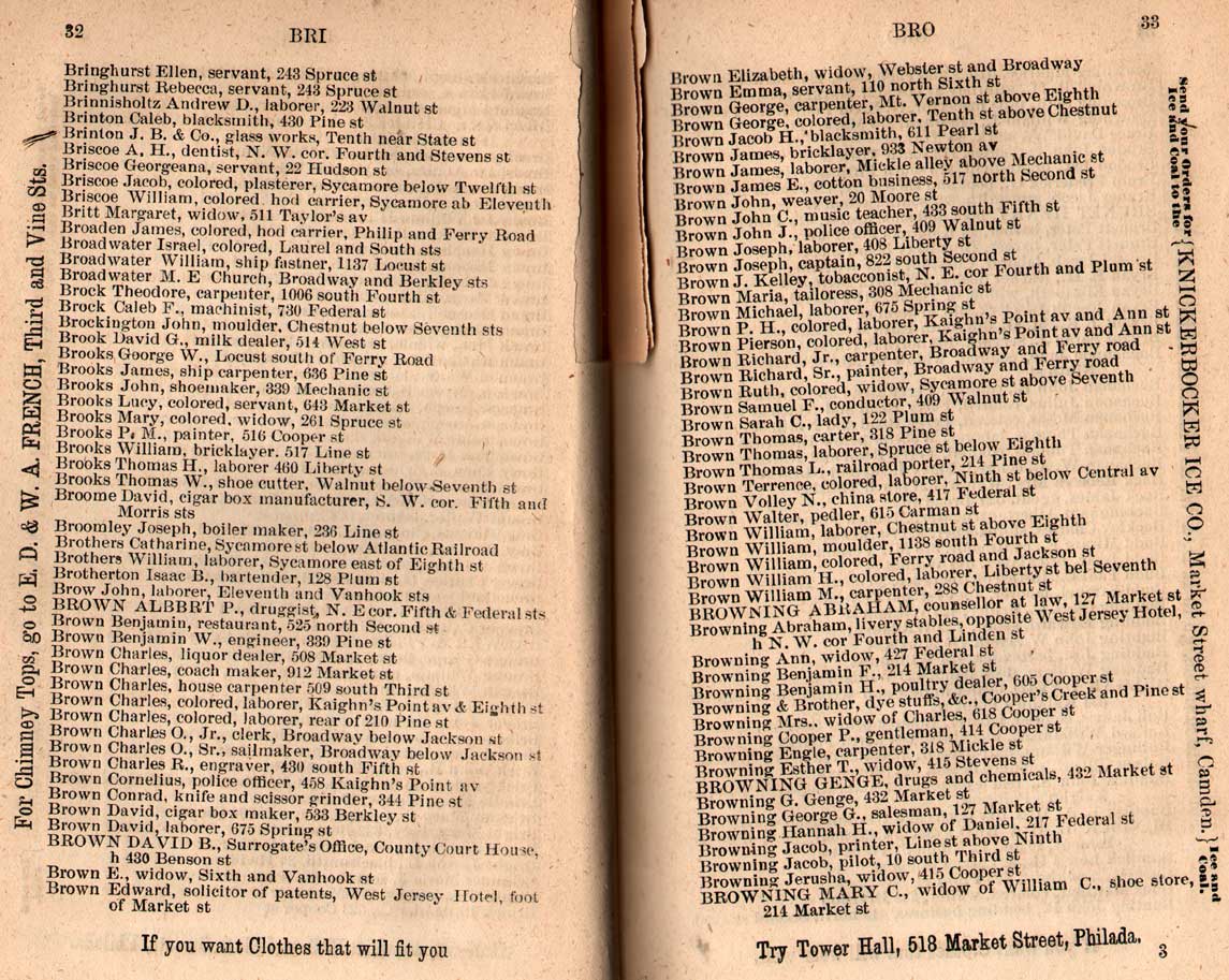 CAMDEN FIRE DEPARTMENT The affairs of this Department are now controlled by a Board of Fire Commissioners, consisting of Thomas A. Wilson, President, John Read, Jehu Osler, Jonathan Kirkbride, Rudolphus Bingham. Two second class Amoskeag Engines, two 2 wheel hose carts, one 4 wheel hose carriage and one hook and ladder truck constitutes the apparatus of the city. No. 1 engine and hose cart is located at No. 409 Pine street, first fire district; No. 2 engine, cart and extra carriage and hook and ladder truck, located at Fifth and Plum street, in the second fire district. The apparatus and company in the first district is under the immediate charge of William W. Mines; Assistant Marshal; and those of the second district is under the immediate charge of William Shearman, Assistant Marshal, while the Chief Fire Marshal, Robert S. Bender, has a general supervisory care of the entire Department. Members of the Department are as follows: engineer of No. 1, Reuben G. Turner [G. Rudolph Tenner –PMC]; driver, George Libeck [George Leibecke –PMC]; stoker, Thomas McLaughlin. Extra men- No. 1, Benjamin Cavanaugh; No. 2, William Deiths [william deith- PMC]; No. 3, George Horneff; No. 4, Stephen Thomas; No. 5 Edward H. Mead; No. 6, Charles H. Hart; No. 7, George B. Hart; No. 8, Alexander Peacock; No. 9, Samuel S. Buzine; No. 10 William Cox. . Engineer of no. 2, William Osler; driver, Jacob W. Kellum; stoker, Henry Grosscup. Extra men- No. 11, Isaac Middleton; No. 12, Andrew Rabeau; No. 13 Edward Cline [Elwood Cline –pmc]; No. 14, William Davis; No. 15. Joseph Neice [Joseph Nece –PMC]; No. 16, J. Kelley Brown; No. 17, William Alcott; No. 18 jacob app; no. 19, William H. Schwaab; No. 20, William Henry McKeen. Tillerman of hook and ladder Company, Edward J. Dodamead; driver, ______. Extra men- No. 21 Charles M. Baldwin; No. 22, Edward Shaw; No. 23, Josiah Davis; No. 24. William C. Lee; No. 25, James M. Lane; No. 26, James Cassidy; No. 27, Edward T. James; No. 28. Thomas W. McCowan ; No. 29, Charles Elfreth; No. 30, Theodore Verlander. |