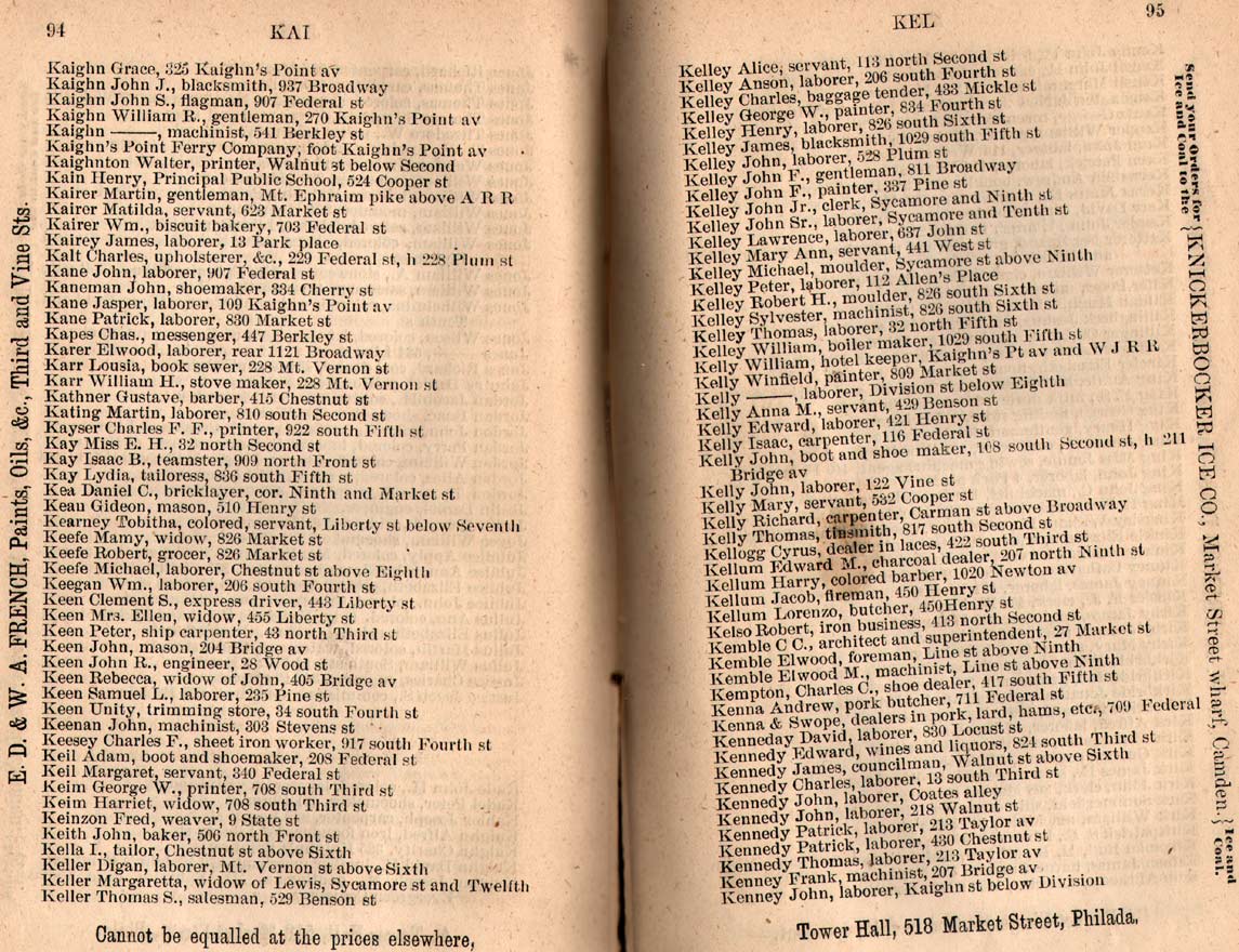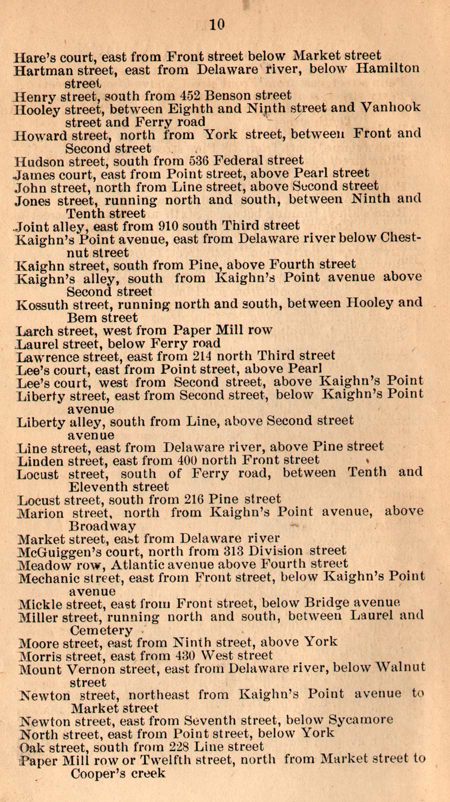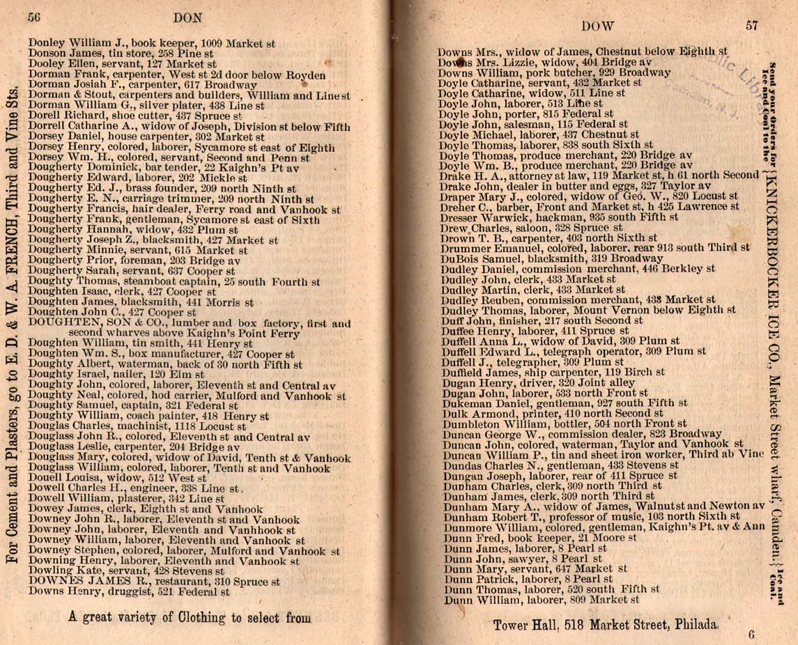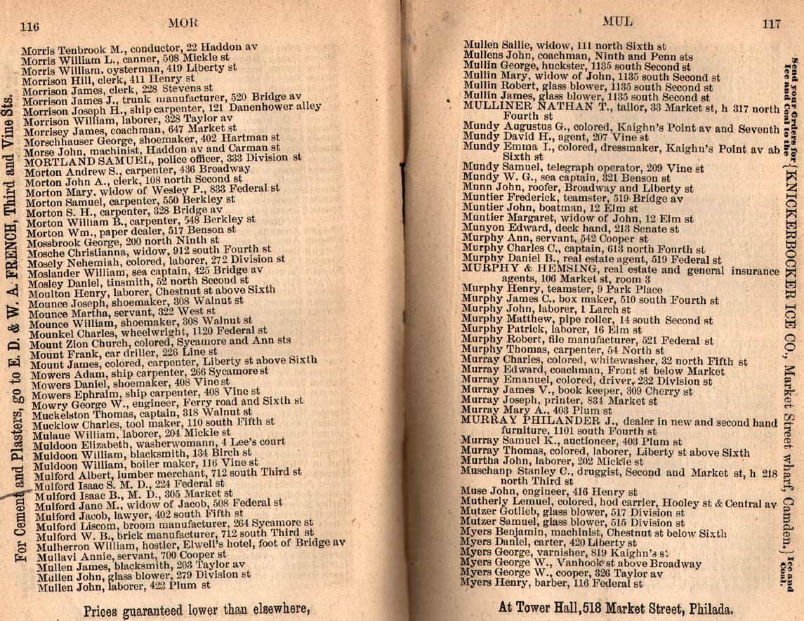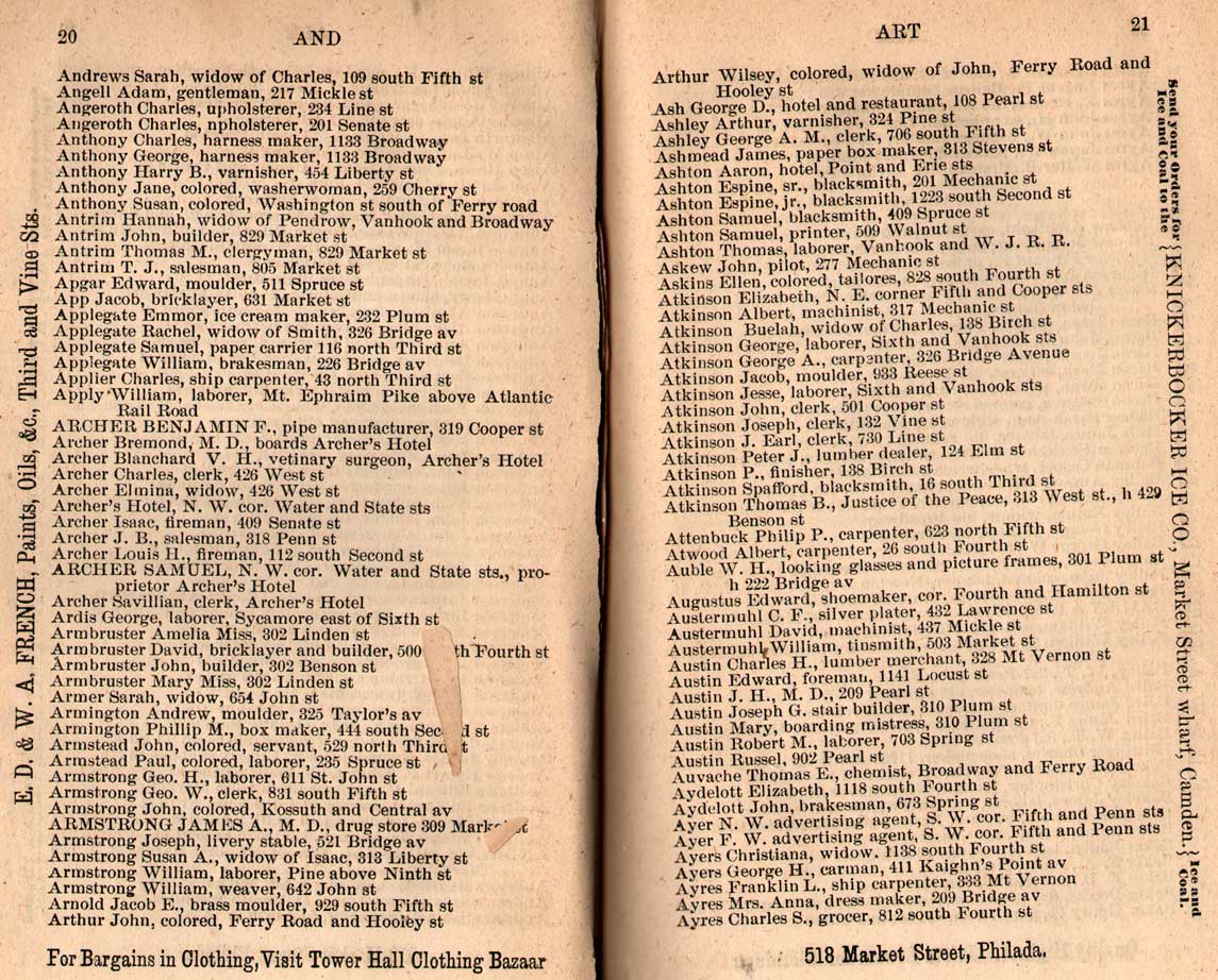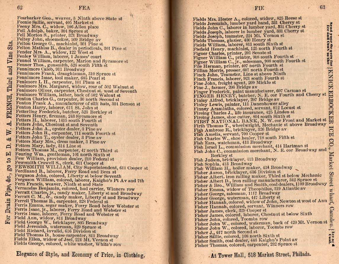 CAMDEN FIRE DEPARTMENT The affairs of this Department are now controlled by a Board of Fire Commissioners, consisting of Thomas A. Wilson, President, John Read, Jehu Osler, Jonathan Kirkbride, Rudolphus Bingham. Two second class Amoskeag Engines, two 2 wheel hose carts, one 4 wheel hose carriage and one hook and ladder truck constitutes the apparatus of the city. No. 1 engine and hose cart is located at No. 409 Pine street, first fire district; No. 2 engine, cart and extra carriage and hook and ladder truck, located at Fifth and Plum street, in the second fire district. The apparatus and company in the first district is under the immediate charge of William W. Mines; Assistant Marshal; and those of the second district is under the immediate charge of William Shearman, Assistant Marshal, while the Chief Fire Marshal, Robert S. Bender, has a general supervisory care of the entire Department. Members of the Department are as follows: engineer of No. 1, Reuben G. Turner [G. Rudolph Tenner –PMC]; driver, George Libeck [George Leibecke –PMC]; stoker, Thomas McLaughlin. Extra men- No. 1, Benjamin Cavanaugh; No. 2, William Deiths [william deith- PMC]; No. 3, George Horneff; No. 4, Stephen Thomas; No. 5 Edward H. Mead; No. 6, Charles H. Hart; No. 7, George B. Hart; No. 8, Alexander Peacock; No. 9, Samuel S. Buzine; No. 10 William Cox. . Engineer of no. 2, William Osler; driver, Jacob W. Kellum; stoker, Henry Grosscup. Extra men- No. 11, Isaac Middleton; No. 12, Andrew Rabeau; No. 13 Edward Cline [Elwood Cline –pmc]; No. 14, William Davis; No. 15. Joseph Neice [Joseph Nece –PMC]; No. 16, J. Kelley Brown; No. 17, William Alcott; No. 18 jacob app; no. 19, William H. Schwaab; No. 20, William Henry McKeen. Tillerman of hook and ladder Company, Edward J. Dodamead; driver, ______. Extra men- No. 21 Charles M. Baldwin; No. 22, Edward Shaw; No. 23, Josiah Davis; No. 24. William C. Lee; No. 25, James M. Lane; No. 26, James Cassidy; No. 27, Edward T. James; No. 28. Thomas W. McCowan ; No. 29, Charles Elfreth; No. 30, Theodore Verlander. |