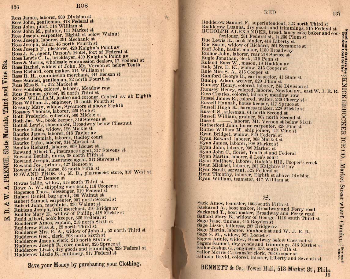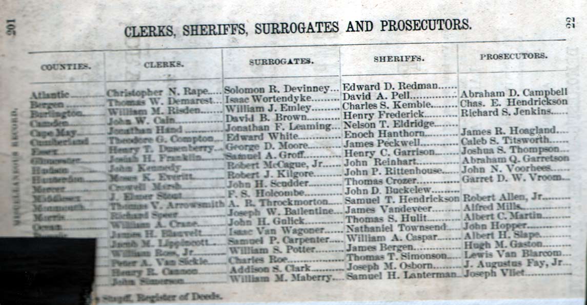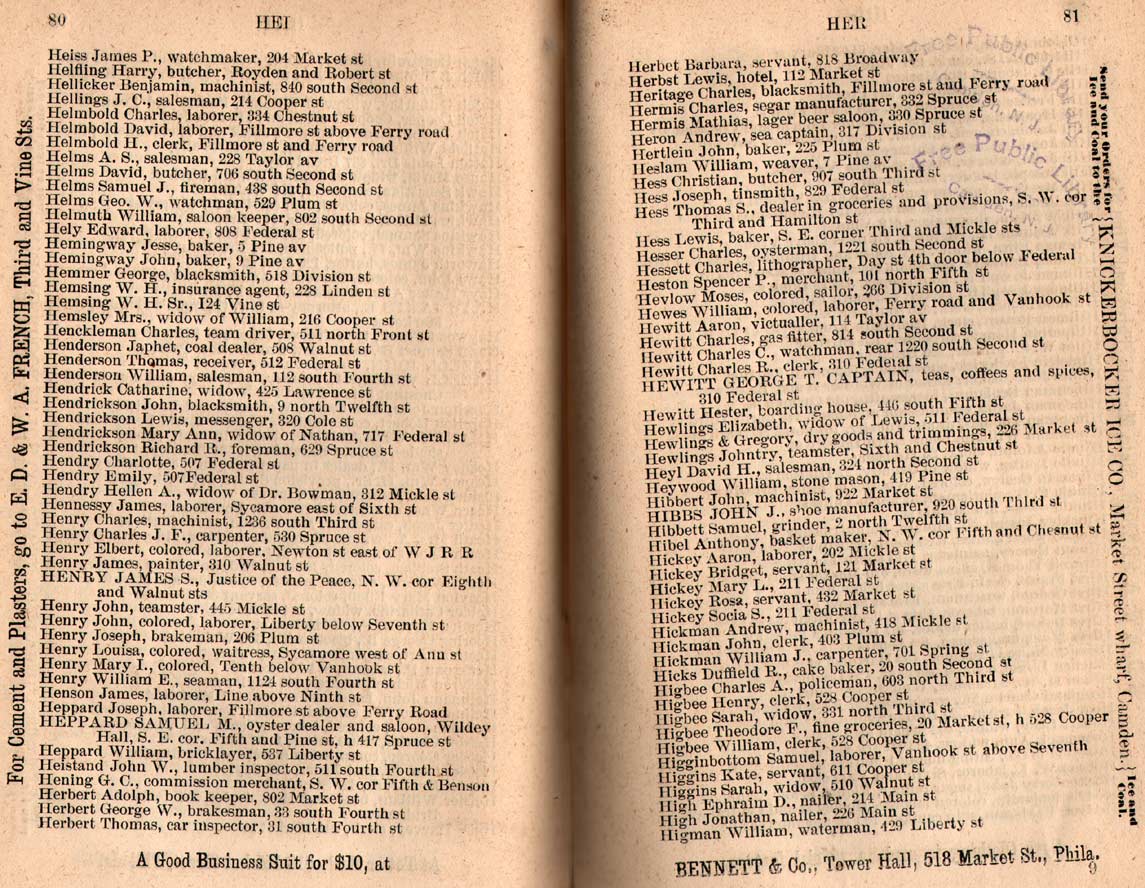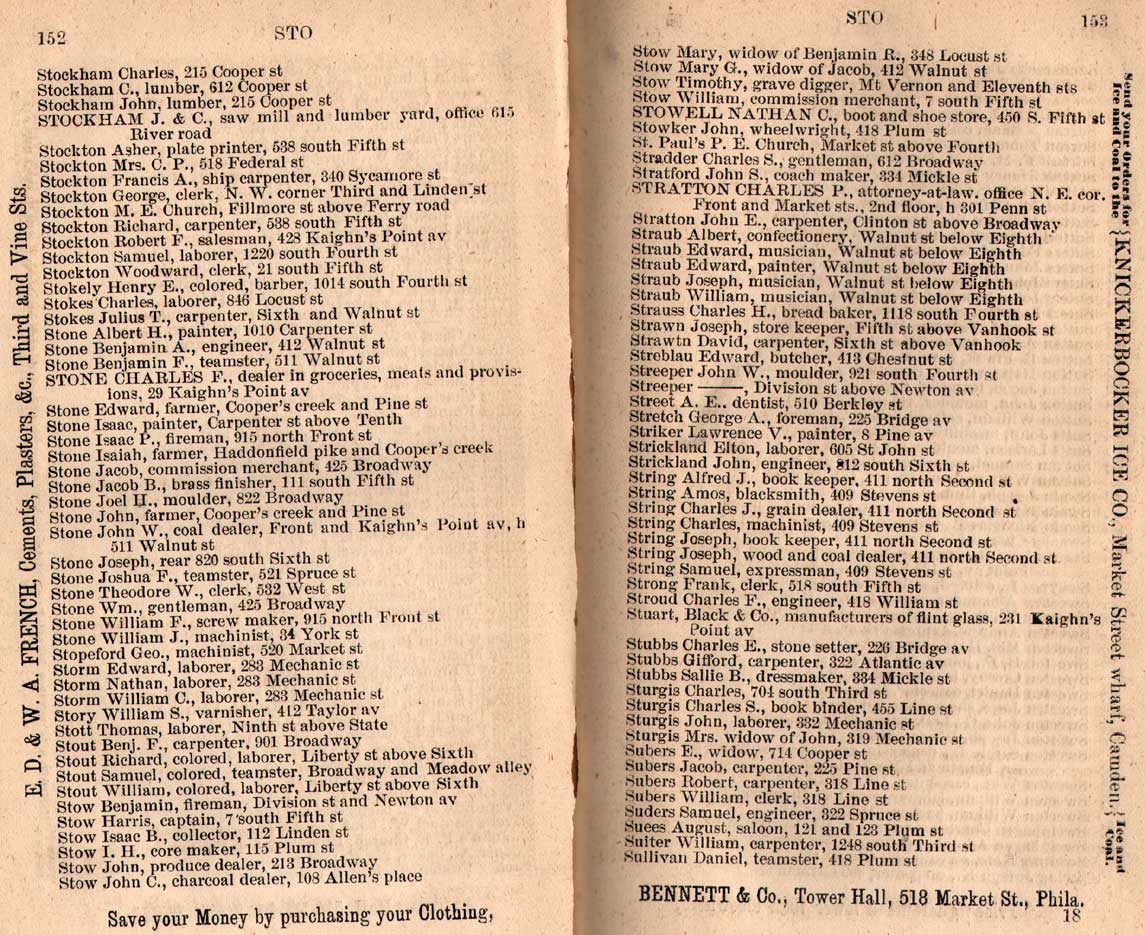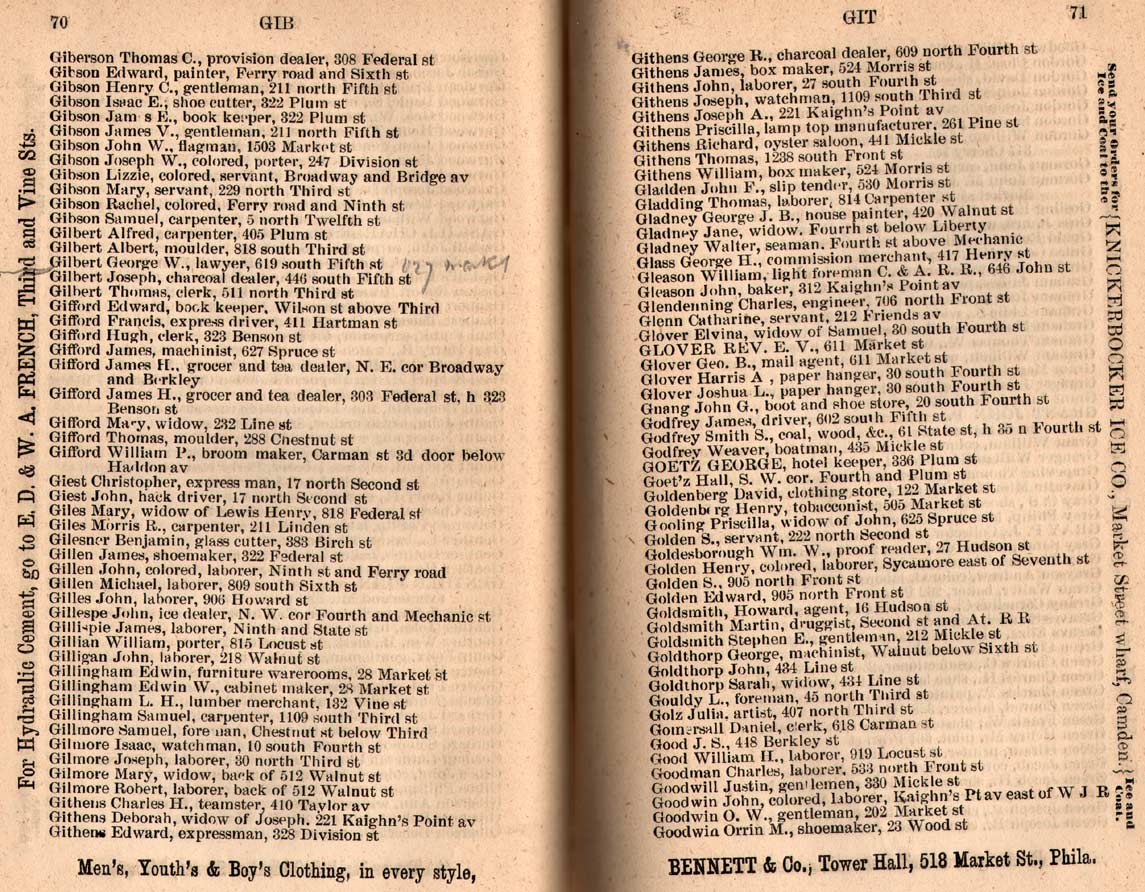 CAMDEN FIRE DEPARTMENT The affairs of this Department are now controlled by a Board of Fire Commissioners, consisting of Thomas A. Wilson, President, John Read, Jehu Osler, Jonathan Kirkbride, Rudolphus Bingham. Two second class Amoskeag Engines, two 2 wheel hose carts, one 4 wheel hose carriage and one hook and ladder truck constitutes the apparatus of the city. No. 1 engine and hose cart is located at No. 409 Pine street, first fire district; No. 2 engine, cart and extra carriage and hook and ladder truck, located at Fifth and Plum street, in the second fire district. The apparatus and company in the first district is under the immediate charge of William W. Mines; Assistant Marshal; and those of the second district is under the immediate charge of William Shearman, Assistant Marshal, while the Chief Fire Marshal, Robert S. Bender, has a general supervisory care of the entire Department. Members of the Department are as follows: engineer of No. 1, Reuben G. Turner [G. Rudolph Tenner –PMC]; driver, George Libeck [George Leibecke –PMC]; stoker, Thomas McLaughlin. Extra men- No. 1, Benjamin Cavanaugh; No. 2, William Deiths [william deith- PMC]; No. 3, George Horneff; No. 4, Stephen Thomas; No. 5 Edward H. Mead; No. 6, Charles H. Hart; No. 7, George B. Hart; No. 8, Alexander Peacock; No. 9, Samuel S. Buzine; No. 10 William Cox. . Engineer of no. 2, William Osler; driver, Jacob W. Kellum; stoker, Henry Grosscup. Extra men- No. 11, Isaac Middleton; No. 12, Andrew Rabeau; No. 13 Edward Cline [Elwood Cline –pmc]; No. 14, William Davis; No. 15. Joseph Neice [Joseph Nece –PMC]; No. 16, J. Kelley Brown; No. 17, William Alcott; No. 18 jacob app; no. 19, William H. Schwaab; No. 20, William Henry McKeen. Tillerman of hook and ladder Company, Edward J. Dodamead; driver, ______. Extra men- No. 21 Charles M. Baldwin; No. 22, Edward Shaw; No. 23, Josiah Davis; No. 24. William C. Lee; No. 25, James M. Lane; No. 26, James Cassidy; No. 27, Edward T. James; No. 28. Thomas W. McCowan ; No. 29, Charles Elfreth; No. 30, Theodore Verlander. |