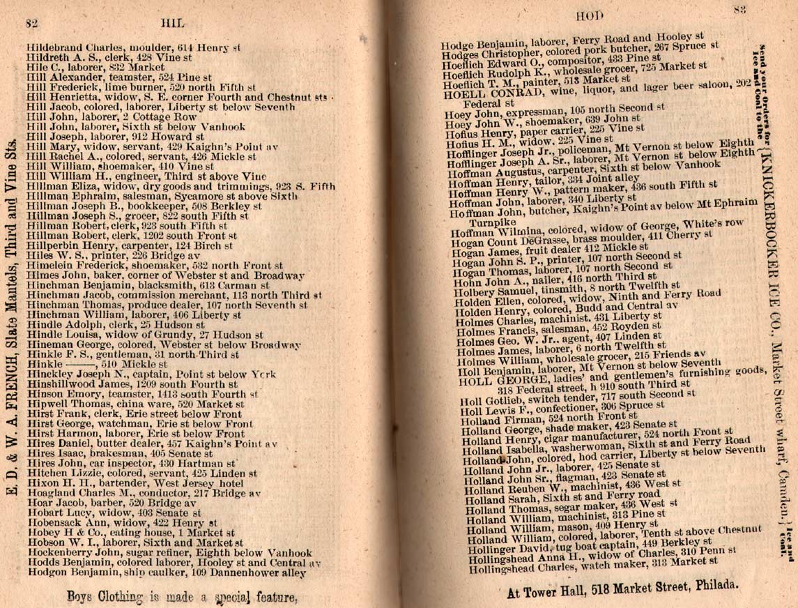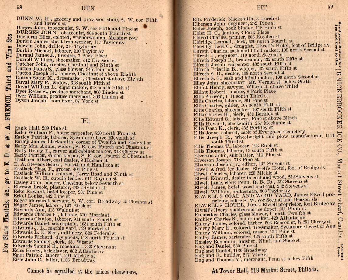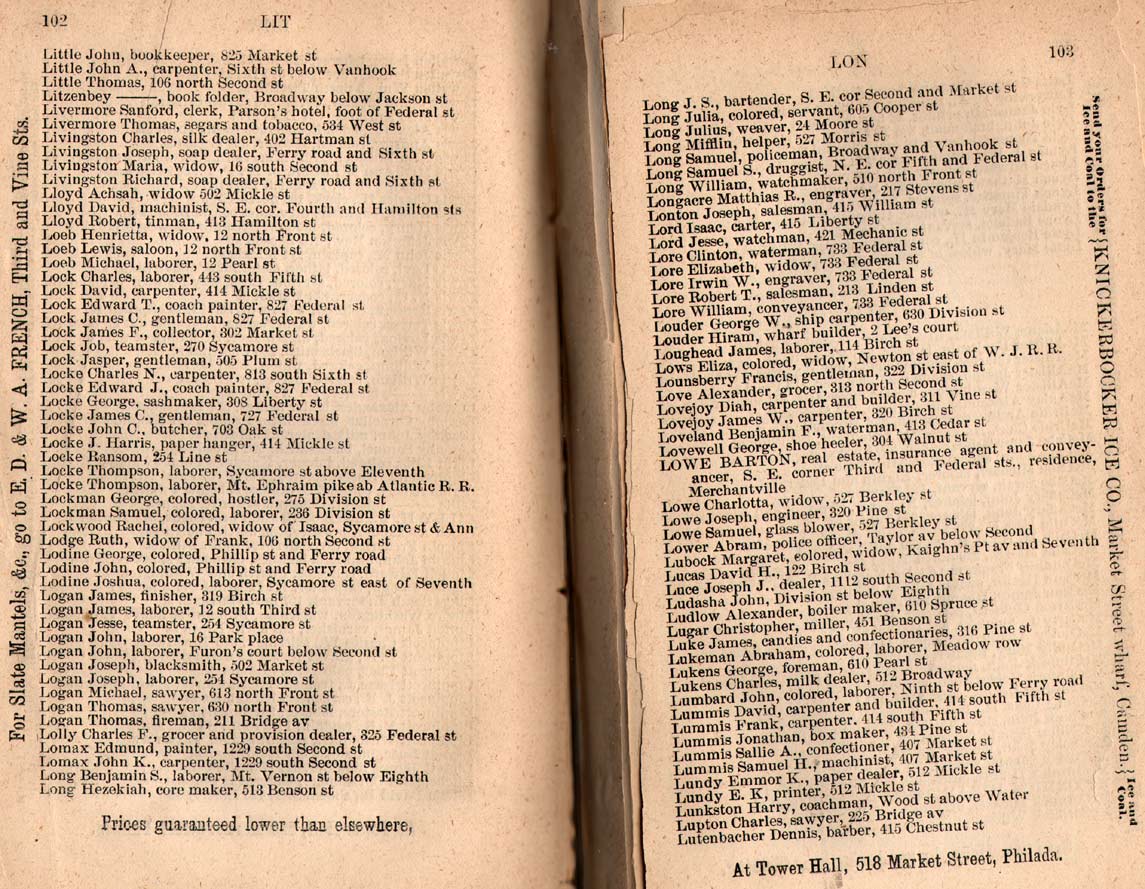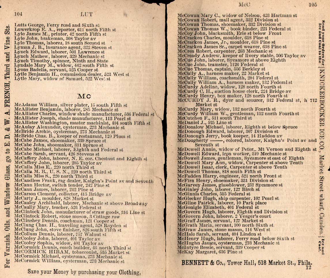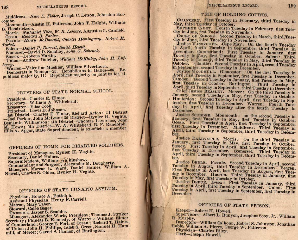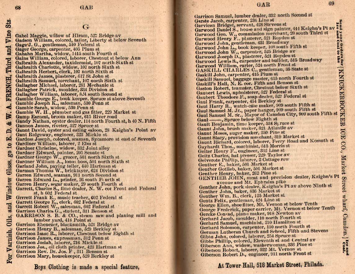 CAMDEN FIRE DEPARTMENT The affairs of this Department are now controlled by a Board of Fire Commissioners, consisting of Thomas A. Wilson, President, John Read, Jehu Osler, Jonathan Kirkbride, Rudolphus Bingham. Two second class Amoskeag Engines, two 2 wheel hose carts, one 4 wheel hose carriage and one hook and ladder truck constitutes the apparatus of the city. No. 1 engine and hose cart is located at No. 409 Pine street, first fire district; No. 2 engine, cart and extra carriage and hook and ladder truck, located at Fifth and Plum street, in the second fire district. The apparatus and company in the first district is under the immediate charge of William W. Mines; Assistant Marshal; and those of the second district is under the immediate charge of William Shearman, Assistant Marshal, while the Chief Fire Marshal, Robert S. Bender, has a general supervisory care of the entire Department. Members of the Department are as follows: engineer of No. 1, Reuben G. Turner [G. Rudolph Tenner –PMC]; driver, George Libeck [George Leibecke –PMC]; stoker, Thomas McLaughlin. Extra men- No. 1, Benjamin Cavanaugh; No. 2, William Deiths [william deith- PMC]; No. 3, George Horneff; No. 4, Stephen Thomas; No. 5 Edward H. Mead; No. 6, Charles H. Hart; No. 7, George B. Hart; No. 8, Alexander Peacock; No. 9, Samuel S. Buzine; No. 10 William Cox. . Engineer of no. 2, William Osler; driver, Jacob W. Kellum; stoker, Henry Grosscup. Extra men- No. 11, Isaac Middleton; No. 12, Andrew Rabeau; No. 13 Edward Cline [Elwood Cline –pmc]; No. 14, William Davis; No. 15. Joseph Neice [Joseph Nece –PMC]; No. 16, J. Kelley Brown; No. 17, William Alcott; No. 18 jacob app; no. 19, William H. Schwaab; No. 20, William Henry McKeen. Tillerman of hook and ladder Company, Edward J. Dodamead; driver, ______. Extra men- No. 21 Charles M. Baldwin; No. 22, Edward Shaw; No. 23, Josiah Davis; No. 24. William C. Lee; No. 25, James M. Lane; No. 26, James Cassidy; No. 27, Edward T. James; No. 28. Thomas W. McCowan ; No. 29, Charles Elfreth; No. 30, Theodore Verlander. |