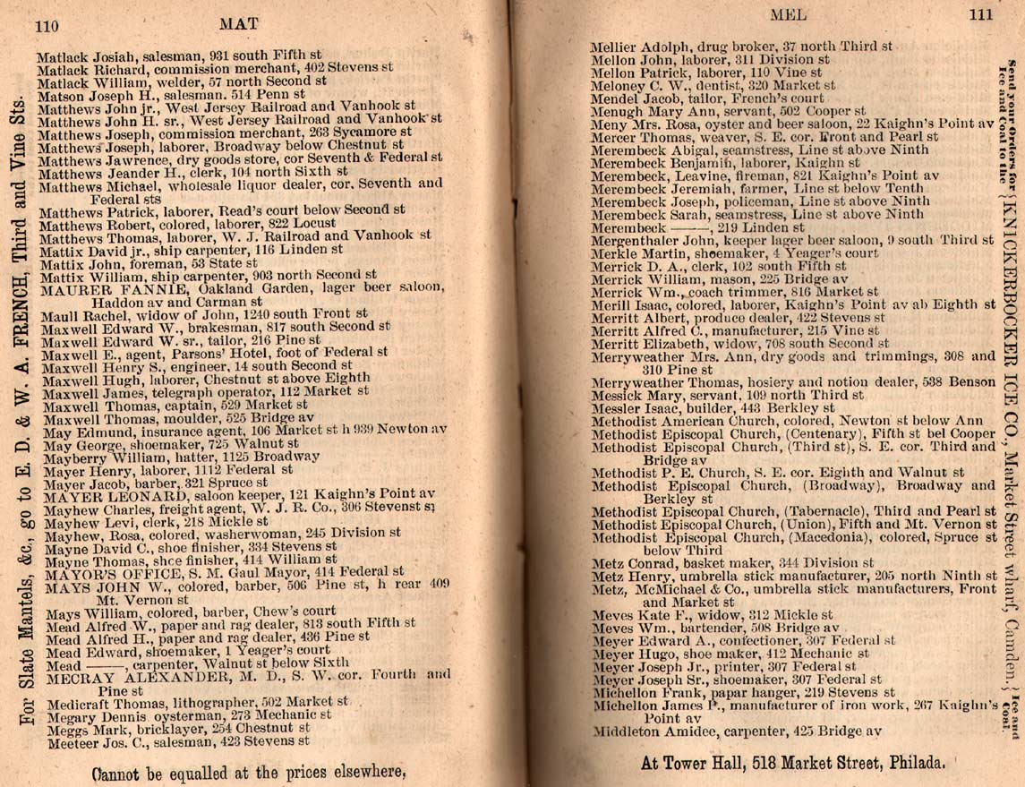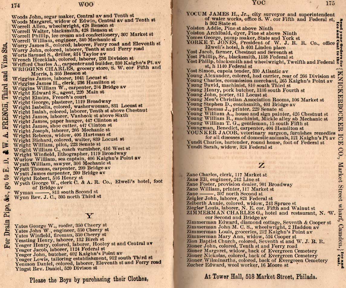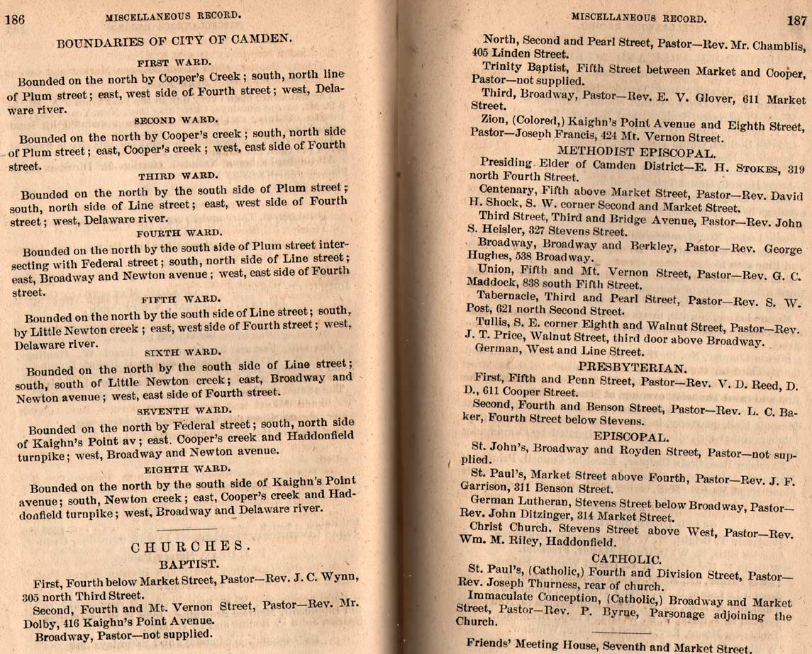 (Colored), Kaighn's Point Avenue and Eighth Street, METHODIST EPISCOPAL Presiding. Elder of Camden District- E. H. STOKES, 319 North Fourth Street. Centenary,