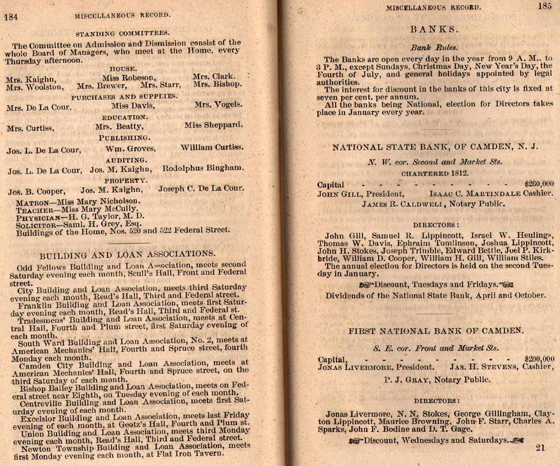 Clark. PURCHASES AND SUPPLIES Mrs. De La Cour, Miss Davis, Mrs. Vogels. EDUCATION Mrs. Curtiss, Mrs. Beatty, Miss Sheppard. PUBLISHING Jos. L. De La Cour, William. Groves, William Curtiss. AUDITING Jos. L. De La Cour, Jos. M. Kaighn, Rodolphus Bingham. PROPERTY Jos. B. Cooper, Jos. M. Kaighn, Joseph C. De La Cour