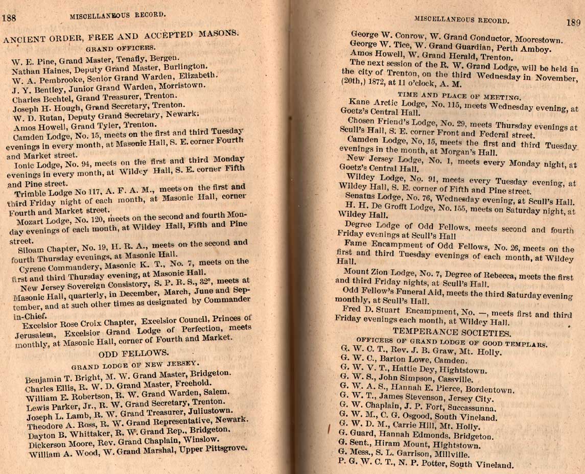 Free & Accepted Masons - Camden Lodge No 15 ionic lodge no. 94 - Trimble Lodge No. 117 - Mozart Lodge No. 120 Siloam Chaper - Cyrene Commandery - New Jersey Soveriegn Consisttory - Excelsior Rose Croix Chapter |