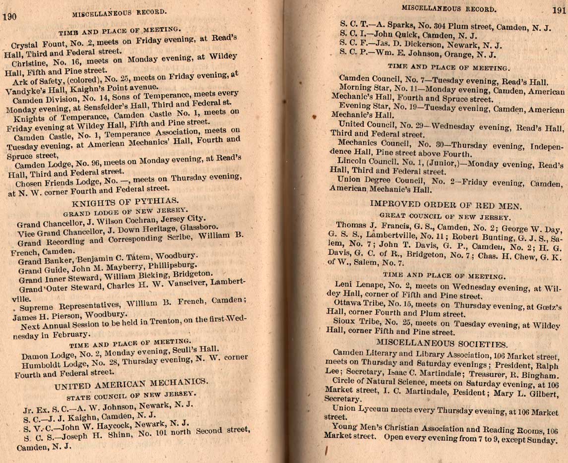 William B. French - John Quick - Thomas J. Francis - John T. Davis Dr. Isaac C. Martindale - Ralph Lee -Rodolphus Bingham - Mary L. Gilbert Young Men's Christian Association Y.M.C.A. - Knights of Pythias - United American Mechanics |