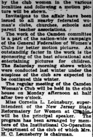 SELF-GOVERNMENT, RELIGION BACKBONE OF REFORMATORY FOR WOMEN, DECLARES HEAD Mrs. Mather, prominent club woman, is regent of the Nassau Chapter, Daughter of the American Revolution, and takes an active part in the Camden Woman’s Club. Mrs. Mather makes her home in Merchantville. The cooperative government system and the religious life of the New Jersey State Reformatory for Women form the backbone of the institution, according to Miss Cordelia Lounsberry, who spoke before the Camden Woman’s Club, at a meeting in the clubhouse, 636 Linden Street, yesterday afternoon. Miss Lounsberry is the superintendent of the institution situated at Clinton. Ranging in age from 16 to 60, women from all parts of the state are committed to the reformatory for any charge from misdemeanor to first-degree murder, Miss Lounsberry explained. “We regard the work in the institution educational from a physical as well as a mental standpoint,” the superintendent continued. “Through our cooperative system we teach the women ideals of honor and fairness and the system has proved more effective than any I have ever seen exercised in schools and colleges.” “Religious services conducted in the chapel of the church each Sunday have a great influence on the majority of the women,” Miss Lounsberry stated. The superintendent also declared important as part of the institutions work the domestic service course where the women are taught cooking, sewing, cleaning, as well as outdoor work. Sixty percent of the women committed to the institution are feeble-minded and rightly belong in other institutions which are too crowded to care for them,” Miss Lounsberry stated. Mrs. A. Hanes Lippincott, president, was in the chair for the business session, when first reading of the revision of by-laws in the club constitution was heard. The Art Department, under the chairmanship of Hugh M. Condie, is arranging the next regular meeting of the club scheduled for Monday, January 23. Mrs. Thomas Flockhart, chairmen of Art of the New Jersey Federation of Woman’s Clubs, will be the principal speaker and works of several prominent artists will be on exhibit. |