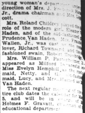 Miss E. McCreight Music Section reported one hundred twenty-eight (128) Victrola Records sent to our soldier boys. January 1919 the Club voted to raise the Initiation Fee to $5.00. One reason for this was the fact that new members coming in became sharers with the already established members in the Club holdings and it seemed a fair measure. At this meeting the pet hobby of the President was acted upon, that of having a junior section, at her suggestion it was voted that for especial time, all the young girls who had so cheerfully and interestingly entertained us, should be admitted to membership without the necessity of the usual formal proposing and endorsement and that their dues for this year should be one-half the usual sum. Twelve of the dear girls responded. Our Club endorsed a movement of the Hatch Post. G.A.R., protesting against the removal of Civil War flags from the rotunda of the capital. March 31st, 1919 petition forwarded to the committee in charge of soldier’s Memorial asking that it take the form of a Community House. April 10th. Donation of Ten Dollars ($10.00) to State Federation Endowment Fund. The general work of the Club has been Literary and Civic, we have had numerous reviews of contemporary literature, have had many active and successful committees on civic improvements. Patriotic entertainments, with guests who might be helpfully impressed, have been a feature of nearly every session’s program, also educational and dramatic features have formed part of the work since the Club’s inception. Whenever members traveled, at home or abroad, they were called upon for an account of their trips, thus lending the valuable personal touch which is of so much interest. These personal recollections have included England, Norway, Sweden, Germany, France, Belgium, Holland, Italy, Japan, Bermuda, Canada, Jerusalem, our own different States and other places. An annual tree planting has become in later years a part of the regular program. When the war overtook us, our printed programs were omitted as a thrift measure and Liberty Bonds, to the amount of $500.00, were bought by the Club. At the close of this administration there were assets in the Building Fund to the amount of $1490.66, with $170.26 added during the summer, making a total of $1660.92 at the time of publication of this little history. This fund was started in 1912 at the instance of mrs. mather, who had the owning of our own headquarters much to heart and had hoped to have it reach fruition in her administration, but during the war, of course, little could be done to increase the amount, and mrs. mather, herself the Club’s War president, was fully occupied as Director of the Production Department in the County Red Cross, where many of the Club members were also willing volunteers. Whole-souled service these women gave day and night, but will now soon return to try to make their Club the best one ever. May election the following officers were elected: Mrs. George Bradley, President; Mrs. Holmes Gravatt, First Vice President; Mrs. Lulu S. Read, Second Vice President; Mrs. J.S. Hackett, Corresponding Secretary; Mrs. Austin Clark, Treasurer, and Directors Mrs. H. Marter, Mrs. John F. Harned, Mrs. John A. Mather Jr., Mrs. A. Haines Lippincott, Mrs. Joshua C. Haines, and Mrs. Wilbert L. Sweeten. Annual Outing was a trip to the Navy Yard, Philadelphia, with a lunch at the Hotel Walton. |