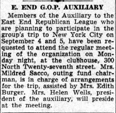 The Ladies Auxiliary to the East End Republican League, 300 North Twenty-seventh Street, will hold its regular business meeting on Monday night. Mrs. Reba Raymore will preside and Mrs. Bertha Clayton, outing fund chairman, will be in charge of social arrangements.
