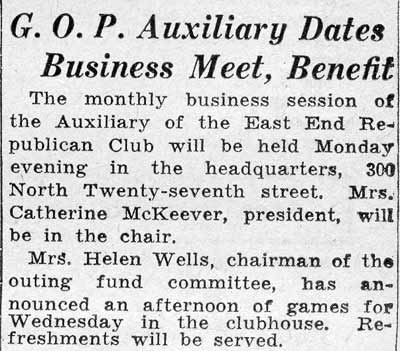 G. O. P. WOMEN TO MEET The monthly social session of the Women's Auxiliary of the Twelfth Ward Republican Club will be held on Monday evening at the headquarters, 300 North Twenty-seventh Street. Mrs. Mercy Bolton is arranging a surprise program for the evening. Refreshments will be served. |