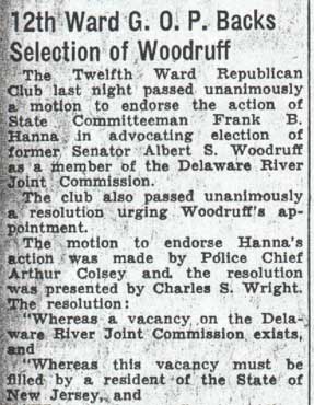 Prior to the 1899 merger with Camden, the town of Stockton, which comprised of what is know known as Cramer Hill and East Camden, had a very active, to put it mildly, political scene. After the merger, Cramer Hill became Camden's Eleventh Ward, while East Camden became the Twelfth Ward. Jacob "Jake" Schiller was one of the leading Republicans of the 1890s Stockton-era and remained a force in East Camden Republican politics through the mid-1920s. The 1906 Camden City Directory shows the Twelfth Ward Republican Club at 2508 Federal Street. Their also was another Republican group, the East End Republican Club at 3336 Westfield Avenue, in that year. This group was gone by 1914. The 1914 Camden City Directory reveals that the Twelfth Ward Republican Club had moved to 2311 Federal Street. By 1924 another move had taken place, to William Penn Hall, 300 North 27th Street, where it would remain through at least the summer of 1933. By 1936 the club had reorganized and was then called the East End Republican Club, and was still active and operating at that address as late as 1947, according to the City Directory for that year. The club did operate for a time at 2709 Westfield Avenue around 1938, however. The club is not listed in the 1956 New Jersey Bell Telephone Directory, however. |