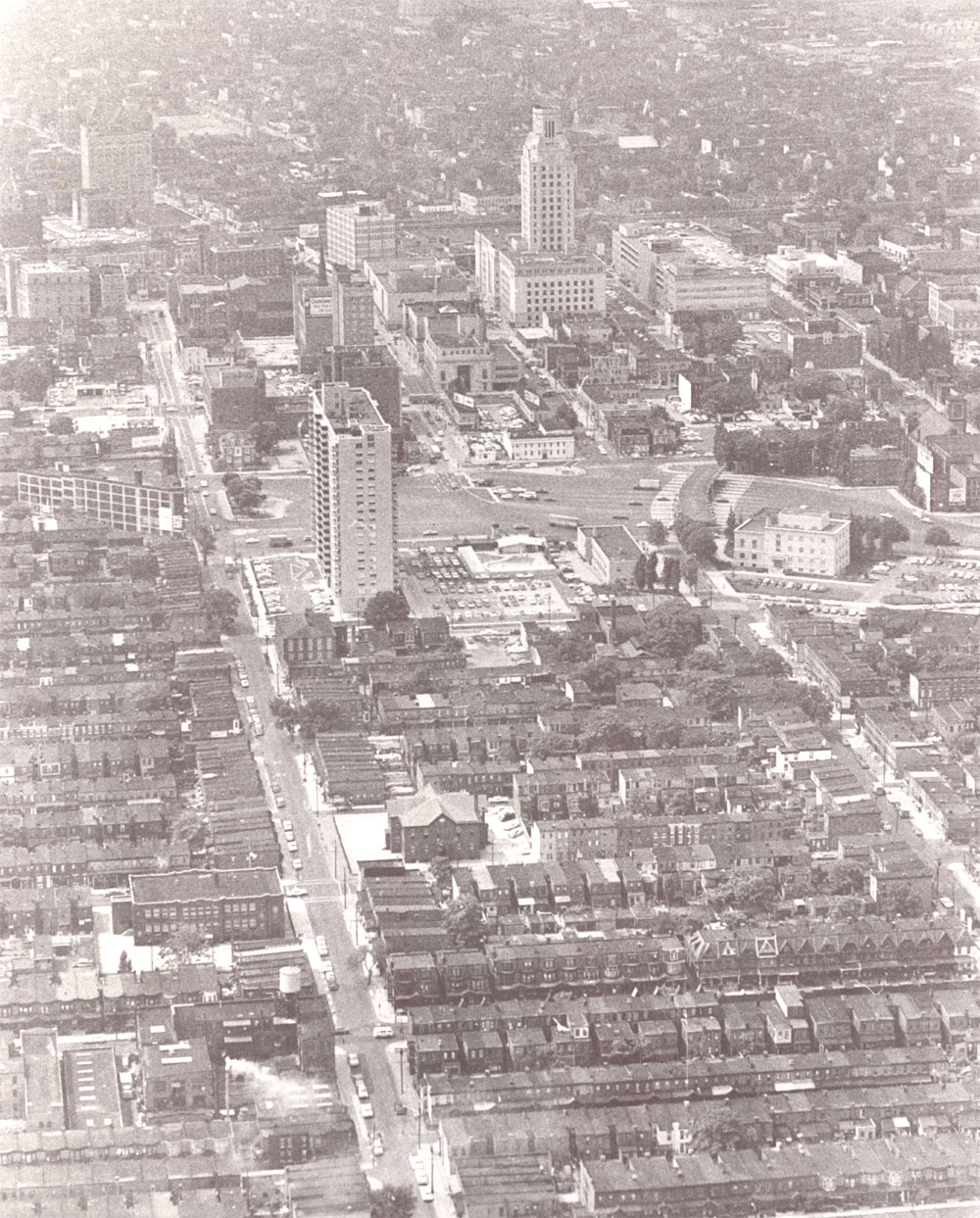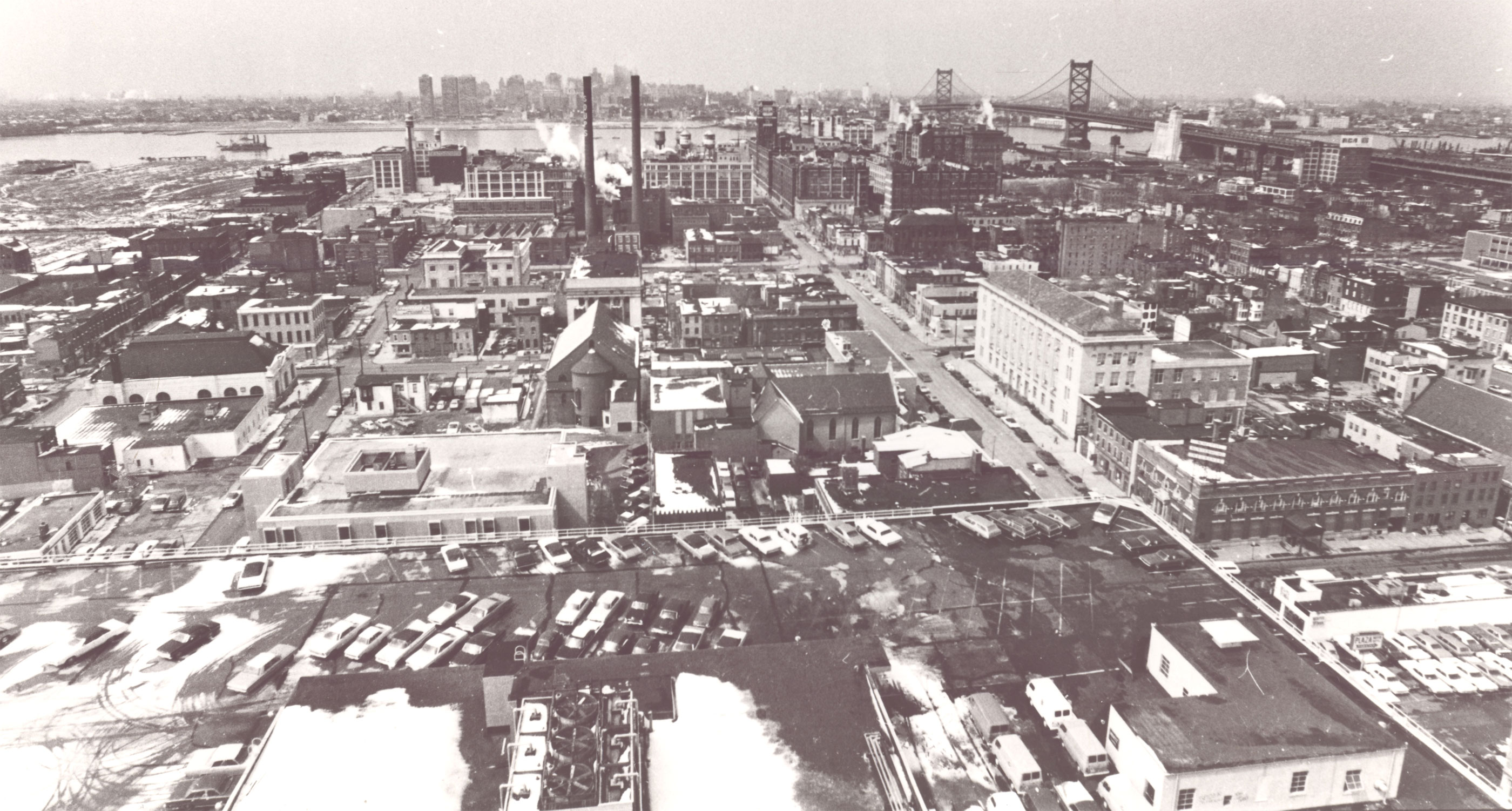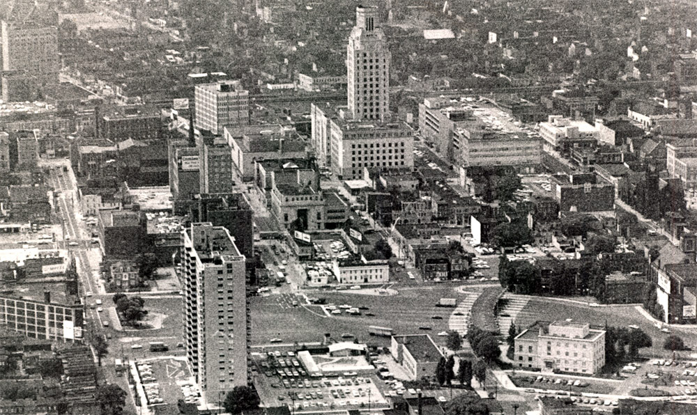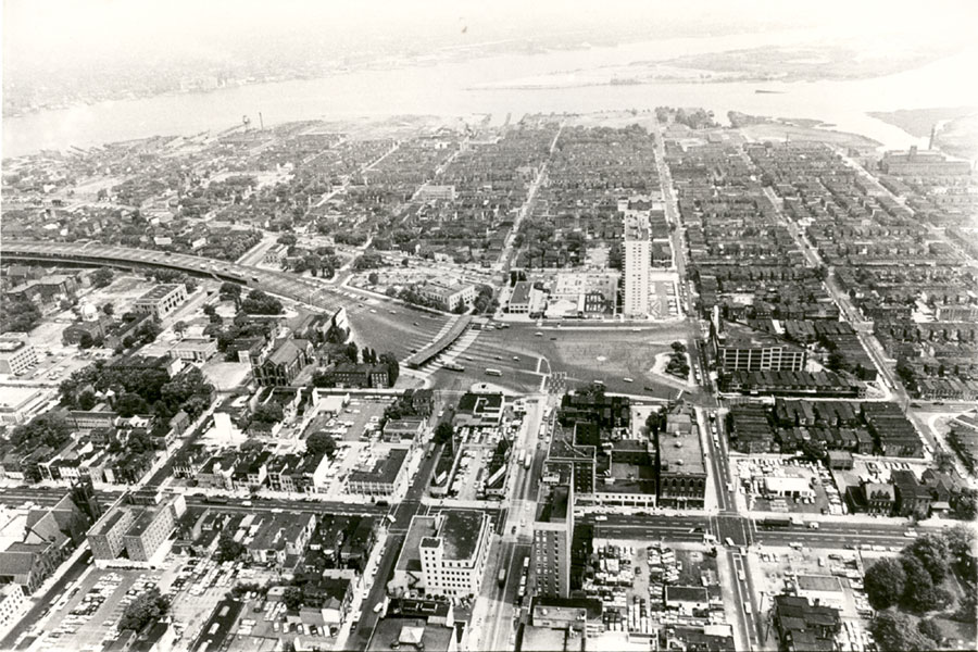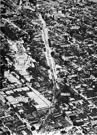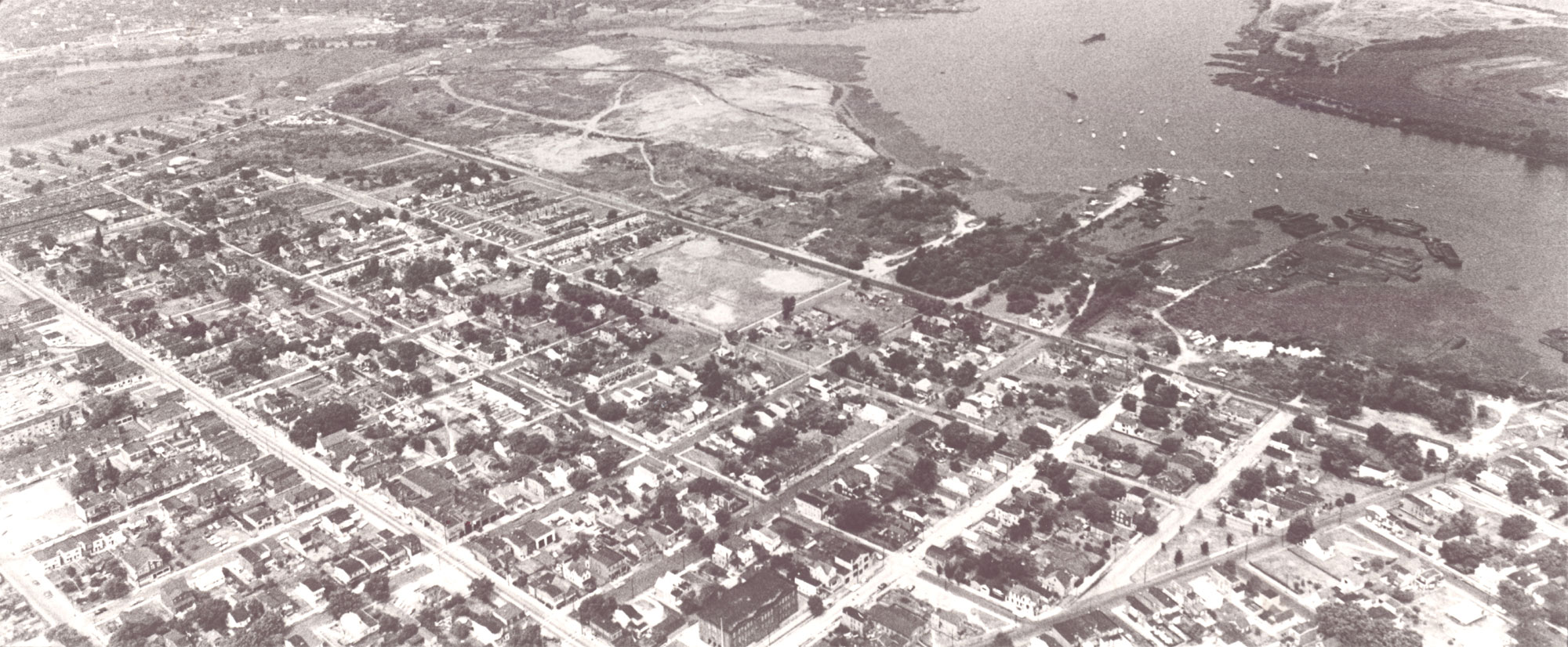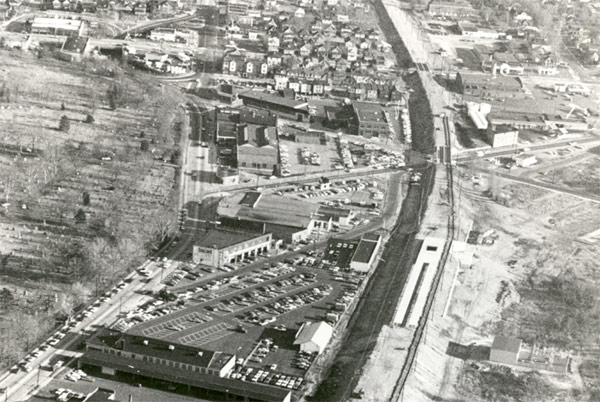 1929 Looking southeast at Intersection Pine Streets, Walnut Street, and Magnolia Avenue Mechling Brothers chemical factory in foreground, Park Boulevard across top |