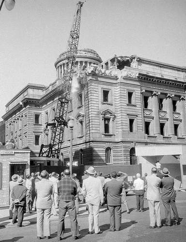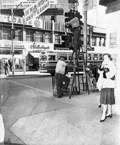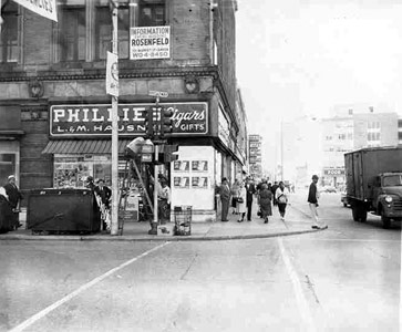 In these photos, dated 1962, two workmen are repairing traffic lights at Broadway and Federal Street. In the left-hand picture, the Parkade Building and the Food Fair grocery is visible. On the right, Chicken Delight, Shellenberger's Candy Store, and HFC Loans on Broadway, in the building that was razed to make way for the Walter Rand Transportation Center and associated stores in the late 1980s. |