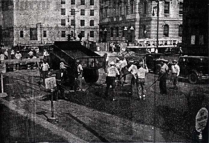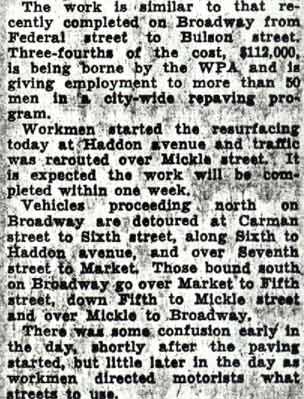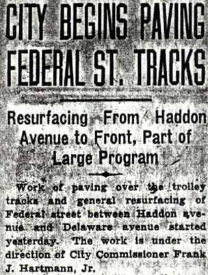 Photo shows workmen at the start of the resurfacing of Federal Street from Haddon Avenue to front Street. The men are seen leveling the asphalt with rakes at Broadway and Federal Street. The work is expected to be completed in a week. It includes covering the trolley tracks on Federal Street, the same as was done on Broadway recently. The project is part of the city-WPA program for repairing Camden streets. During this work vehicles are being detoureed over Market and Mickle Street. |