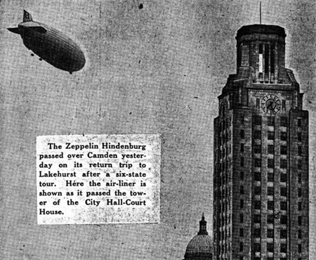The first clock appeared above City Hall in 1876. Camden's new City Hall opened early that year, although the clock was not yet in place. The first town clock in the tower of the City Hall was placed in position in May of 1876. It cost $3,575, and rang out the hours for the first time on May 26, 1876. When the city government determined to build a new City Hall in the late 1920s, the architectural firm of Edwards & Green placed four clocks, one facing in each direction, above the 17th floor. The clocks and the elevator machinery room above it give City Hall an overall height of 22 stories. |