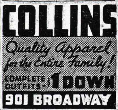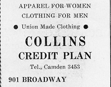 The Collins Clothing Store, where you could buy a suit on credit for a dollar down payment, was at 901 Broadway, the corner of Broadway and Spruce Street, from the 1930s through the 1960s. David Diamond managed the business in the 1930s, after World War II, Henry Laikin and Ray Rickards ran the business. The Collins Store did not survive the 1960s. Declining economic conditions and the vandalism and looting that became known as the riot of 1967 made business impossible for many of the old Broadway merchants. By 1970 the business was no longer listed in the telephone book. |