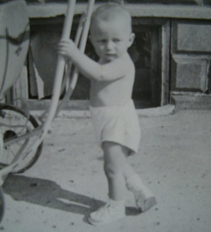"Joey Seddon" in 1944 on 2828 Polk Avenue, pushing the carriage along at 7 months, taken in front of the Hickey house on Polk Avenue, 1944. |