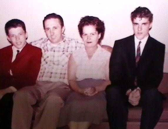 A rare photo with Verna Wilson, who was Garland Wilson's second wife. I took their daughter Margie to her prom as they would not allow her to date anyone or run the streets unaccompanied. This was always a puzzling matter to me and today I understand their well hidden fears. Having lost his wife Helen, son John, and mother-in-law Emma in the Unruh shootings, he was suffering a stress disorder no doubt. We never discussed any of it, thus the weirdness of it. My buddy Zelly of Chapel Heights N.J. As I described to you earlier, on this night I took Margie Wilson to her prom and Bill accompanied her girlfriend. I was 16 at the time, Bill 17. Bill is on the far right, I'm in the red jacket, and dad is beside me. |