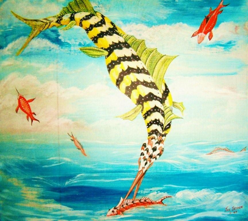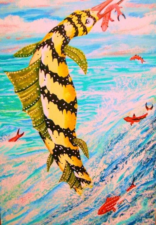 The attempt here was to capture a bit of action, thus the waves rolling down and the fish leaping upward. |