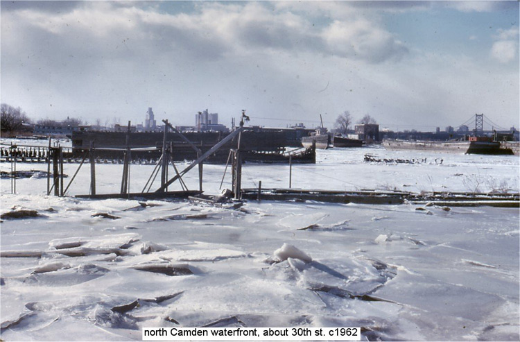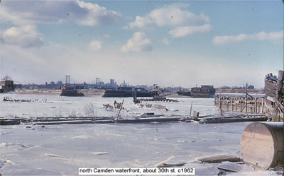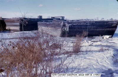 COMMENTS by James Rickenbach The North Camden waterfront photos, "about 30th St., c62"- I do not believe any of these photos were taken around 30th Street. They were all from 27th Street. The images of the barges and other wreckage appear to be between 27th and 25th Street, where the Farragut Club is. The two barges (Sand Lighters as my father called them) appear to be from the boat yard run by my Grandfather and his sons (James Rickenbach, Adam Rickenbach and James M. Rickenbach) at the foot of 27th Street. I used to live directly across the street from the old wooden building. It was at 27th Street and Harrison Avenue. I grew up knowing it as the "Curtain Factory". They made the material for window shades for a company in Philadelphia. It was run by the Ott family. My father grew up in the same house and he said the entire river front lot across the street was a family type park when he was young. The wooden building was originally a dance hall. It later became a nickelodeon. |