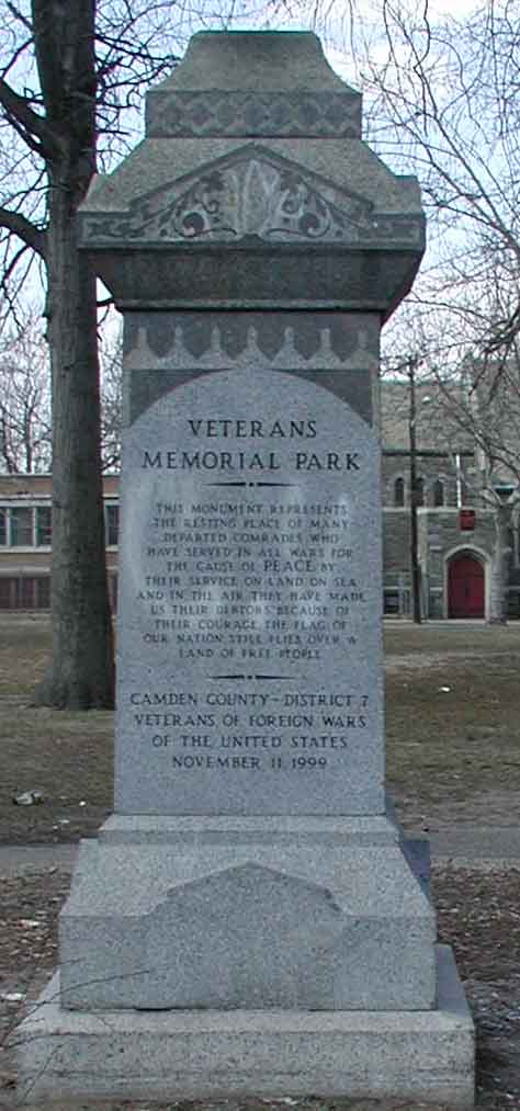 The two photos of the cannon in Vets Park: Looking at the one on the left, facing the school, I remember there had been a sidewalk that ran from the circle and monument in the center of the park, down to 26th St. It would have been between the cannon and that large tree, in the left hand photo. On each side of the sidewalk, spaced about 2 feet apart, were small bronze plaques mounted on stone blocks. Each one had the name, rank, service, and date killed, for veterans killed in WWII. In addition, on each side, just down from the circle (near the cannon and tree), were two larger bronze plaques, about 3 ft X 4 ft. They commemorated either men or units from WWII, but I can't recall the lettering. If you look at the right hand photo of the cannon (with the Church in the background), you can see the spot where one of the large plaques had been situated. It is really a shame how the city and school board have let this park go down. I remember when I was a kid, Erv Stiffel ran a florist shop on 27th Street between the gas station in front of Vets (where 26th Street and 27th Street came to a "point") and Wells' soda shop at the corner of 27th and Hayes. He had been in the Marines and fought in the South Pacific. He always made sure there were flowers at the white WWII monument on the corner of 27th and Arthur (across from Roedel's Funeral Parlor) and also made sure it was cleaned up. I recall he was in the Courier-Post a number of years ago complaining about the City and School Board not cleaning up the graffiti off the monument. I guess he is gone now, as are most of that "greatest generation", but I still recall his strong commitment to veterans.