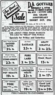 My grandfather Daniel was the eldest of five brothers (Daniel, Louis, John, Herman, Jack) who came from Russia in the 1890's and early 1900's. After establishing themselves in Philadelphia, in the “rag” business they brought their parents Samuel and Pearl Gottlieb to this country. My great-grandfather Samuel had no trade or saleable skills spending his time in religious study. There are stories about my great-grandmother suggesting that she would dive off and swim around the Steele Pier in Atlantic City. I cannot verify this tale, but several of the older members of the family have stated that it is true. My grandfather bought a farm in Porchtown, N.J. and subsequently started the meat business in Camden. Stores in Pennsgrove and Mt. Holly were run by my uncles Gerald and Jim respectively. Since it was the responsibility of the eldest to help the family get their start, as many as twenty-three family members worked in the meat business at one time. My great-uncle Lou (Daniel's youngest brother) made and lost large businesses before finally successfully settling in Charlotte, N.C. in the Army-Navy surplus business with more than twenty outlets in the South. Each time fate would deal Lou and Cele (his wife) a financial blow, they would return to Camden and the meat business on Mt. Vernon Street before setting out again. I remember coming in to work each day after school and during vacations and summers accompanying my father to the stockyards in Lancaster, PA, and to the livestock auctions in Mt. Holly and “Cowtown” NJ. The retail part of the business boasted many loyal and colorful customers sharing the same South Camden origins, but whose careers markedly diverged. It was an experience to see these customers, many of whom are listed elsewhere in your website, chatting in front of the long line of meat cases. Judges, senators, doctors, principals and reputed mob bosses all seemed to declare this neutral territory. I remember well a robbery occurring in the early 1960’s resulted in the cash taken on Saturday night being deposited on the front step of our home on Marlton Ave. on Sunday morning. My dad once asked customer, a Mrs. Teffeau, how long she had been shopping at Gottlieb’s. Her reply was that she was a “new bride” when she started and had just celebrated her 50th wedding anniversary. The “business” served a first job for many, including several immigrants surviving the Holocaust like “Sam” and “Isaac” whose family members were not so fortunate. Father, son and sometimes grandsons worked in “the business” such as Bob and Henry Edmondson and John DeFelice, his son Pat and his grandson.