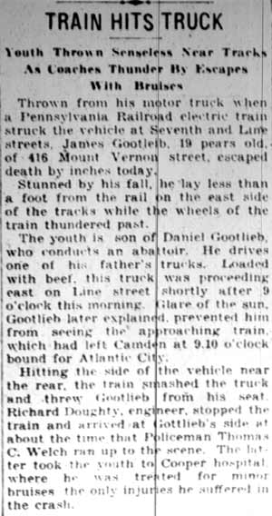 DANIEL A. GOTTLIEB was born in Russia on August 18, 1882. He came to America in 1890, After marrying his wife Fannie, he lived for a time in Pennsylvania, where daughter Essie and son James were born in 1907 and 1909, respectively. By 1912 the Gottliebs had come to New Jersey, and in October of 1916 Daniel Gottlieb opened his butcher shop. Six more children followed, Anna, Leon, Jean, Gerald, Leah, and Jeanette. The family had moved back to Philadelphia by 1918, and were still there in January of 1920, but would return soon to Camden and put down permanent roots. By 1930 the butcher shop and the Gottlieb family were on the 400 block of Chestnut Street in South Camden, a block of many ethnicities, Jewish, Italian, and Black, among others. The shop was at 413, while the family resided at 411 Chestnut. Oldest son James was already in the business, driving the delivery truck. In February of 1928, he had a close call when his truck was hit by a train. By 1936 the business had grown, and the D.A. Gottlieb business was in a large building around the corner, at 404-416 Mount Vernon Street. Daniel Gottlieb eventually brought his two other sons, Leon and Gerald, into the business. Like many other Jewish business people in the late 1930s and 1940s, the Gottlieb family moved to East Camden. The 1947 Camden City Directory shows Daniel A. Gottlieb at 2521 Baird Boulevard, Gerald at 625 Randolph Street and Leon at 480 Randolph Street. James T. Gottlieb had moved to Mt Holly. Leon Gottlieb and family moved to 620 Marlton Avenue by the fall of 1956. The 1970 New Jersey Bell Telephone Directory shows the Gottlieb still in East Camden. Daniel Gottlieb passed away in February of 1971. The Gottliebs still had their business at 416 Mount Vernon Street as late as 1977, and Leon Gottlieb still resided at 620 Marlton Pike in that year. Gerald Gottlieb had moved to 4001 Myrtle Avenue. Eventually Gerald and Leon would move to nearby Cherry Hill. Leon Gottlieb passed away March 23, 1992, Gerald on October 21, 1998. |