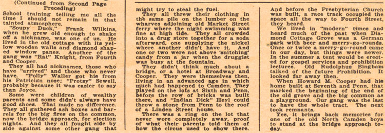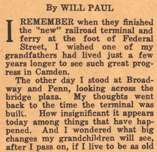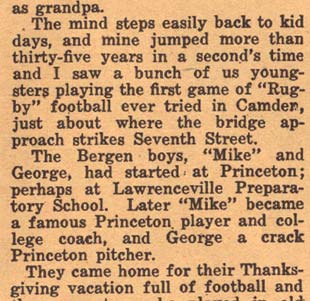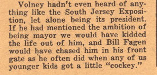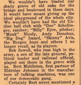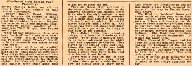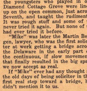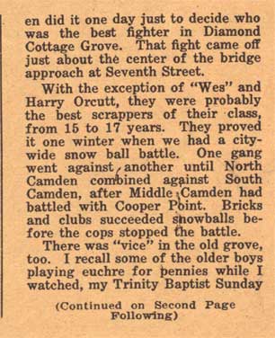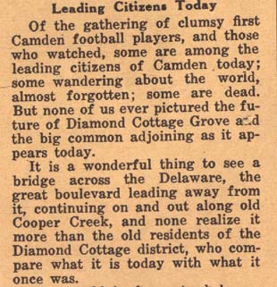In 1926, Will Paul wrote this article for a special Sesquicentennial Exhibition section published by the Camden Courier on July 5th. Many of the boys who played there and who are mentioned in the article below went on to be leading citizens of Camden, including Volney Bennett, Martin Bergen, and Albert C. Middleton. Other leading citizens of the time mentioned are Dr. E.A.Y. Schellenger Sr., Cooper B. Hatch, , and General William Joyce Sewell. Read on for a peek into a bygone era rarely seen or heard of today. |