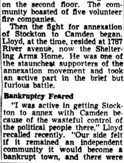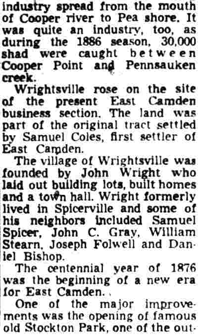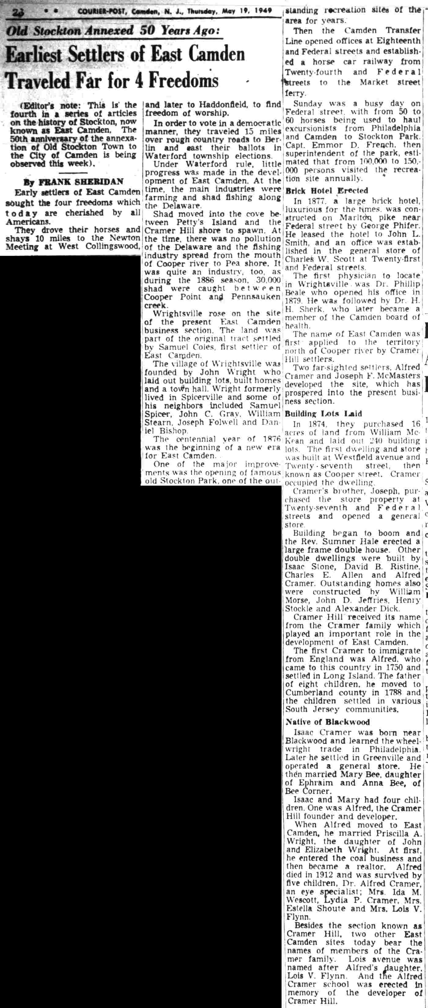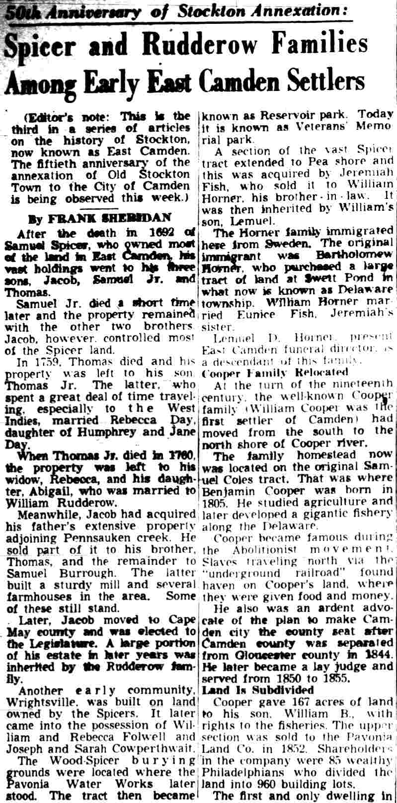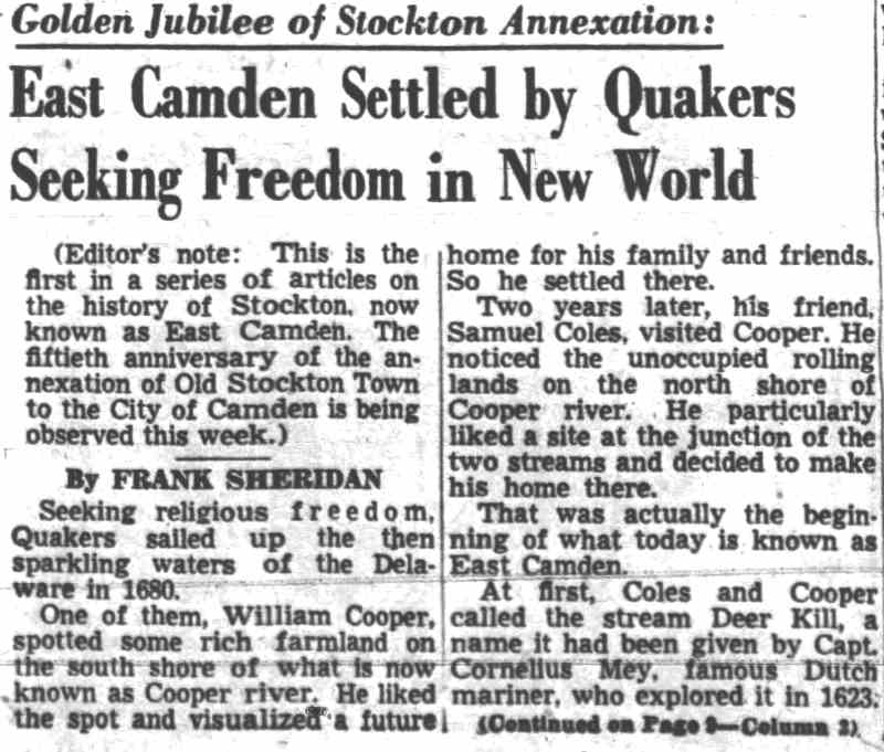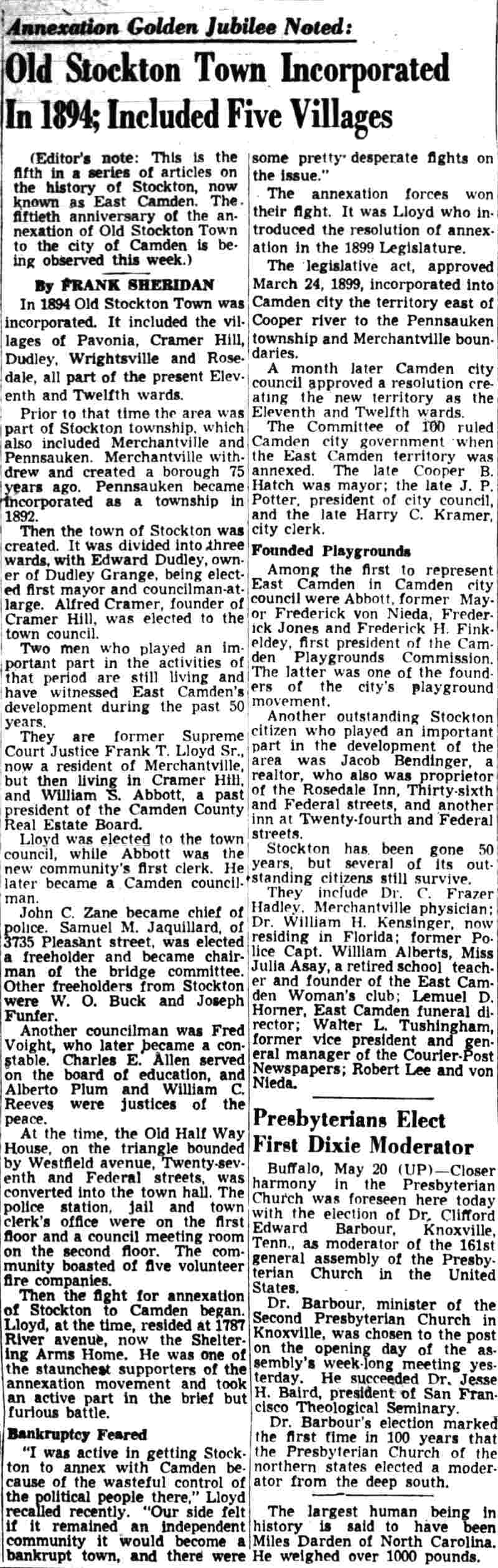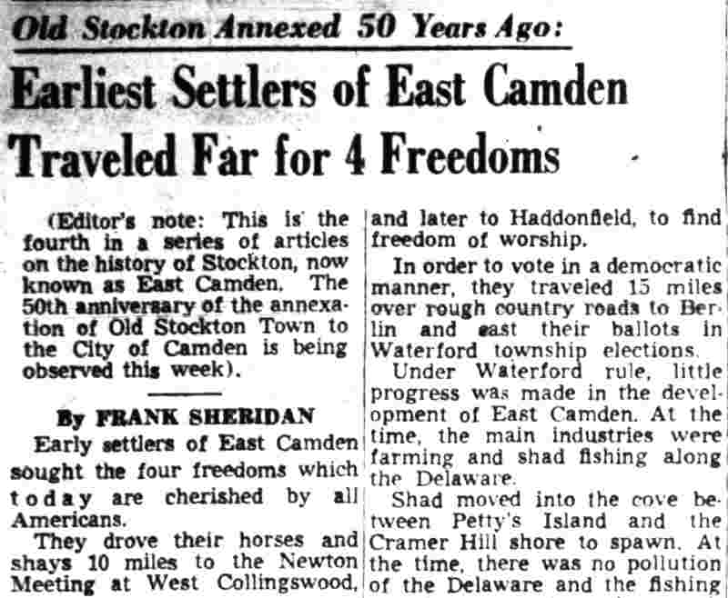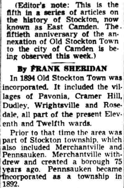In May of 1949 veteran newspaperman Frank Sheridan of the Courier-Post wrote a five-part series in honor of the 50th anniversary of the annexation of the Town of Stockton by Camden, which brought all the land north and east of the Cooper River into the city… what we know today as East Camden and Cramer Hill. Phil