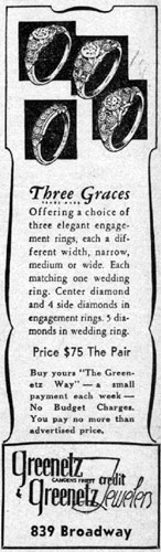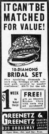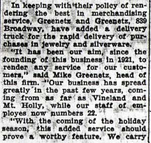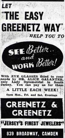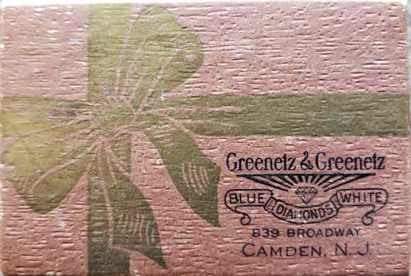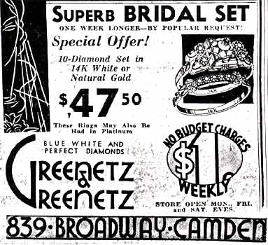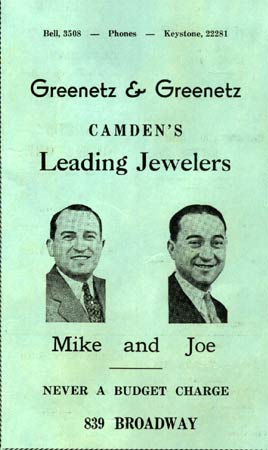 Michael Greenetz was already managing a jewelry store at the time of the 1920 Census. In 1921 the brothers were partnered with Abraham Pelicoff in a jewelry store which by 1928 was at 833 Broadway. By 1930 Pelicoff had relocated to Atlantic City, where he operated a hotel. Michael and Joseph Greenetz remained on Broadway, moving their jewelry store to 839 Broadway by the mid-1930s. The store was still open at that location through the fall of 1956. Michael Greenetz passed away on August 13, 1958, and Joseph Greenetz died January 17, 1959. Their business did not survive them, and was not listed in the October 1959 New Jersey Bell Telephone Directory. The Greenetz family remains in the jewelry business today, at 812 Haddon Avenue in Collingswood NJ, trading under the name of Ellis Antiques and Jewelry. A son of Michael Greenetz, Dr. Harry R. Greenetz, practiced medicine in the Chews Landing section of Gloucester Township NJ for many years, until his passing in 1997. |