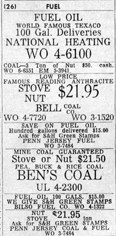 We had a coal bin in the front of our house at 152 Eutaw Avenue. We bought our coal from the Pavonia Coal Company. Depending on Dad's budget, we would get one half ton or one ton delivered. Some time in the early '50s we switched to gas heat.