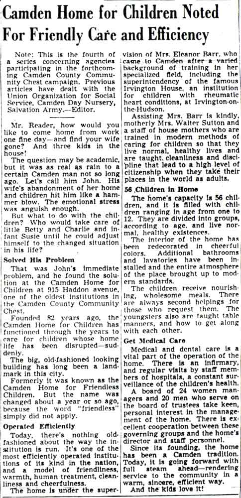 Home for Children. The need had continued to grow so much that the Board acquired 8.5 acres of land at Kaighn's & Vesper Avenues, hired architects to plan three two-story buildings in a campus setting, and launched a fundraising campaign in 1957/58 to raise about $486,000 needed after sale of the Haddon Ave property to complete the new facility. Cecil Bentley was the President of the Building Fund Committee, and Bryant W. Langston was General Chairman of the fundraising drive. The institution had one goal, and that was to provide the proper shelter and care for children who were abandoned, neglected, misguided, and lacked the proper medical needs and educational background. The idea has always been to prepare many of these adolescents for adulthood (T. Bergbauer, Courier-Post, 9/14/08). The funds were raised and the campus built, with the advice of experts in Child Welfare, so that each of the 6 floors would house only 12 children in a “cottage plan”, and the children would have the feeling of being in a home. Changing Priorities with the Times Known as an organization that has had its doors open to the community since 1865, The Camden Home for Children is truly an historic institution that has drawn in many dedicated citizens over the years. Making room for children and maintaining safe conditions was the organization’s main priority. Photographs of this era show children at church and Sunday school and in moments of grace before meals. The pictures shed light on the spirit of the organization, as it opened its doors to all children, regardless of background. The Camden Home for Children is a community institution, operates as non-profit, and has never been owned or operated by the city or county. As time went on, The Camden Home for Children continued to help those in need of a better life. Some came and left more quickly than others, but the organization had the same goal for all who walked through its doors. After moving from Haddon Avenue to Kaighn Avenue across from Farnham Park in November, 1960, the new $750,000 facility gave way to what was expected to be a better haven for children with less overcrowding and the ability to properly handle as many as 75 children at a time. At that point it was estimated the Home had served about 15,000 children. At the time of the closing of the facility in 1979, there were reported to be 31 state-referred, emotionally disturbed, inner city boys between the ages of 9 and 16 housed there. The next nineteen years allowed The Camden Home for Children to provide the necessary shelter for those in crisis, to accept referrals and subsidies from government funding, and complete a merger with the Society for the Prevention of Cruelty to Children that created a new title – The Camden Home for Children & SPCC. Finding Yet Another Role In 1979, after 114 years of this tradition and largely because of state underfunding for those placed in the residential facility, the Board felt compelled to vote to close the facility. Without increased state funding, The Camden Home and many other residential facilities in New Jersey, were running large deficits and could not maintain the financial needs to stay open. The Courier-Post Editorial dubbed the Home “one of the city’s outstanding institutions over a long period of years” (T. Bergbauer, Courier-Post, 9/14/08). And it was said to be “one of the most efficiently operated institutions of its kind in the nation and a model of friendliness, warmth, humane treatment, cleanliness and cheerfulness.” Senator Cowgill, a member of the Board, led a group wishing to close the Home permanently and give its money to the courts. Dr. John (Jack) Breakstone was the Executive Director at that time, and David A. Stedman was President of the Board. They had other ideas. With the support of a majority of Board members who remembered the care the Home had once provided for Civil War orphans at one time and how it had shifted its role over the century to providing residential care for troubled boys, they believed the Home had a useful place in service to youth, even if its direct residential care of troubled youth would cease. And, although the facility itself closed on November 28, 1979, and the State of New Jersey was forced to find new placements for the many emotionally disturbed inner-city boys who were served by the Home, the Board decided to control its funds and continue in a different direction. The facility was sold to the Camden Board of Education for one dollar for use of the school administration, and in 1980 The Camden Home for Children and SPCC became incorporated as a nonprofit foundation. Led by Dr. Breakstone, the Board assumed the task of helping to bring together other New Jersey youth agencies into a consensus bloc to lobby the State for more reasonable regulations and higher subsidies for its referrals. After this was successful, through existing endowments and return on investments over the years, the Camden Home began to award grant money to agencies and institutions that continue to provide services for children who are in crisis, primarily in the Camden, Gloucester and Burlington County area, but more recently extending to all of South Jersey. In recent years, under the guidance of Executive Director John Powell, the scope of assistance was expanded to assist the “aging out” population, those from 19 through 22. These young adults would otherwise have been denied full support in the transition to independence. Continually reexamining its role in service to youth, The Camden Home has and will continue to remain dedicated to all youth in need. ************************************************ Works Cited Bergbauer, Thomas (2008, September 14). Camden Home for Children was a haven for 114 years. Courier-Post, p. 3C. Lieberman, Gail (1979, November 29) Children’s Home shuts doors Courier-Post |