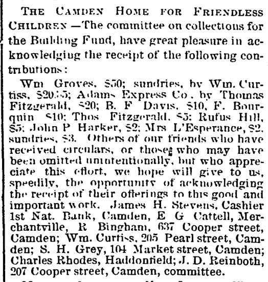 THE CAMDEN HOME FOR FRIENDLESS CHILDREN is an institution located on Haddon Avenue, above Mount Vernon, the object and design of which is to afford a home, food, clothing and schooling for destitute friendless children, and, at a suitable age, to place them with respectable families to learn some useful trade or occupation. The home was established and is conducted by a corporation. The charter, granted by the State Legislature, April 6, 1865, sets forth that "Whereas, a number of citizens of this State have formed an association for the laudable and benevolent purpose of educating and providing for friendless and destitute children; and whereas, the Legislature of this State is willing to encourage such purposes; therefore, Be it enacted by the Senate and General Assembly of the State of New Jersey, that Matthew Newkirk, Elijah G. Cattell, James H. Stevens, George W.N. Custis, J. Earl Atkinson, Joseph C. De La Cour, Joseph D. Reinboth, Robert B. Potts, Jesse W. Starr, Edmund E. Read, John B. Graham, Benjamin H. Browning, Solomon M. Stimson, Philander C. Brinck, John Aikman, Thomas P. Carpenter, Elisha V. Glover, Thomas B. Atkinson, Isaac L. Lowe, Peter L. Voorhees, and their associates, be and they are hereby incorporated and made a body politic in law and fact, by the name, style and title of 'The Camden Home for Friendless Children.'" |