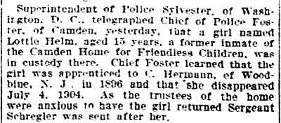 The police ambulance removed the following residents of South Camden to the hospitals late on Saturday afternoon: West Jersey Homeopathic- William Perry, aged 62 years, 1725 Fillmore Street; Albert Biron, 24 years old, 1108 Baring Street. Cooper Hospital- Mrs. Edna Rosenfelt, aged 23 years, 575 Washington Street; Margaret Radcliffe and John Carella, inmates of Children's Home. |