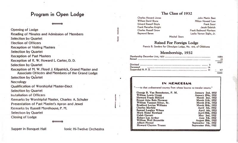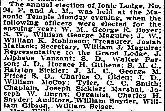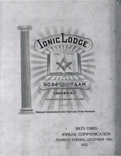 The Ionic Lodge, No. 117 Free & Accepted Masons was originally constituted as the Corinthian Lodge in 1868. Camden Lodge, No. 15, was the "mother" lodge of Corinthian. The lodge was re-constituted as the Ionic Lodge No. 94 on February 23, 1869. Over the years, many of Camden's leading citizens were members. Ionic Lodge members included George A. Williams, Frank S. Fithian, J. Hartley Bowen, Charles T. Murray, Robert K. Draper, George E. Boyer, Wallace M. DuBois, Frederick Himmelein Jr., William E. Cross, William S. Casselman, William A. Butcher, Josiah Matlack, J. Alpheus Vansant, Dr. George T. Robinson, Henry Fetters, John Foster, Edward West, Sidney P. McCord Sr., Charles M. Ferat Sr., Albert C. Jones, James Wilson, james h. long and william vannest silver. As with many other Camden groups, businesses, and individuals, the Lodge moved to the suburbs after World War II. On December 15, 2004 the Ionic Lodge No. 94. along with Trimble Lodge No. 117 and Universal Lodge No. 216 was reconstituted as USS New Jersey Lodge No. 62, Free & Accepted Masons, based in Cherry Hill, New Jersey. |