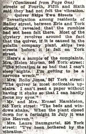 I am acquainted with a 93 year-old lady who as a young bride moved to Byron Street between 3rd and 4th Streets. She tells me that about 1935 or 1936 the Knox Gel plant was built between 4th and 5th Streets. Everybody that came from that neighborhood called it Knox Gel. To this day I will not eat Jello. I was born right around the corner on Bailey Street. Every few weeks on wash day Knox would have a problem with there combustion controls on there boilers and of course in the 40s and 50s everyone hung wash on the line in backyard. A lot of other wise prime and very proper hose wives had some very nasty things to say about Knox. |