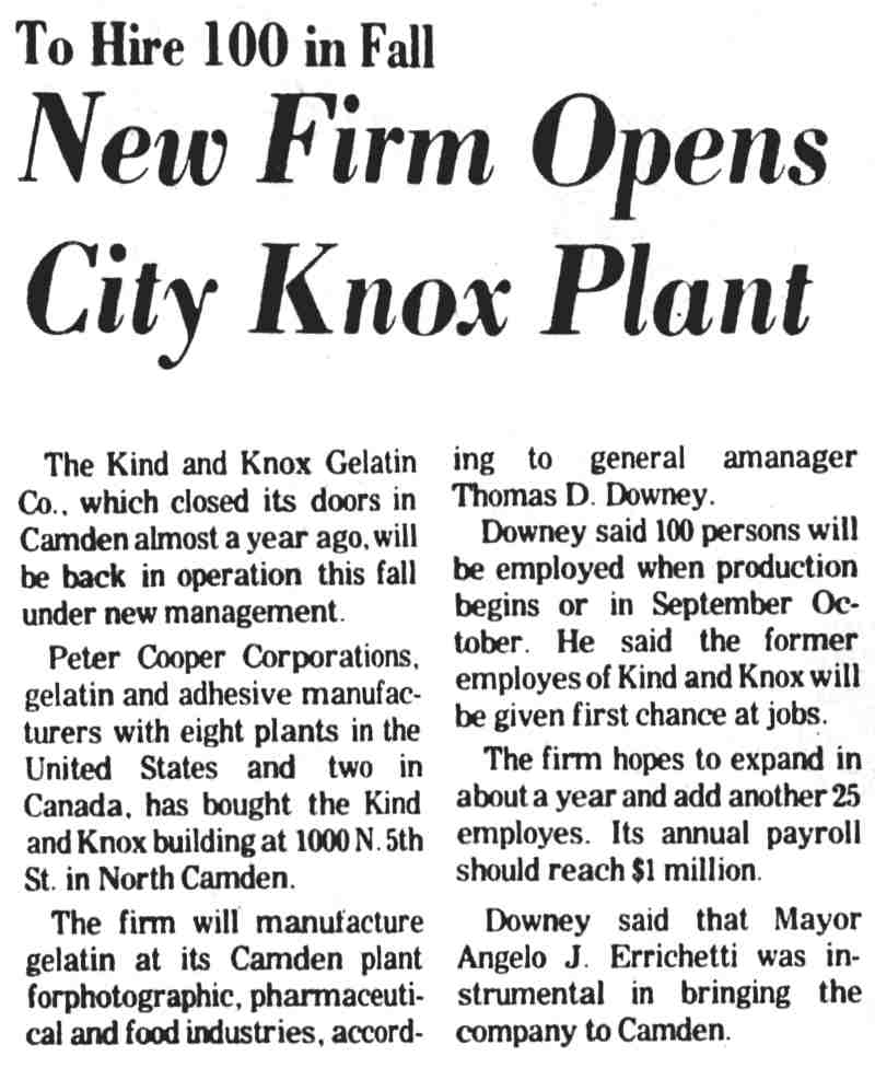 The Knox Gelatin Co., which specialized in the production of gelatin used in the food, photographic and pharmaceutical industries, started at 4th and Erie streets in Camden in the early 20th century and was originally known as the Landesman Co. The firm was later acquired by Maurice Kind, a German-born brewer who came to America in 1898. Maurice Kind bought into the business, which operated as the Camden Gelatin Company. Kind's son, chemist Paul Adolf Kind, became involved in the business after completing his education. Maurice Kind died in 1915, a few years after a major fire at the gelatin factory in 1912. The fire occurred during the early morning hours of January 30th. The blaze began on the first floor of a factory building at the Camden Gelatin Company at Fifth Street and the Delaware River, North Camden. Box 14 at Fifth and Erie Streets was pulled, also accompanied by a phone alarm. Flames lit up the night sky as second and third alarms were transmitted in rapid succession. Frozen hydrants seriously hampered arriving engine companies and firemen built bon fires under the hydrants to thaw them while other hydrants were sought. At least a dozen master streams surrounded the fire. Collapsing walls produced severe flying embers that started a blaze in the machine shop at the Camden Ship Yard and a third fire in the Troth Warehouse. Fireman Edward Finley of Hook & Ladder Company 1 was overcome by heavy smoke and removed from the scene unconscious. He was transported to West Jersey Homeopathic Hospital where he was revived. By 2 A.M., fire fighters had the fire under control. The gelatin plant owned by Kind and Landesman consisted of an office building and two, two-and-one-half-story factory buildings, all destroyed in the fire. Engine Company 4 remained at the scene until the afternoon, wetting down the smoldering ruins. Charles Knox bought into the business in 1916, and the firm was then known as Kind & Knox. Kind & Knox became a wholly owned subsidiary of Knox Gelatin in 1955; Knox itself, based in Johnstown, N.Y., was sold to the Lipton Tea Co. in May 1972, which in turn sold it to a German-owned company in 1992. In its day, Knox Gelatine was as much a presence in American kitchens, and in the culinary repertoire of American housewives, as Campbell's Soup is today. The Camden plant was a manor employer for many years in North Camden. City government and a local community group, the North Camden Land Trust, both have explored ways to redevelop the site, with lies just west of Pyne Point Park. As of the fall of 2003, action on this project has not commenced. |